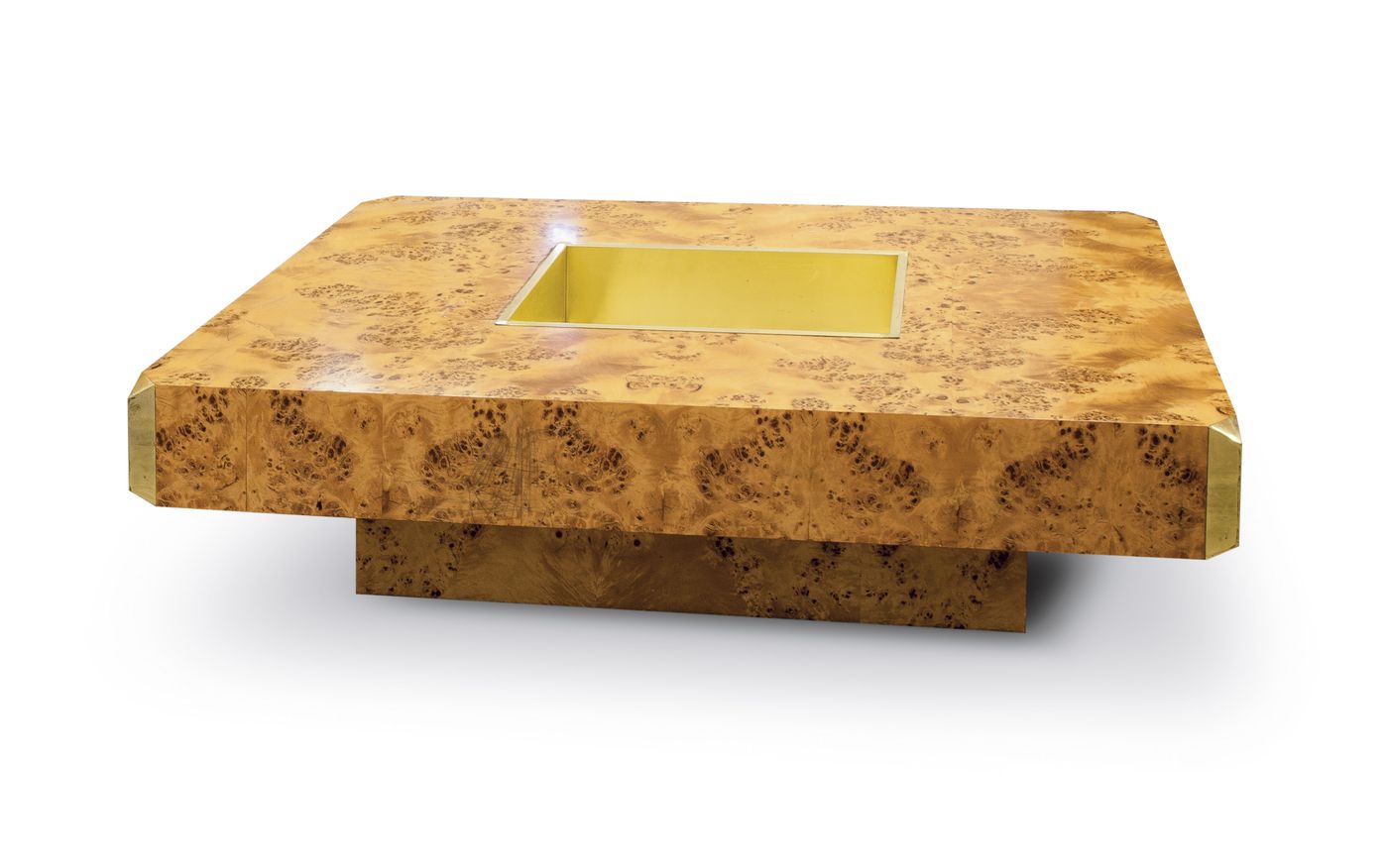 RIZZO WILLY - Tavolino contenitore rivestito in radica. Prod. Mario Sabot, 1973 circa. cm80x128. Bibl.: Casa Vogue n°19, marzo 1973 (versione rivestita in laminato plastico)
