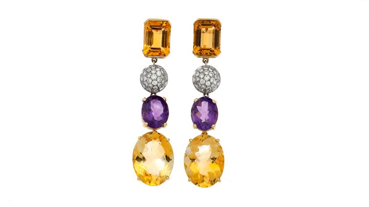 pendenti in oro giallo con quarzi citrini taglio rettangolare, ovale due ametiste taglio ovale e due semisfere con diamanti taglio brillante per totali ct 0,70 ca