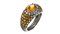 in oro brunito, sommità bombata, con al centro zaffiro giallo taglio ovale di ct 2,0 ca, circondato da diamanti taglio brillante per totali ct 0,60 ca e pavè di zaffiri taglio brillante per totali ct 3,20 ca