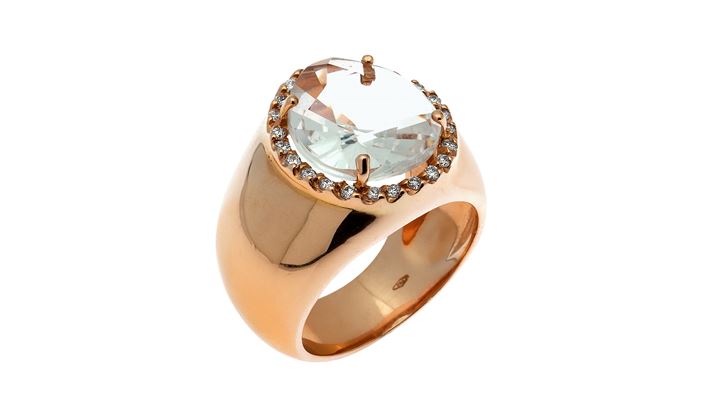 in oro rosa, a fascia, con al centro quarzo taglio a goccia, circondato da diamanti taglio brillante per totali ct 0,15 ca