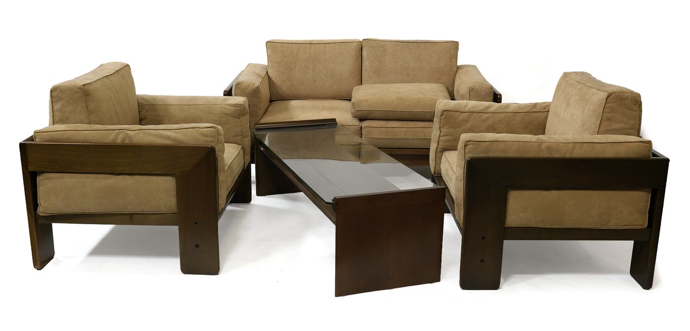SALOTTO Salotto composto da: Afra e Tobia Scarpa Bastiano Due poltrone e un divano a due posti in legno di noce con rivestimento in alcantara. Prod. Gavina 1960 Kazuhide Takahama Acca Tavolino in noce e cristallo. Prod. Gavina 1963 divano cm 80x151x90 poltrone cm 80x76x90 tavolino cn 40x130x49 Bibl.: Giuliana Gramigna, "Repertorio 1950-1980", Mondadori, 1985, rispettivamente pag. 153 e 195