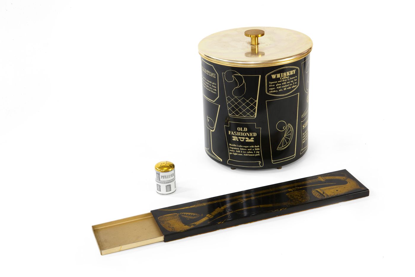 FORNASETTI PIERO Lotto di tre oggetti, composto da: - Scatola portasigarette in metallo, con cassetto anodizzato oro; coperchio serigrafato con decori "sillouette di pipe". Difetti. - Portaghiaccio in metallo serigrafato, fine anni '50, decoro "ricetta per cocktails". - Spargipepe in ceramica serigrafata. cm 40x9x1,5; diam cm 23, h 27; diam cm 4, h cm 6 Bibl.: B. Fornasetti ( a cura di), "Fornasetti. La bottega fantastica", Electa, 2009, pag. 510, tav. 318; pag. 484, n. 110; pag. 569, n. 19