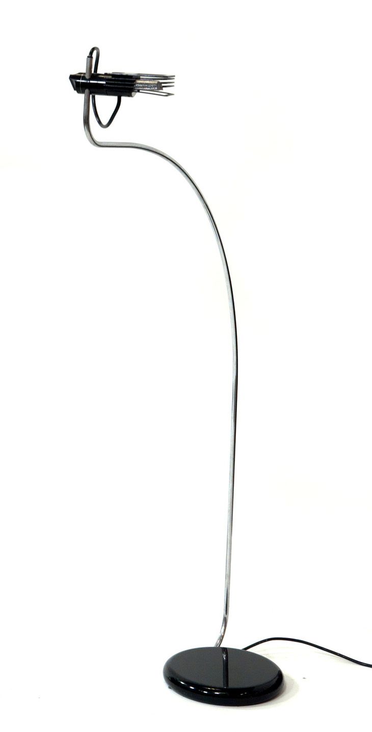 GECCHELIN BRUNO Wing Lampada da terra con dimmer a luce diretta, base in metallo verniciato nero. Stelo o arco cromato, riflettore orientabile e regolabile in altezza in materiale termoindurente. Presente al Museo d'Arte Moderna di Rio de Janeiro. Prod. Skipper 1973 h cm 138 Bibl.: www. studiogecchelin.it