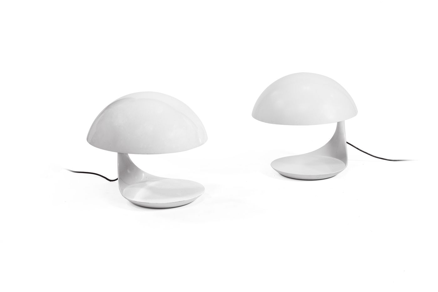 MARTINELLI ELIO Cobra Due lampade da tavolo a luce riflessa in resina bianca. Prod. Martinelli Luce 1968. cm 37x40 Bibl.: Giuliana Gramigna, "Repertorio 1950-1980", Mondadori, 1985, pag. 283.