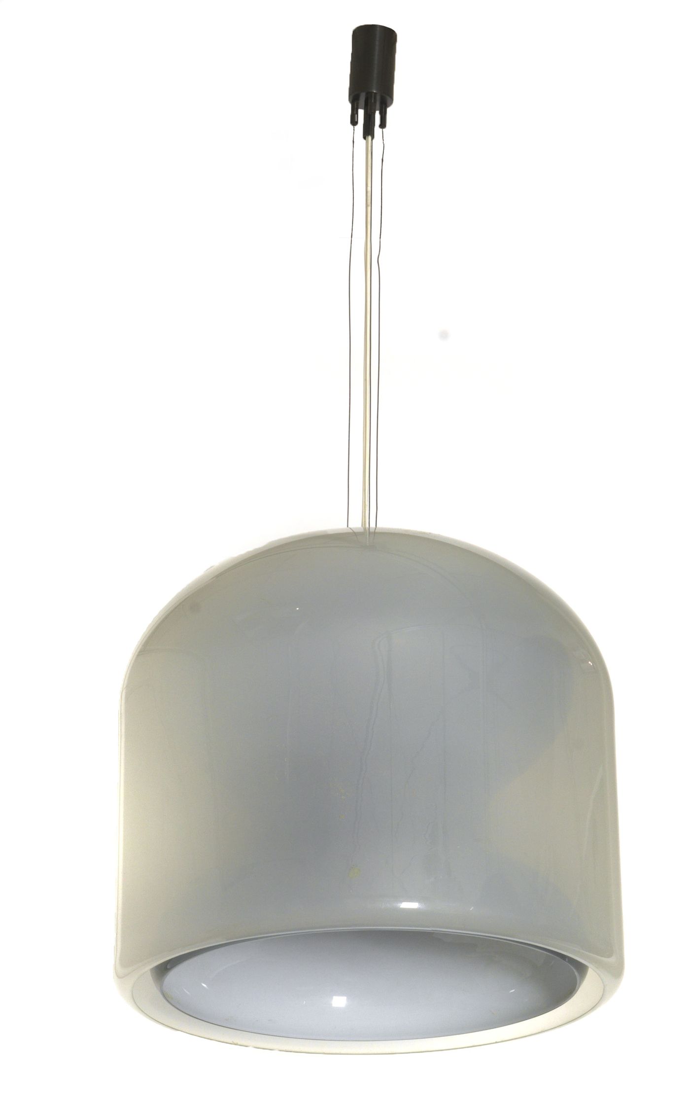CAPURRO E. Sospensione "forma nella forma" in vetro opalino e lattimo. Tige costituita da cavi d'acciaio. Prod. Vistosi 1965 circa. diam cm 45 Bibl.: G.Mariacher "Ivetri di Murano", Bestetti Arte 1967, p.206