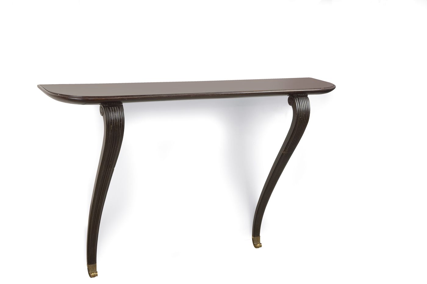 CONSOLE - Console in mogano con piano in vetro colorato. Puntali in ottone....