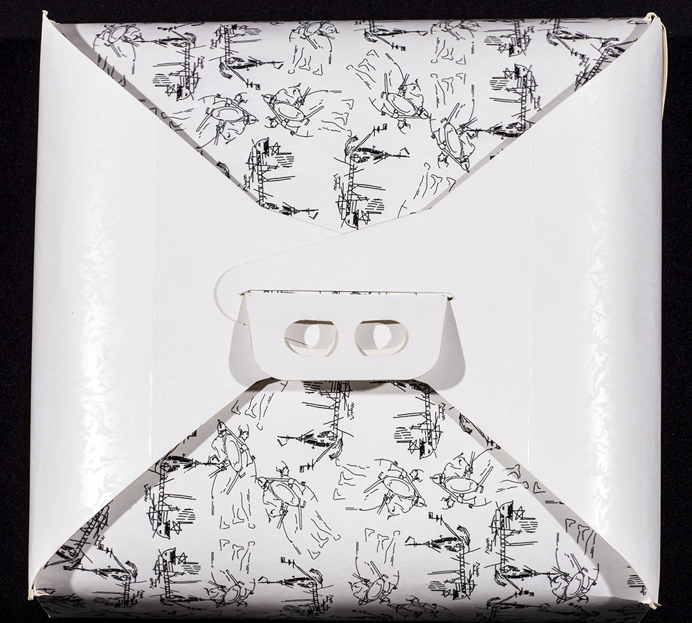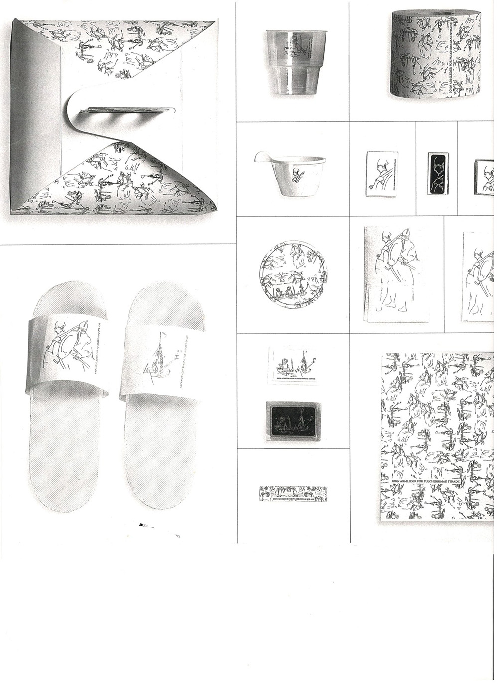 Multiplo composto da 13 oggetti a perdere (Scatola di cartone, Bustine di zucchero, Stuzzicadenti imbustati, Tazzina da caffè e bicchiere in plastica, Sottobicchieri, Tovaglioni, Fazzoletti e Ciabattine in carta, Cuffia per doccia, Sapone, Carta igienica e Scatola di fiammiferi, stampati con decori in bianco e nero ricavati da graffi, graffiti e segni presenti sugli affreschi di Francesco Floreani e Giambattista Tiepolo nella Sala del Parlamento del Castello di Udine della Regione Friuli Venezia Giulia)