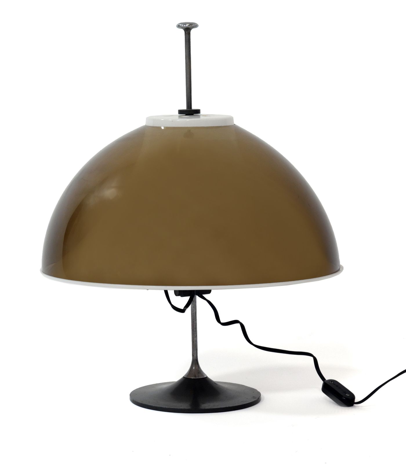 MARTINELLI ELIO Lampada da tavolo in metallo laccato e cromato. Diffusore in plexiglass opalino con cupola in plexiglass trasparente colorato. Regolabile in altezza. h cm 52 Bibl.: Domus 403, giugno 1963.