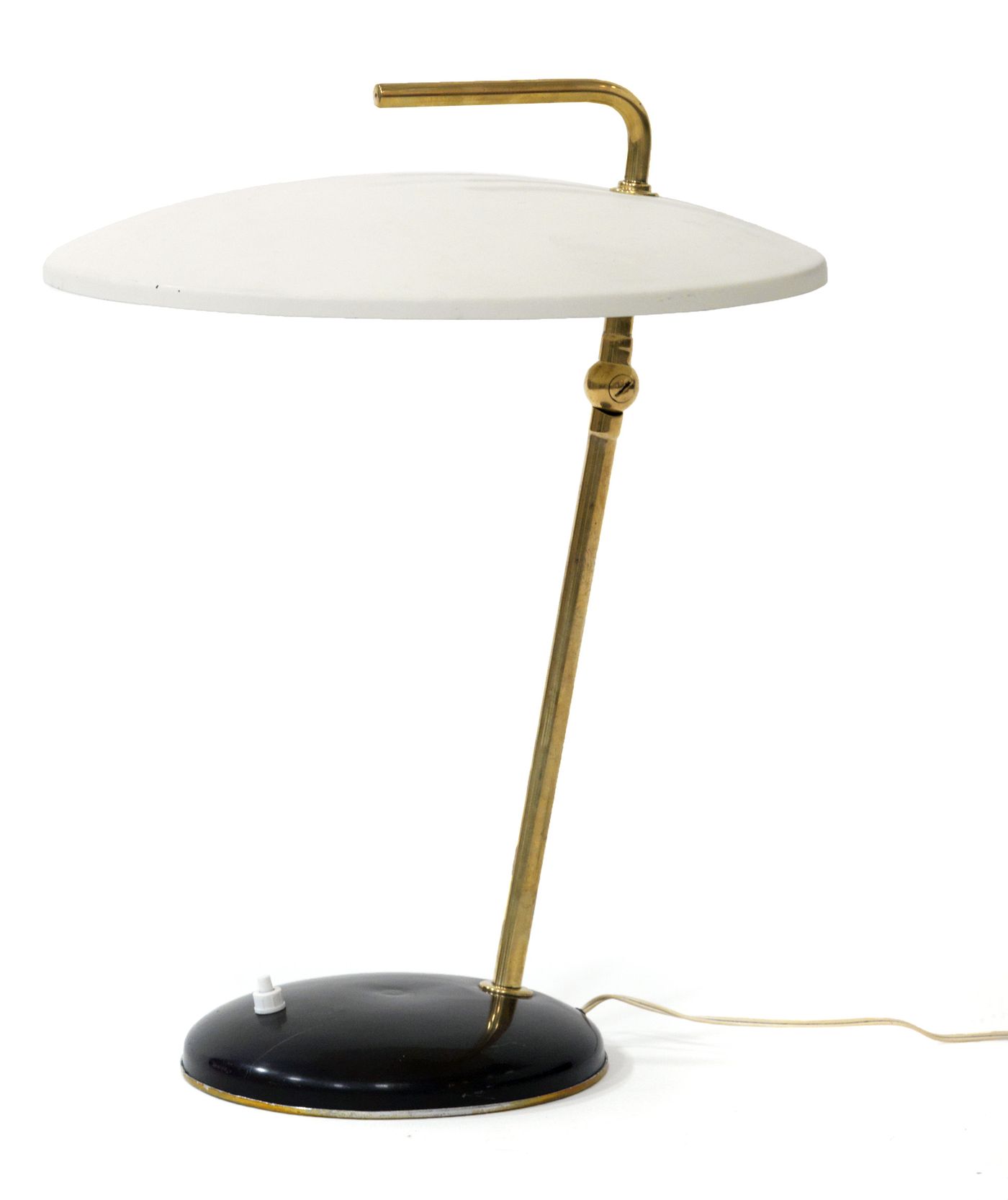 DIULGHEROFF NICOLAY Lampada da tavolo con impugnatura per il trasporto. Ottone zapponato e alluminio tornito in lastra e laccato 1938 h cm 43 Bibl.: Valeria Garuzzo “Nicola Diulgheroff architetto”, Marsilio 2005, pag. 134.