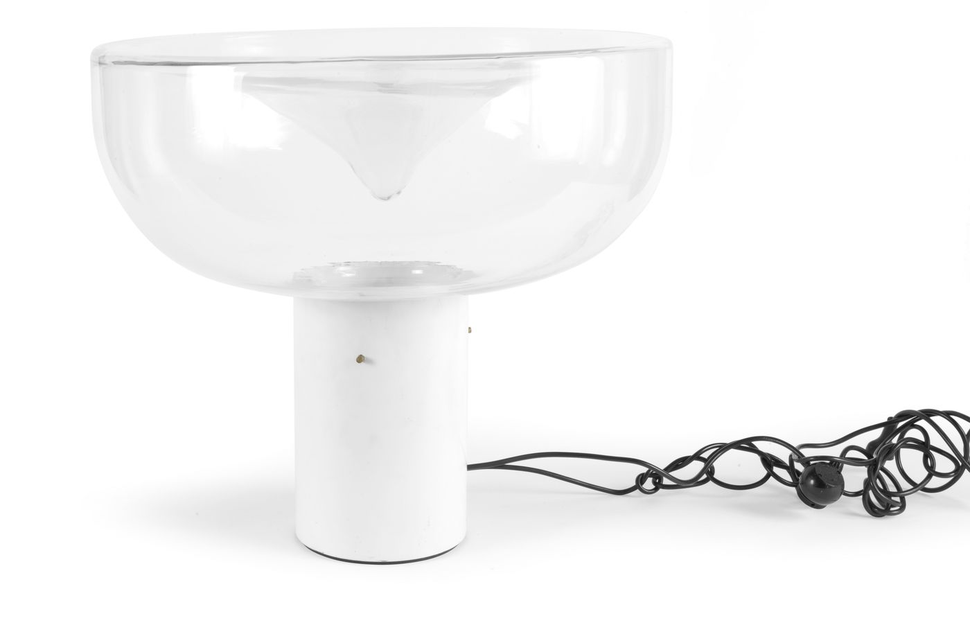 TOSO RENATO, MASSARI NOTI Aella Lampada da tavolo in vetro cristallo e base in metallo laccato. Prod. Leucos 1968 h cm 49,5 Bibl.: Giuliana Gramigna, "Repertorio 1950-1980", Mondadori, 1985, pag. 307. Copia della pagina del catalogo Leucos disponibile