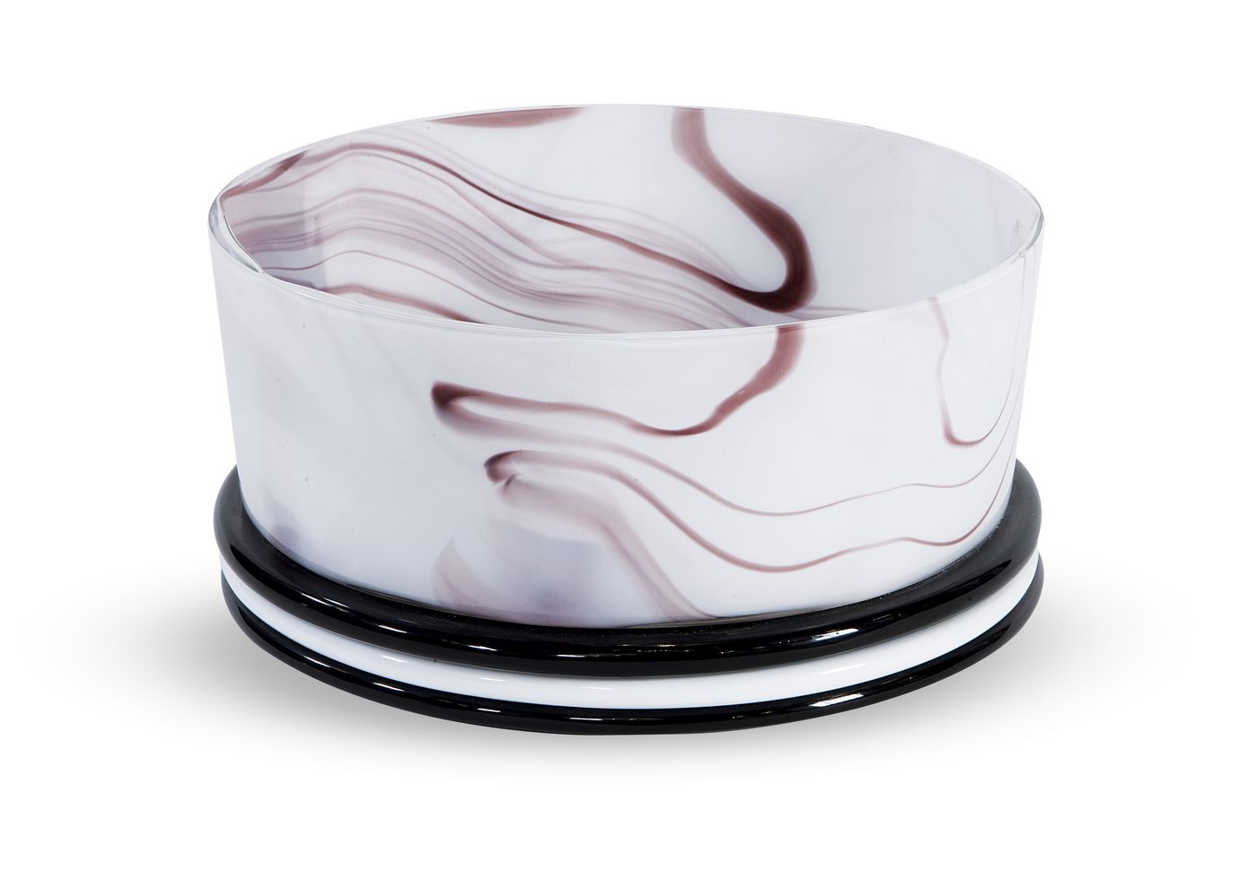 ASTI SERGIO Vaso in vetro opalino con striature viola. Base formata da tre dischi bianchi e neri alternati. Alla base inciso all punta di diamante S. Asti x Vistosi 7/39 h 13 diam 26,5
