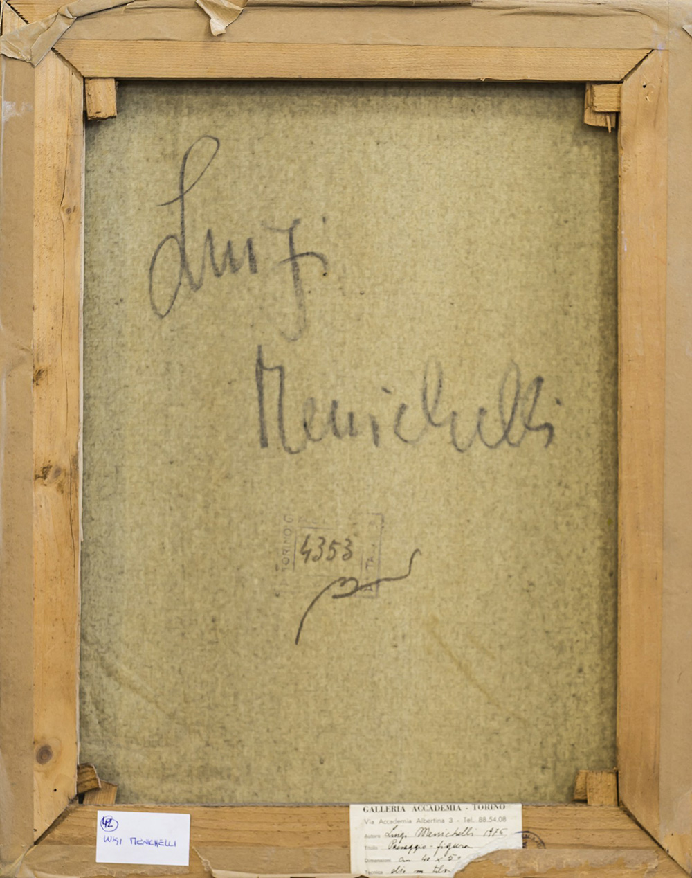 Timbro ed etichetta della Galleria d'Arte Accademia (TO) al retro con relativo numero d'inventario