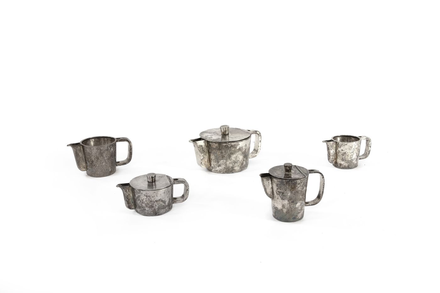 PONTI GIO Servizio in alpacca argentata. Prod. Krupp dal 1936. Quattro pezzi hanno anche il marchio Jolly Hotels CIATSA, un elemento è marchiato A. Missaglia e presenta alcune varianti. Esposto alla X triennale di Milano Particolarmente raro per la capienza dei pezzi, la teiera misura misura 12x22,5 e contiene cl 100. Bibl.: Laura Falconi, "Gio Ponti, interni, oggetti, disegni, 1920-1976", Electa, 2004, pag. 110.