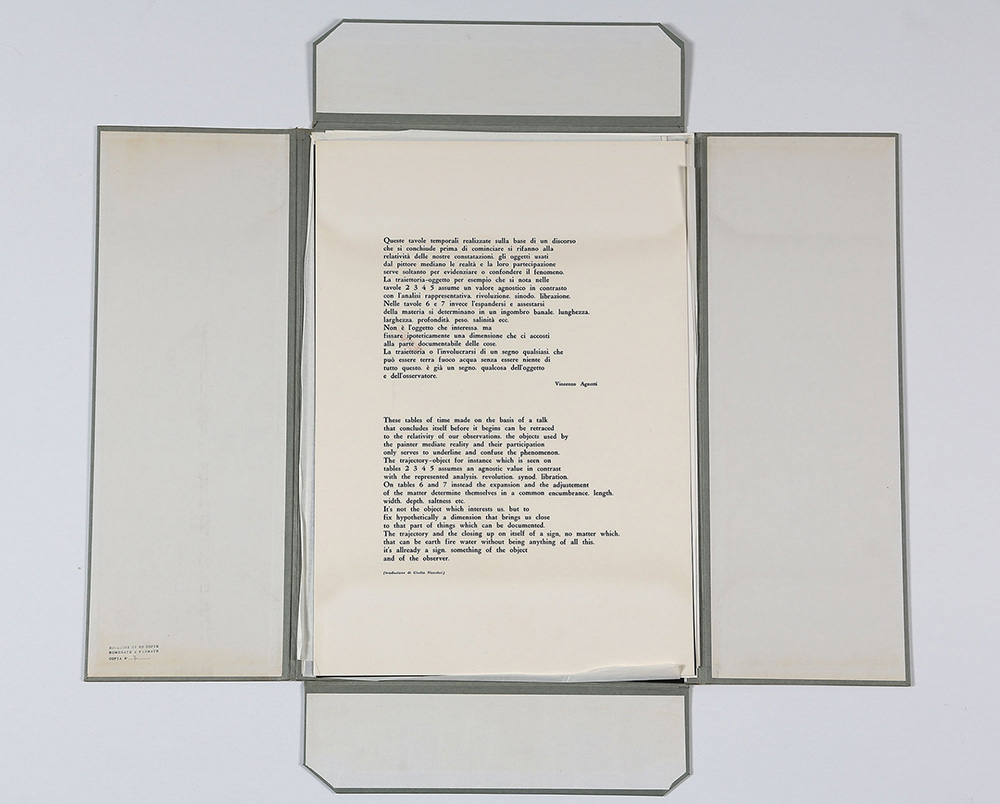 CLAUDIO PARMIGGIANI 1943 Sette tavole temporali, 1968 Cartella di 7 litografie, cm. 39,5 x 59,5 Firmate e datate in basso a sinistra Testo di Vincenzo Agnetti Cartella n. 7/50 Prov. Collezione Privata