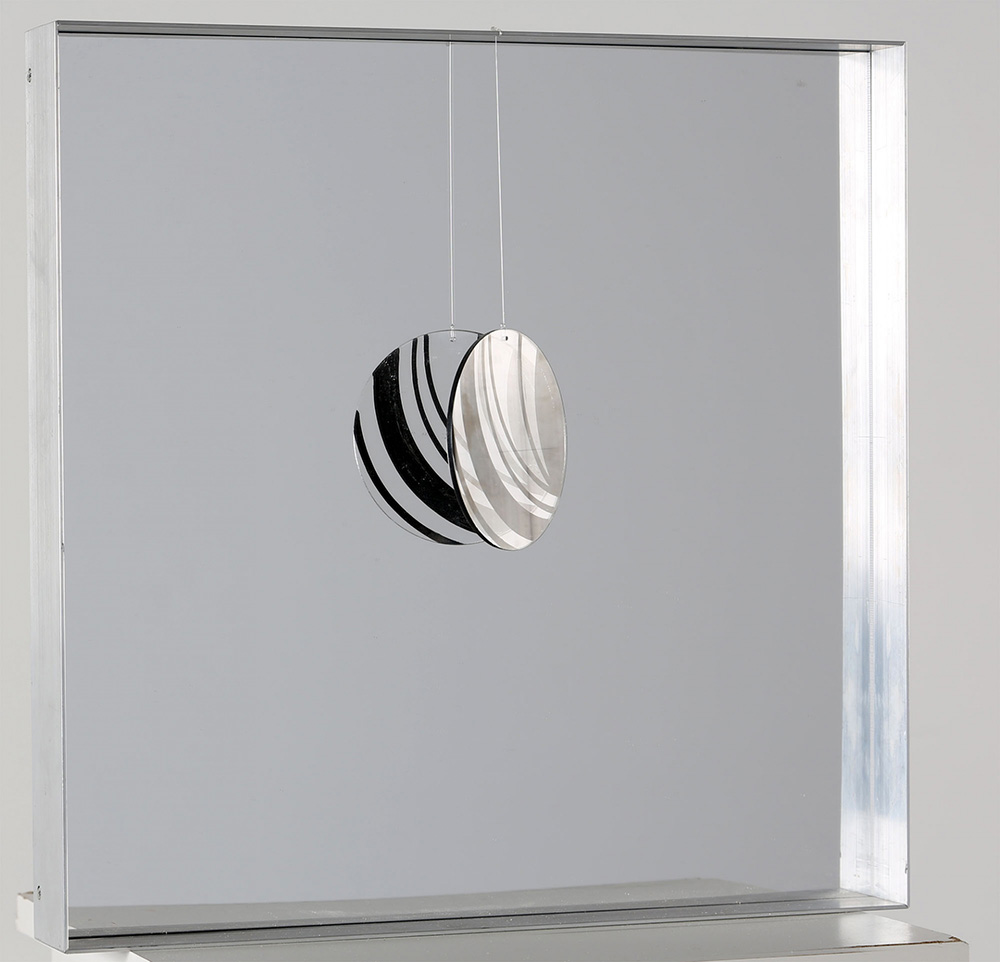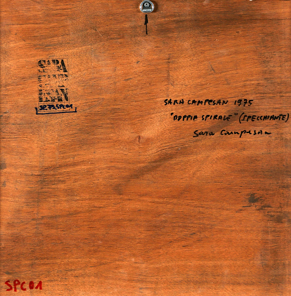 SARA CAMPESAN 1924 Doppia spirale (specchiante), 1975 Assemblaggio, plexiglass specchiante, plexiglass dipinto appeso ed alluminio, cm. 40,5 x 40,5 x 6 Firmato e datato sul retro Timbro dell'artista con numero d'archivio sul retro Prov. Collezione Privata