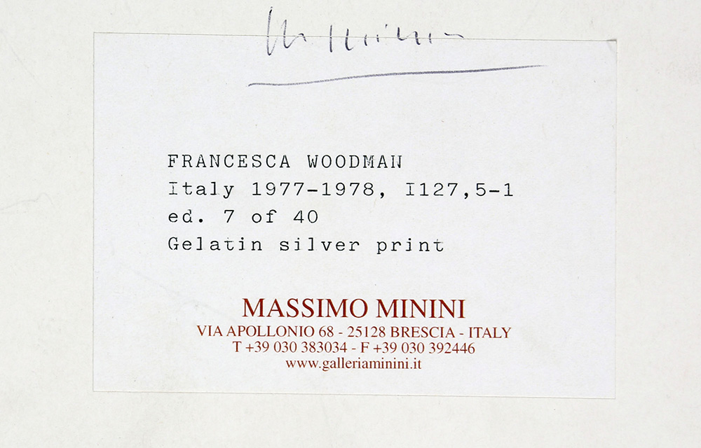FRANCESCA WOODMAN 1958 - 1981 Italy 1977 - 1978, I127, 5 - 1 Stampa alla gelatina ai sali d'argento, cm. 9,5 x 9,5 Firmato sul retro Opera n. 7/40 Etichetta Galleria Massimo Minini Brescia sul retro Prov. Collezione Privata