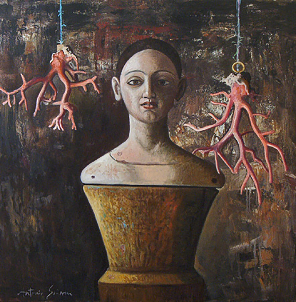 Antonio Sciacca "Busto ligneo con coralli rossi"- Olio su tela - cm 80x80 - Firma dell'artista in basso a sx - Autentica su foto