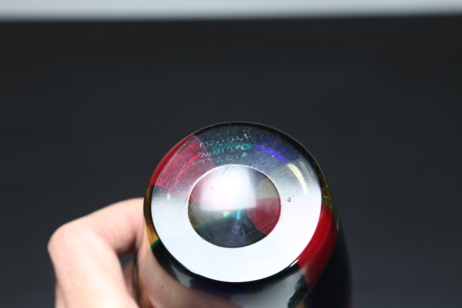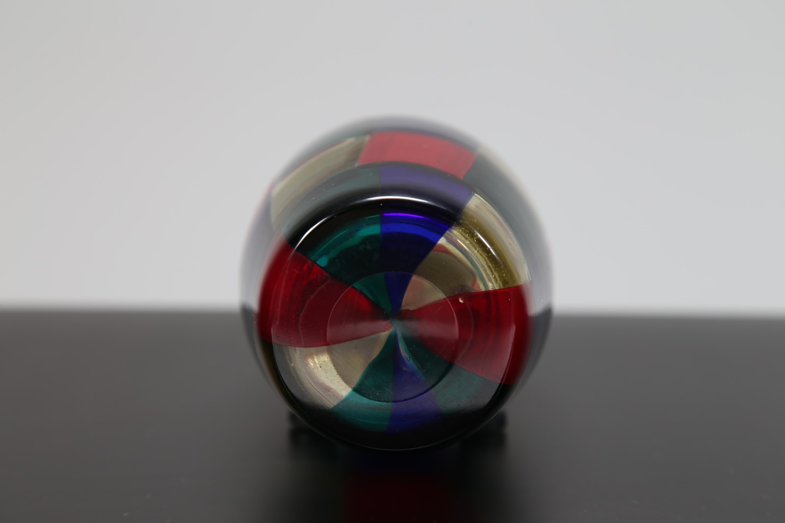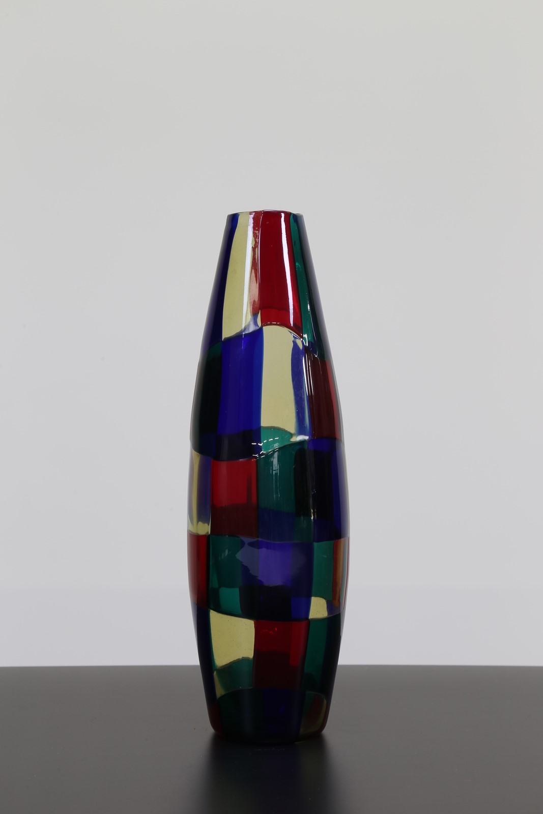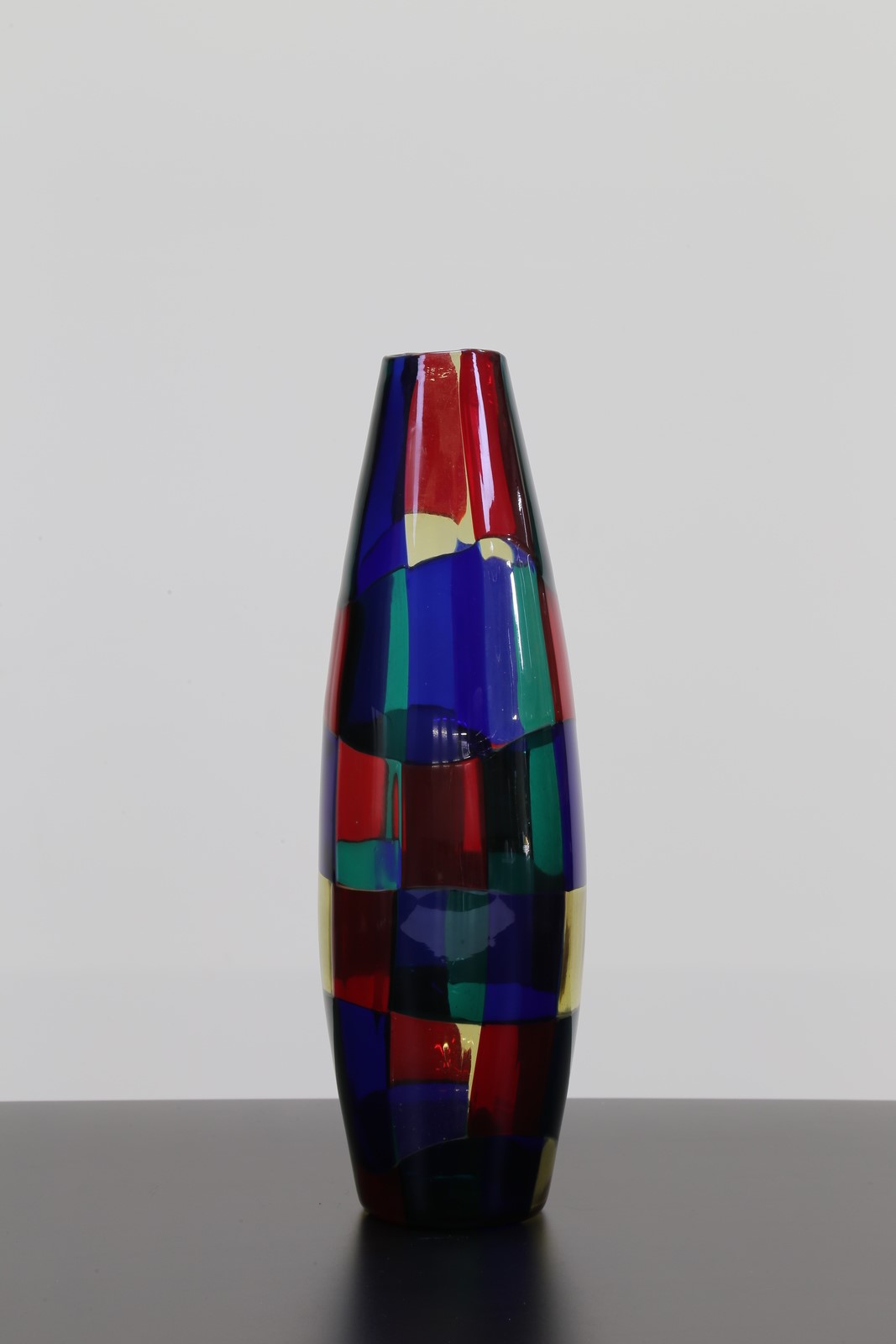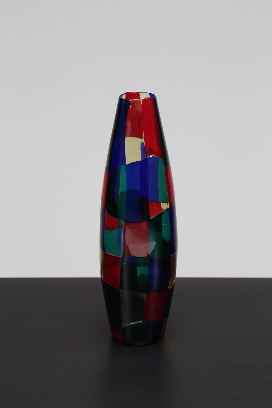 BIANCONI FULVIO (1915 - 1996) Vaso in vetro pezzato mod. Parigi, per Venini, anni 50. Pubblicazioni; Venini Catalogo Rosso, mod. 4911 . . Cm 10,00 x 28,50 x 10,00. Firma alla base