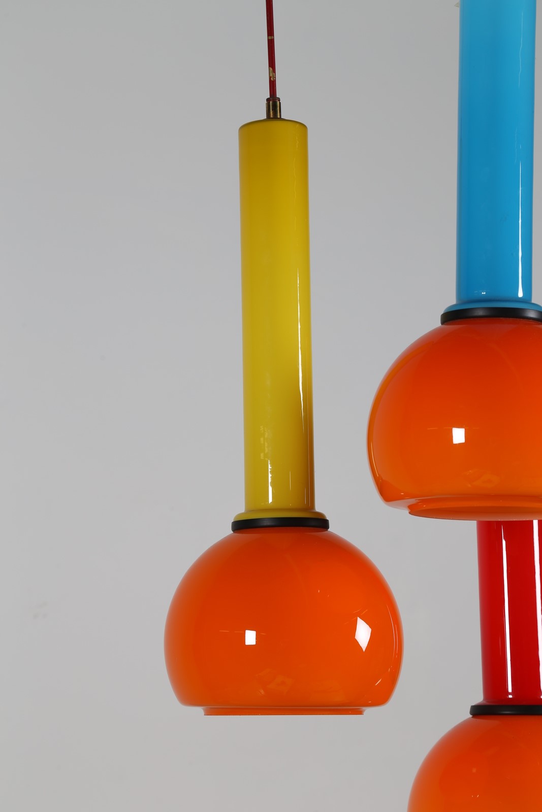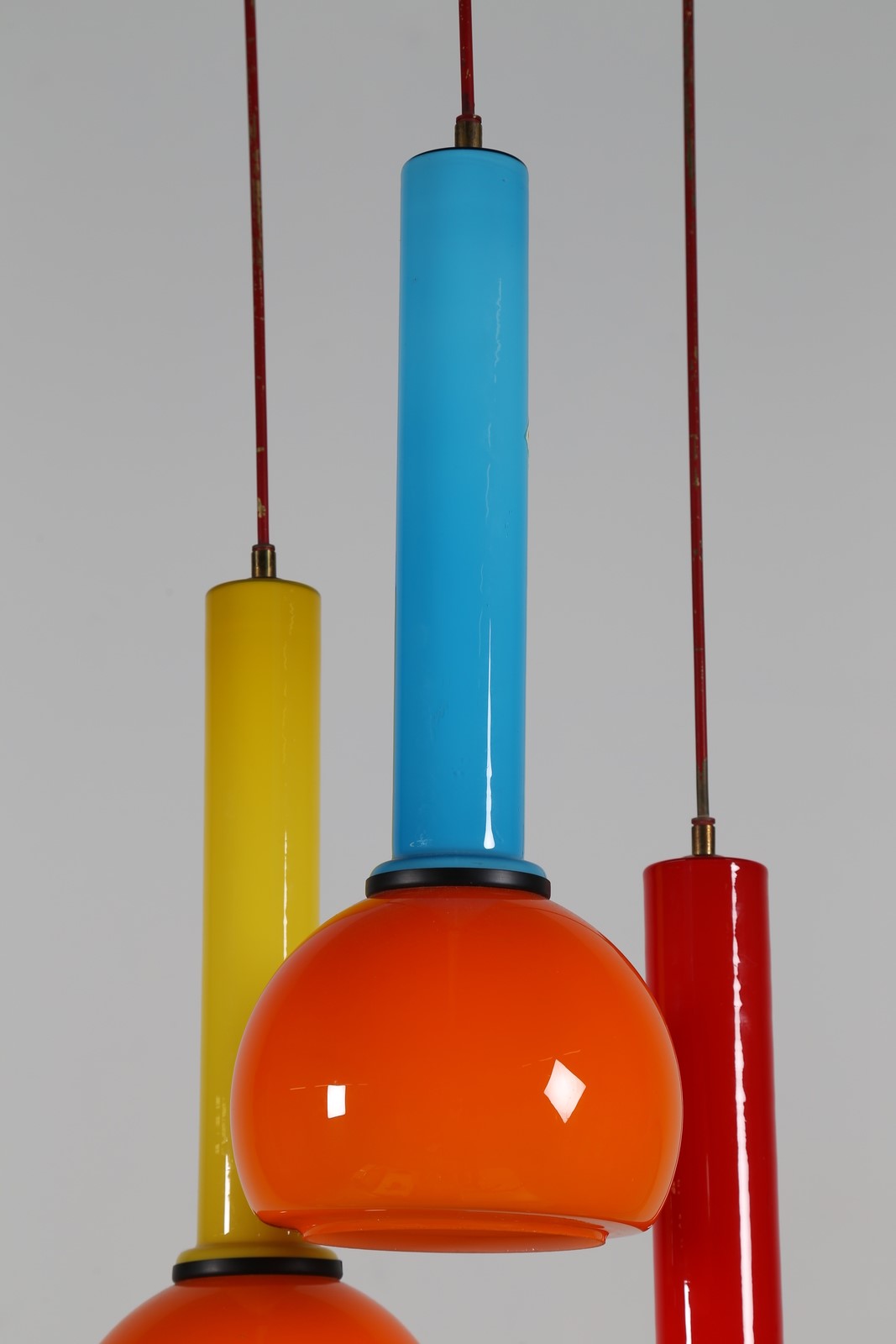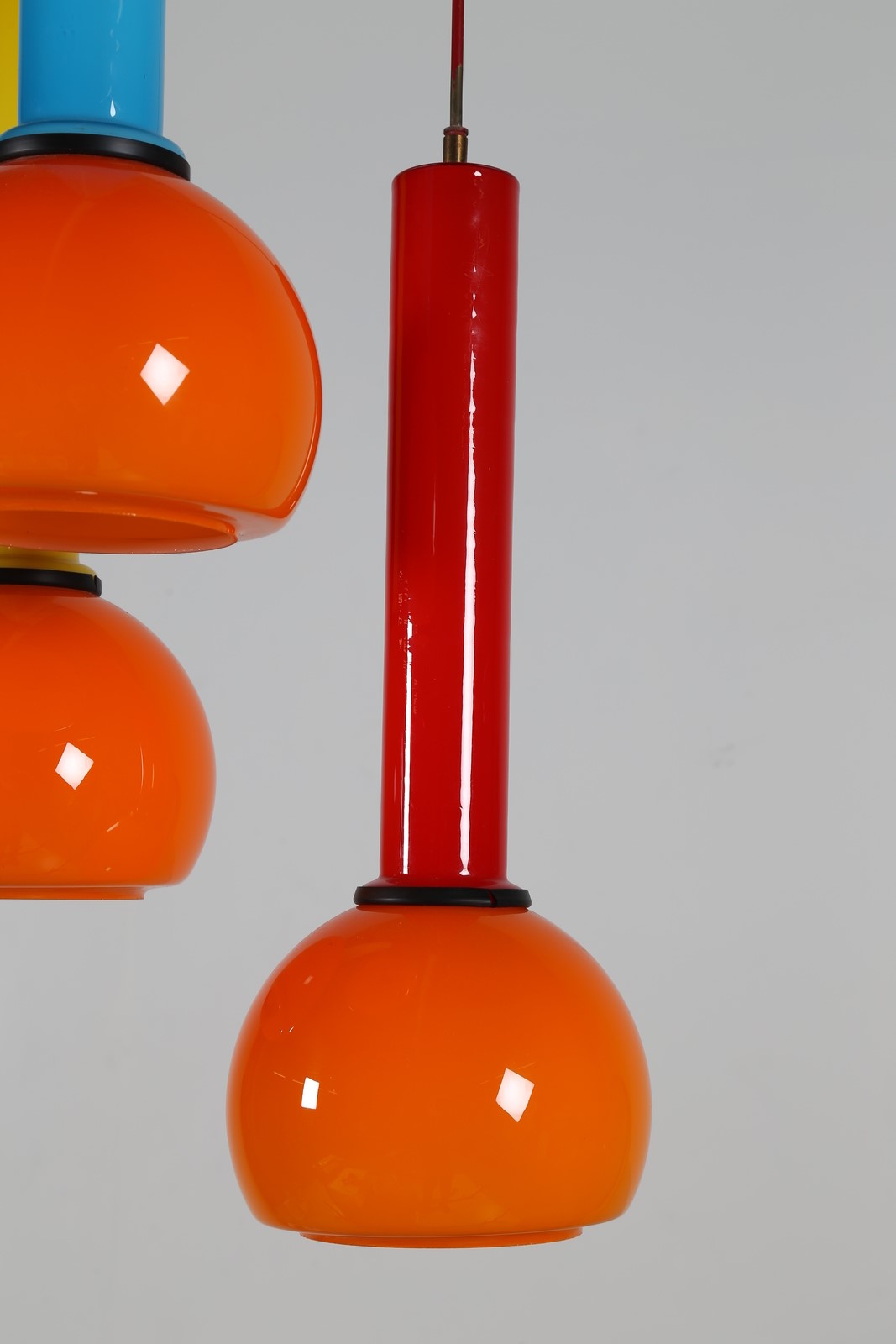 STILNOVO Lampada a sospensione in ottone e metallo a tre lumi in vetro incamiciato, anni 50. -. Cm 43,00 x 127,00 x 43,00.