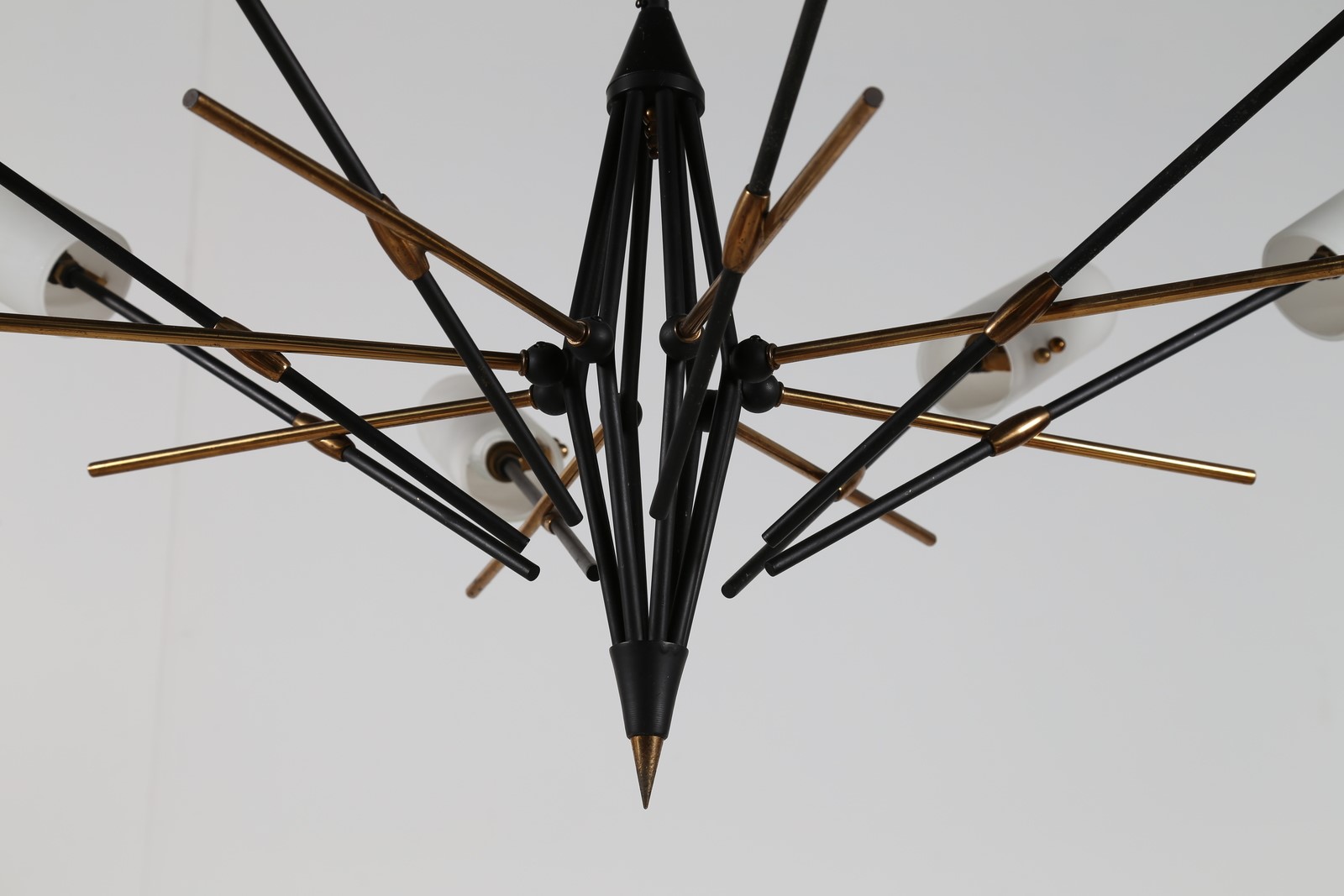 STILNOVO Lampadario in ottone metallo laccato e vetro opalino a otto lumi, anni 50. . Cm 95,00 x 105,00 x 95,00.