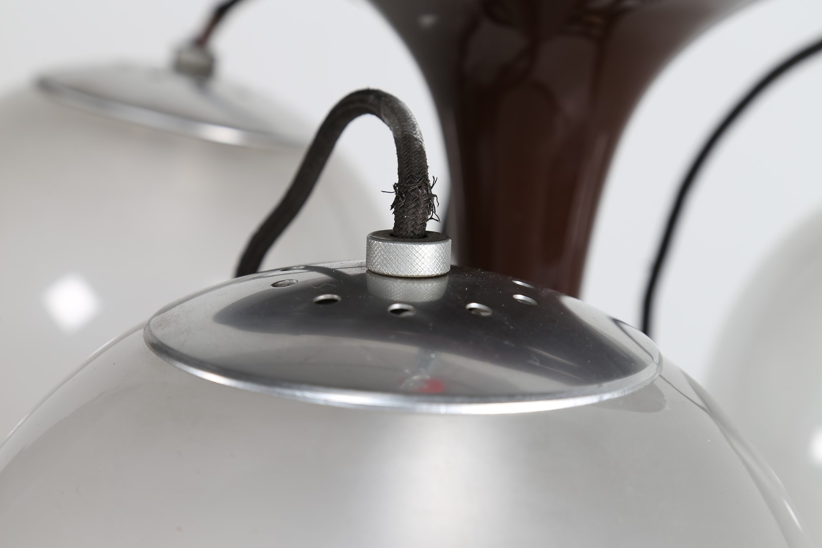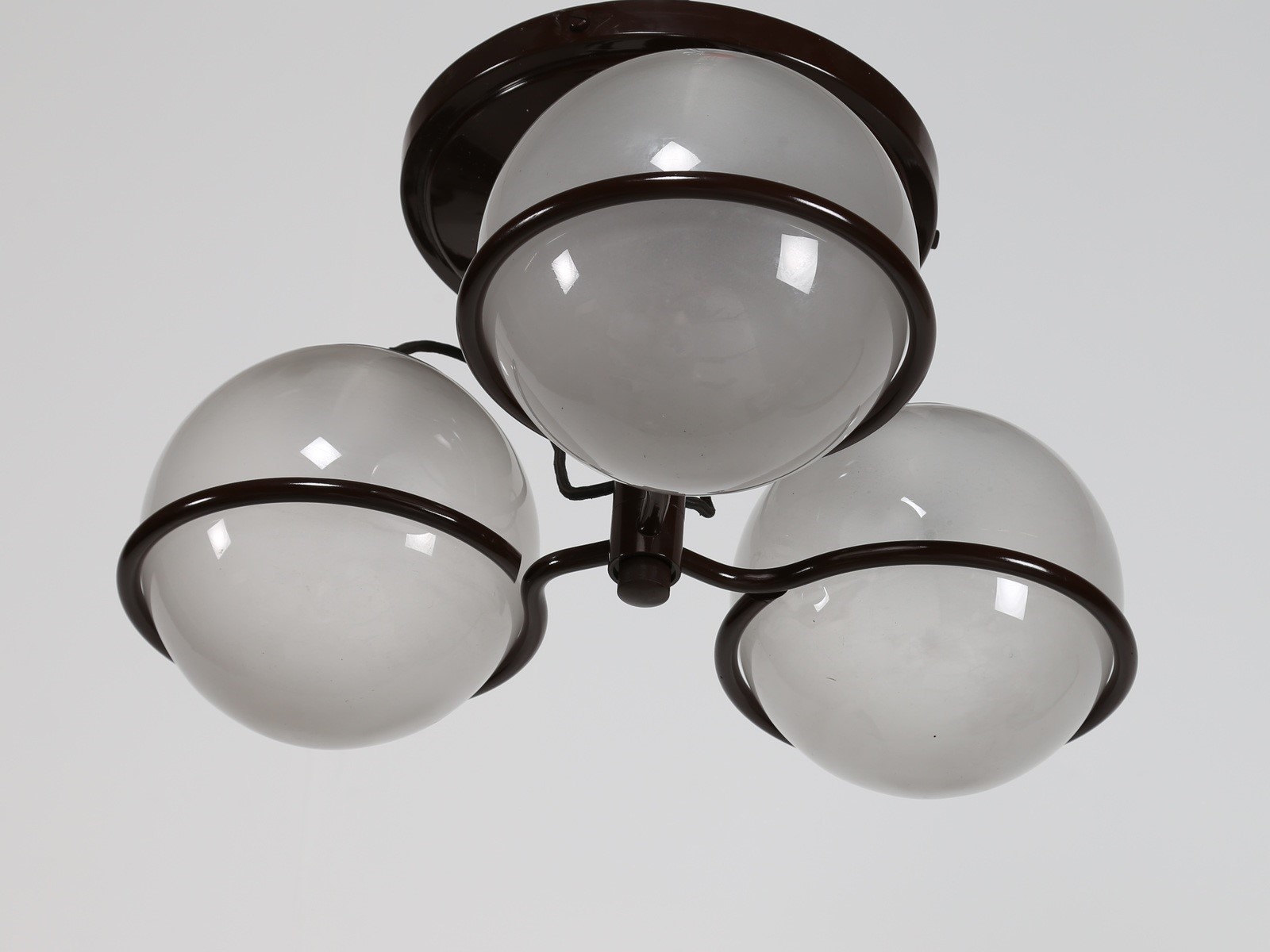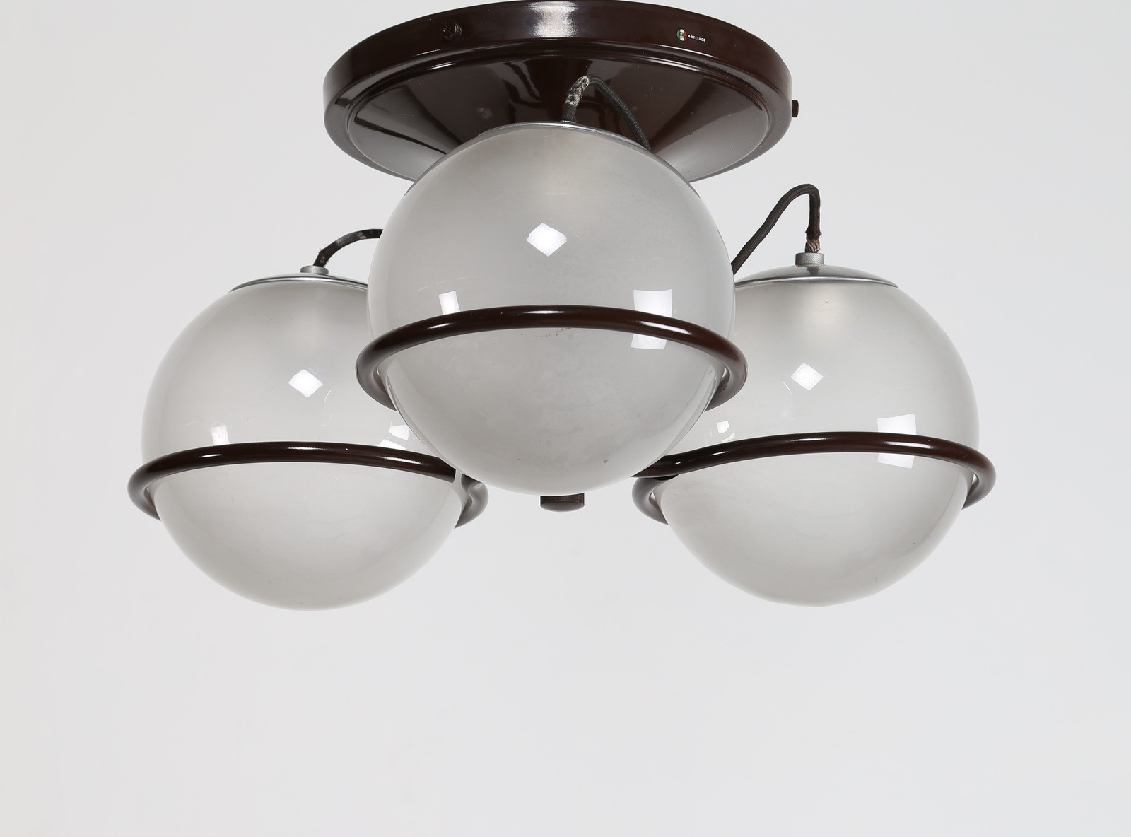 SARFATTI GINO (1912 - 1985) Lampada a sospensione e/o plafone con struttura in metallo laccato e tre sfere in vetro soffiato, per Arteluce, anni 60. Pubblicazioni; M. Romanelli, S. Severi, Gino Sarfatti opere scelte 1938-1973, Silvana editoriale, 2012, pag. 299, 301 e 479. . -. Cm 51,00 x 29,00 x 51,00. Etichetta presente