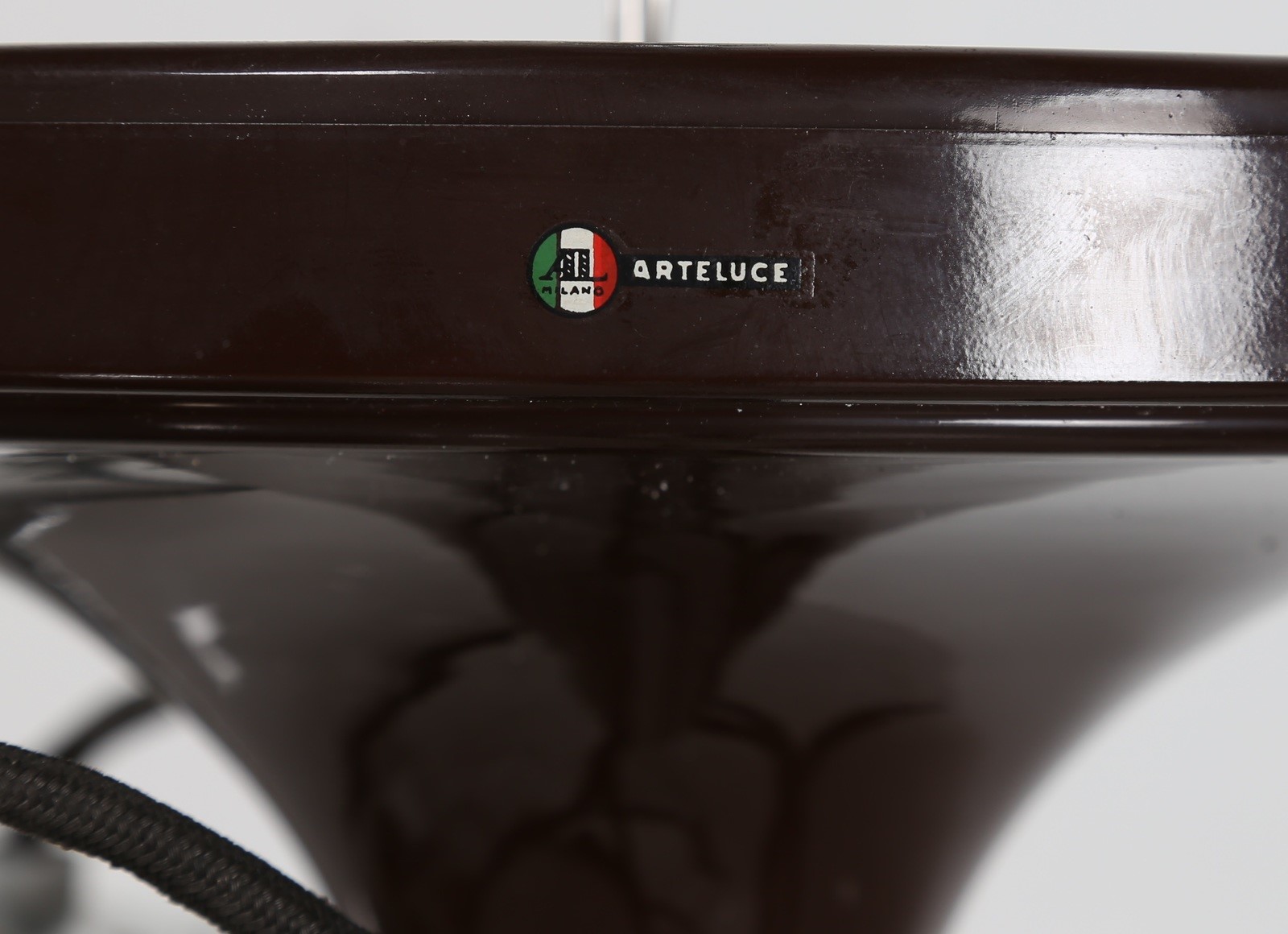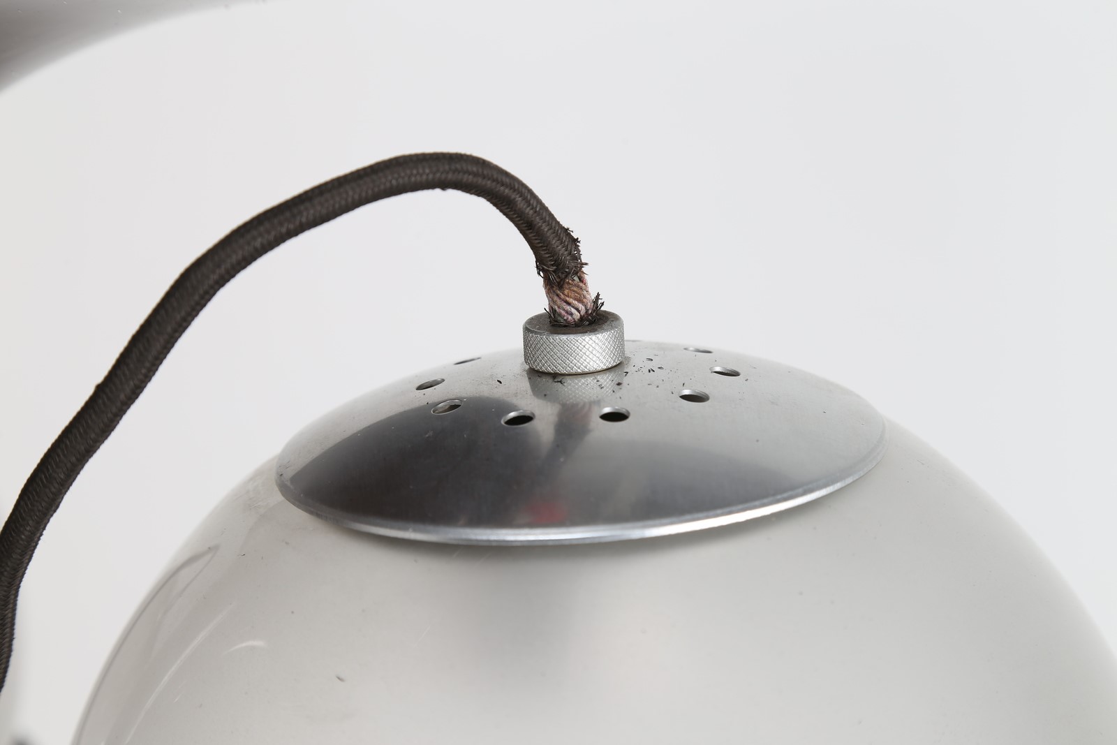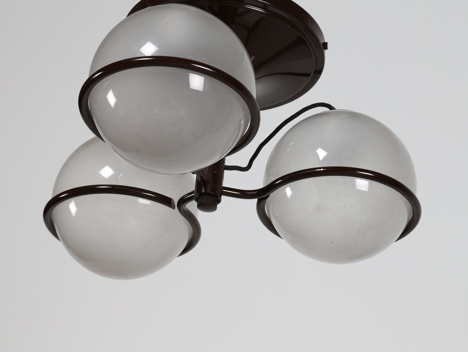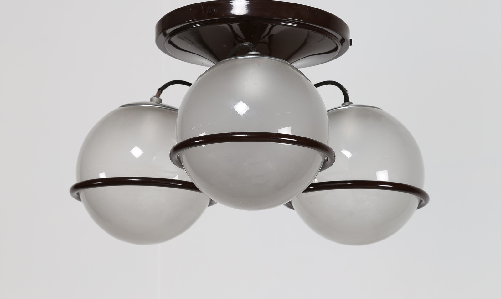 SARFATTI GINO (1912 - 1985) Lampada a sospensione e/o plafone con struttura in metallo laccato e tre sfere in vetro soffiato, per Arteluce, anni 60. Pubblicazioni; M. Romanelli, S. Severi, Gino Sarfatti opere scelte 1938-1973, Silvana editoriale, 2012, pag. 299, 301 e 479. . -. Cm 51,00 x 29,00 x 51,00. Etichetta presente