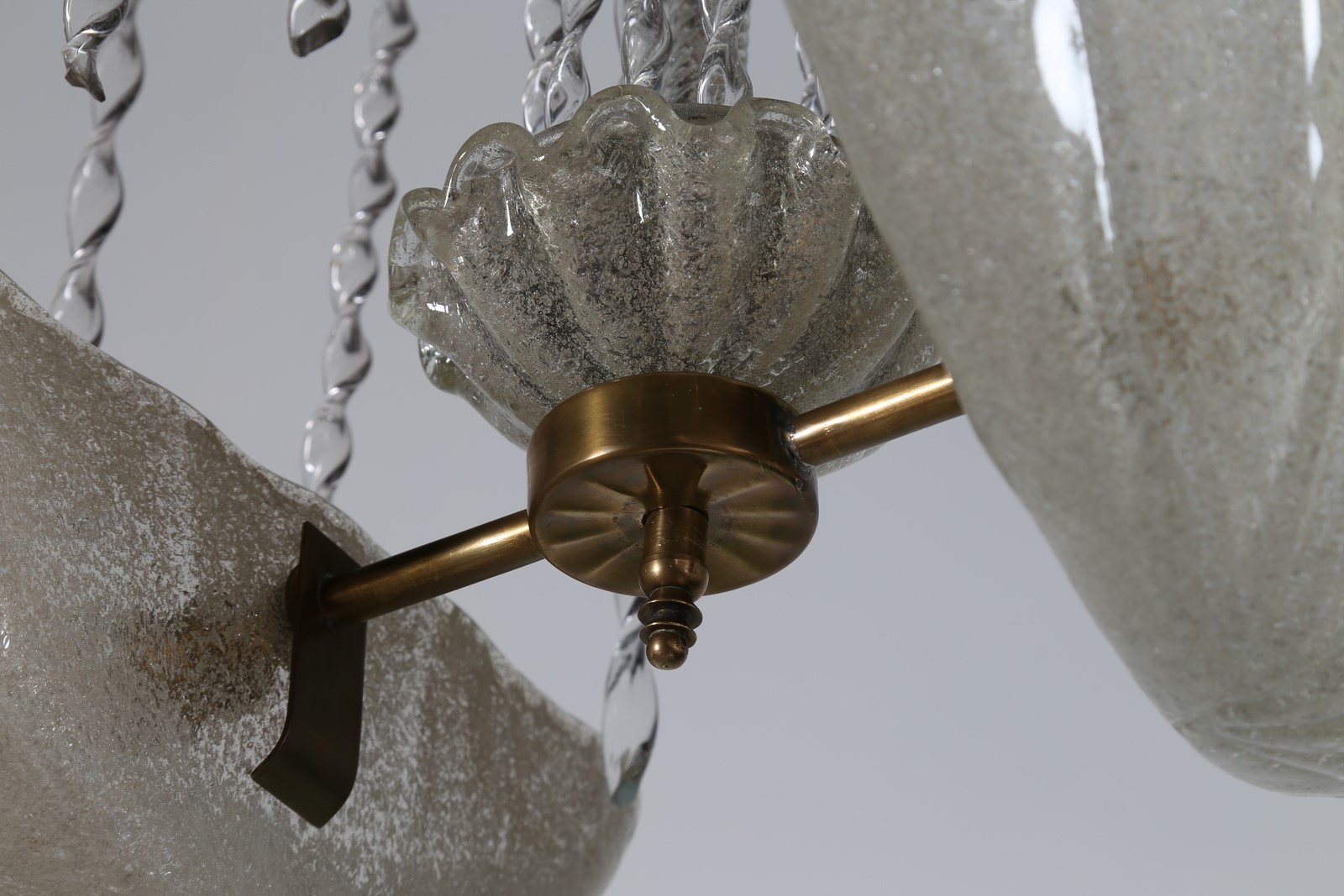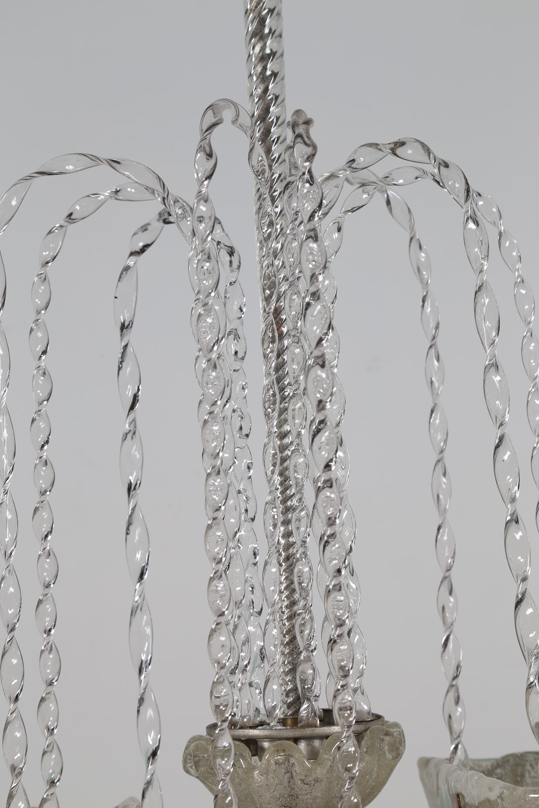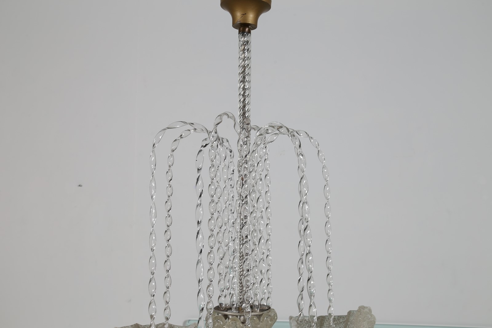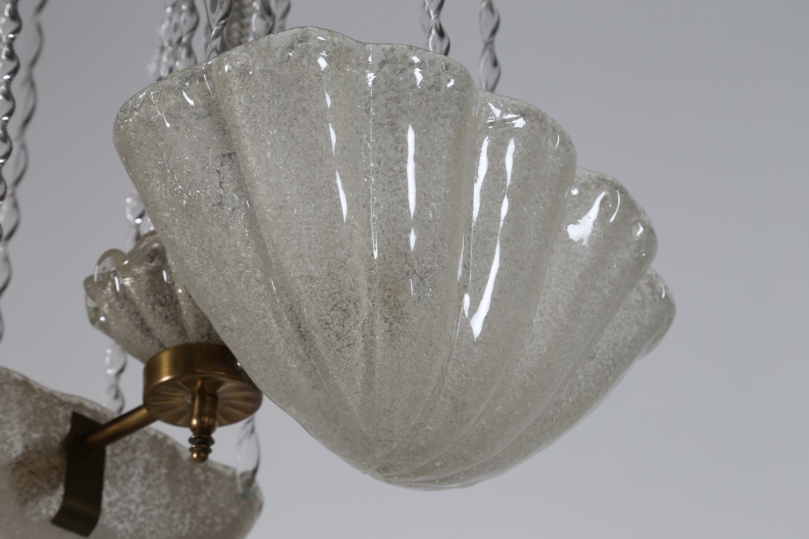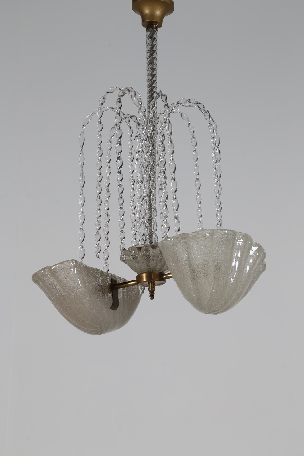 BAROVIER ERCOLE (1889 - 1974) Importante lampadario con canna in vetro torchon composto da due conchiglie in vetro rugiada, e nove braccetti a mo di zampillo di fontana, per Barovier e Toso 1938. Pubblicazione; Impronte del Soffio, ed. Coin 1987 fig. 43 . -. Cm 57,00 x 85,00 x 38,00.