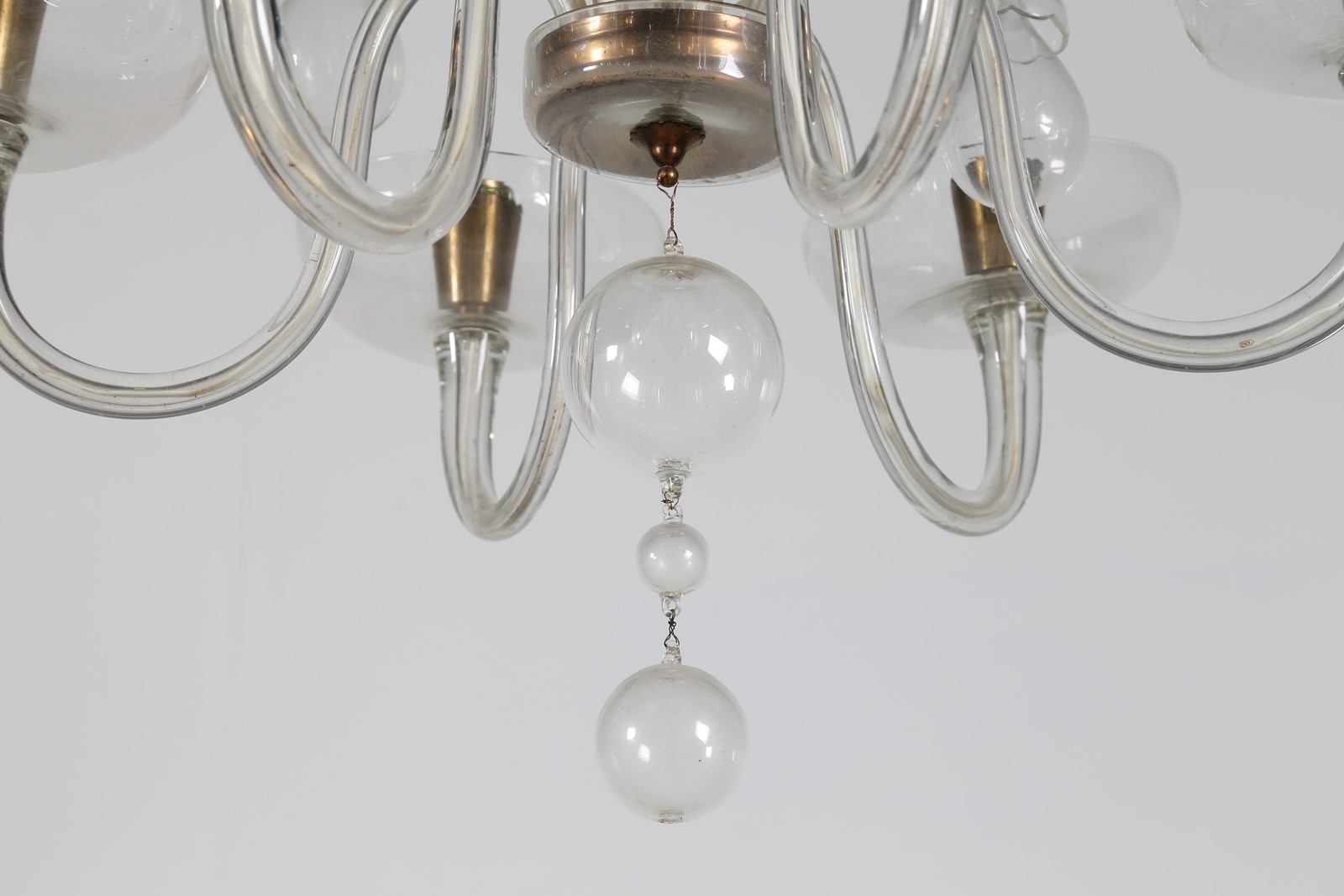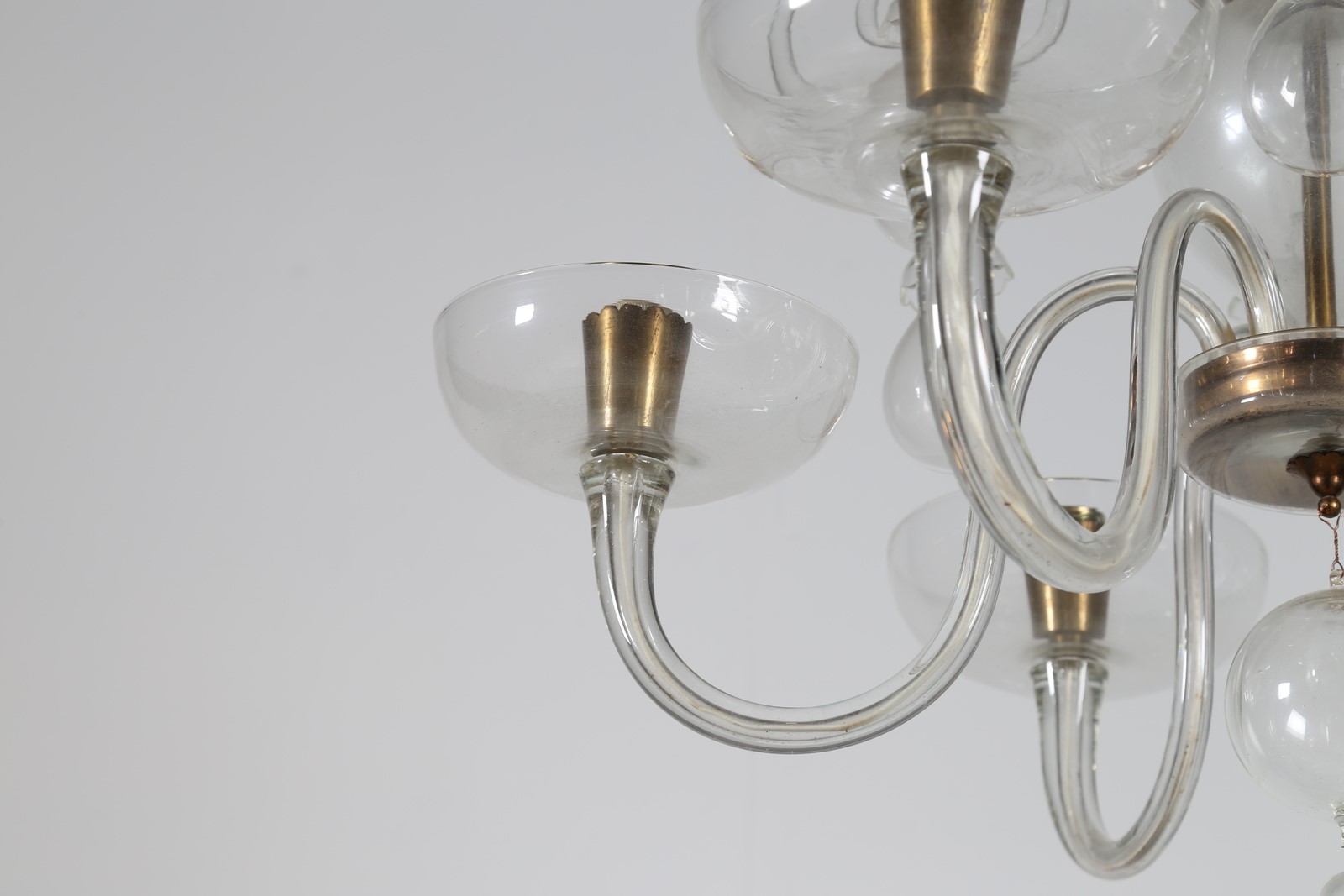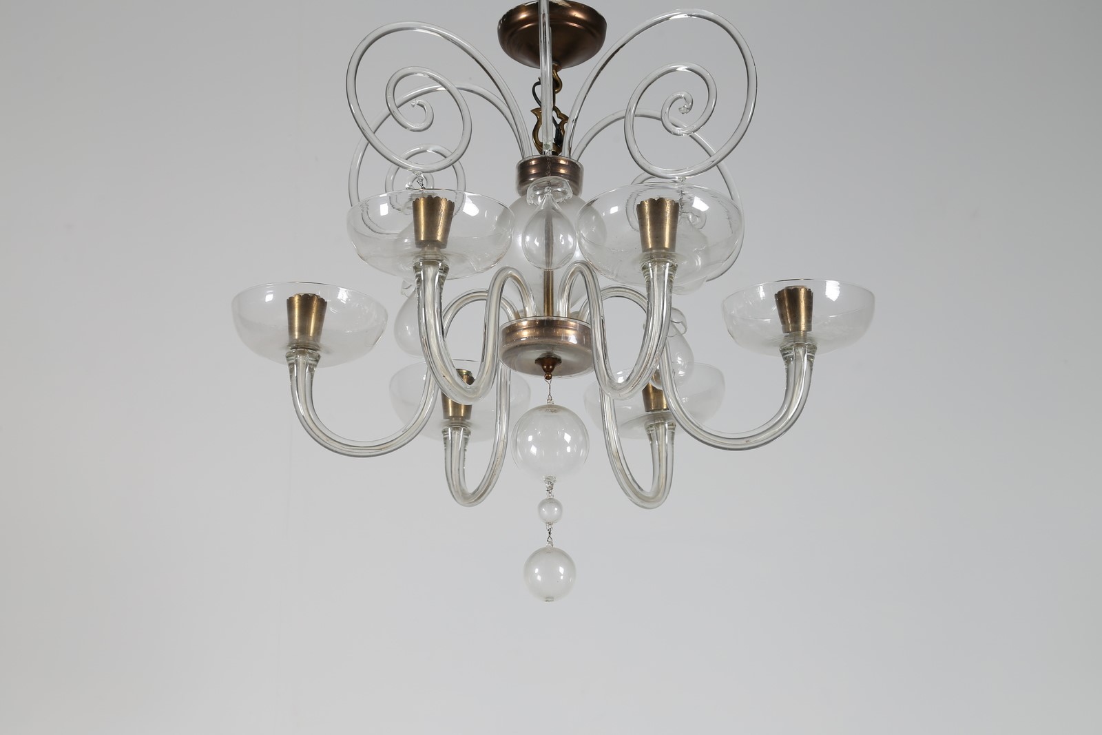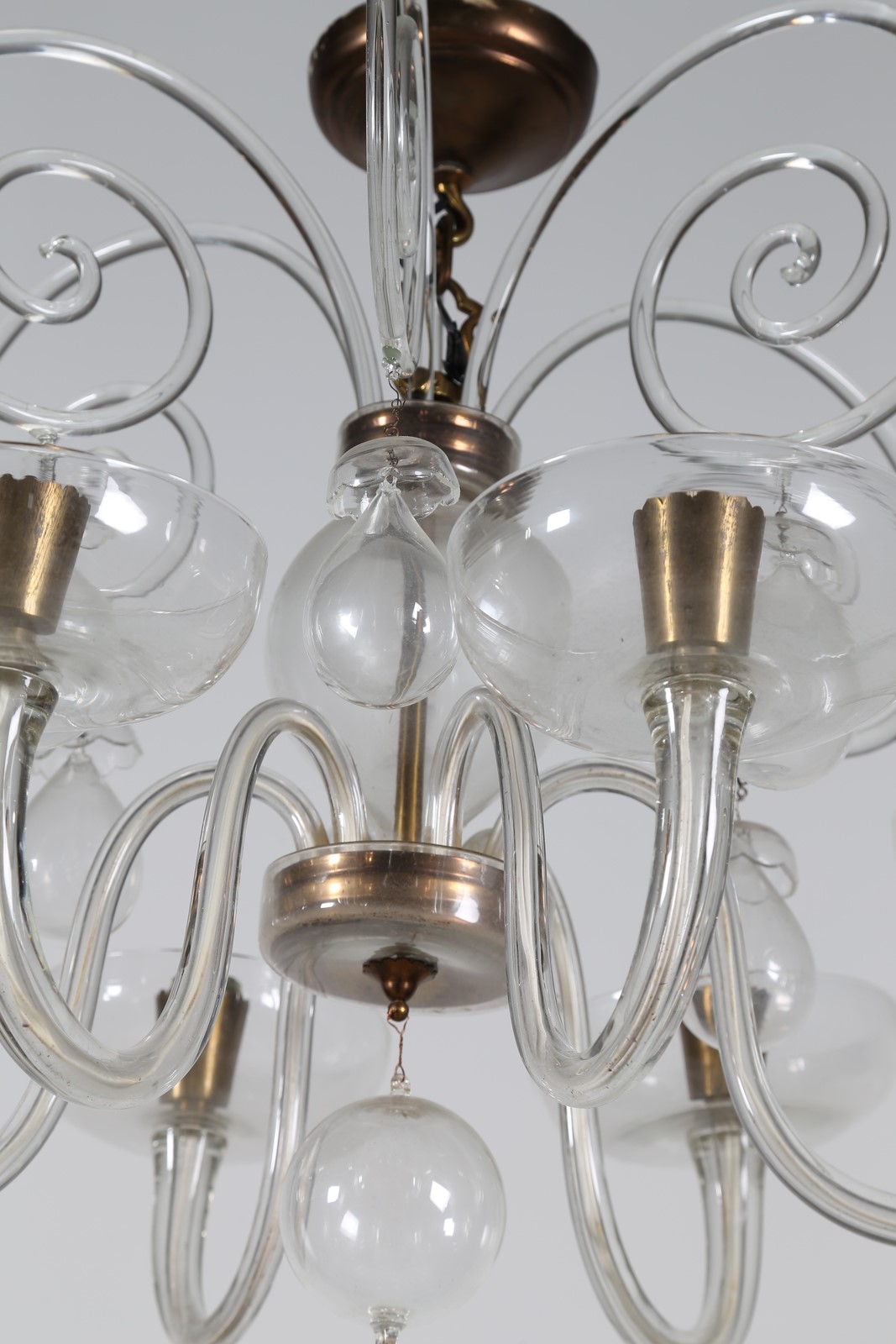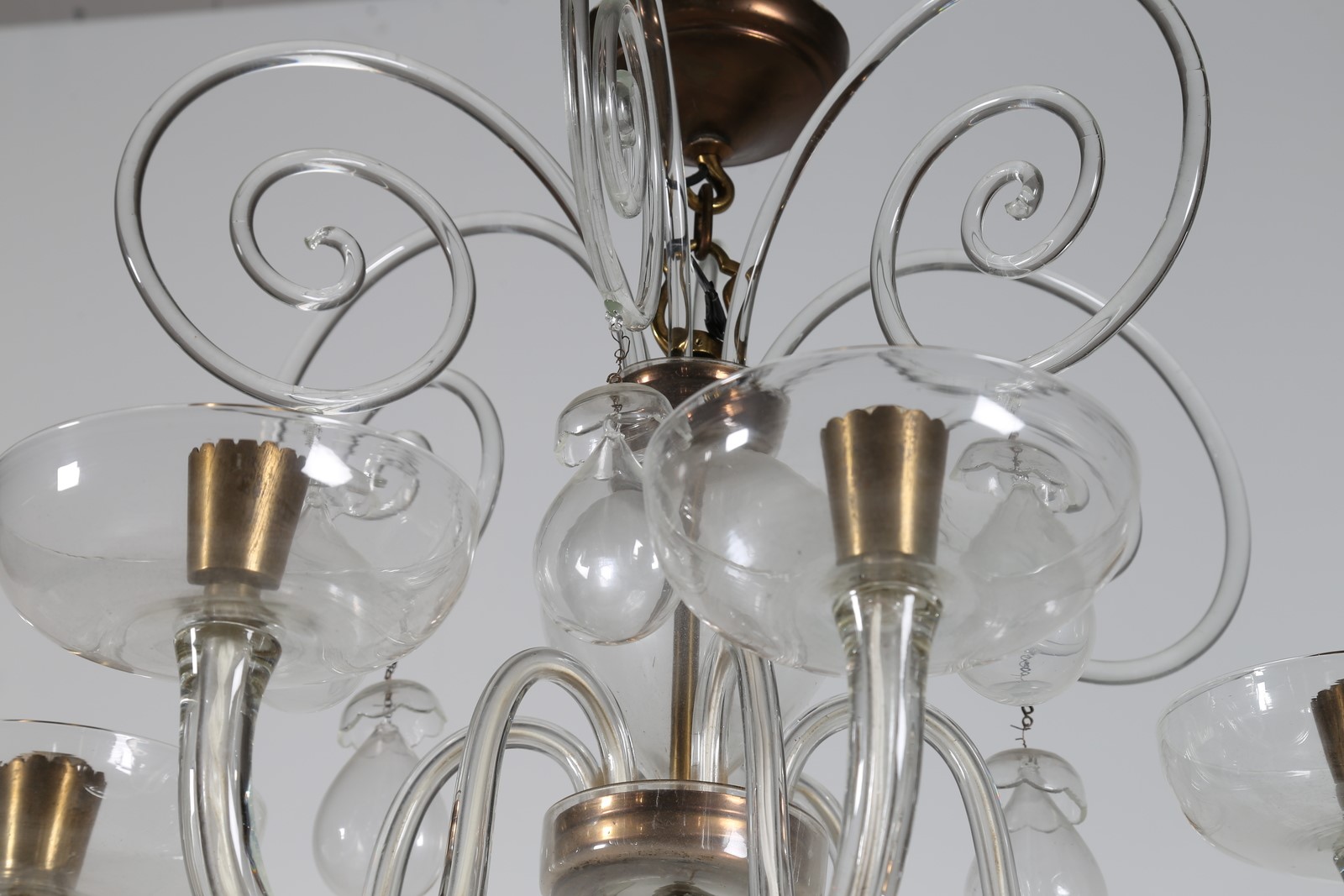 VENINI Coppia lampadari a sei luci in cristallo trasparente e dettagli in ottone, Murano anni 50. Collezione privata, dimora in Belluno interamente arredata da Luigi Scremin. Pubblicazioni; Venini. Catalogo Ragionato 1921-1986 di A. Venini Diaz De Santilliana, ed. Skira, catalogo blu fig.181. . -. Cm 65,00 x 90,00 x 65,00.
