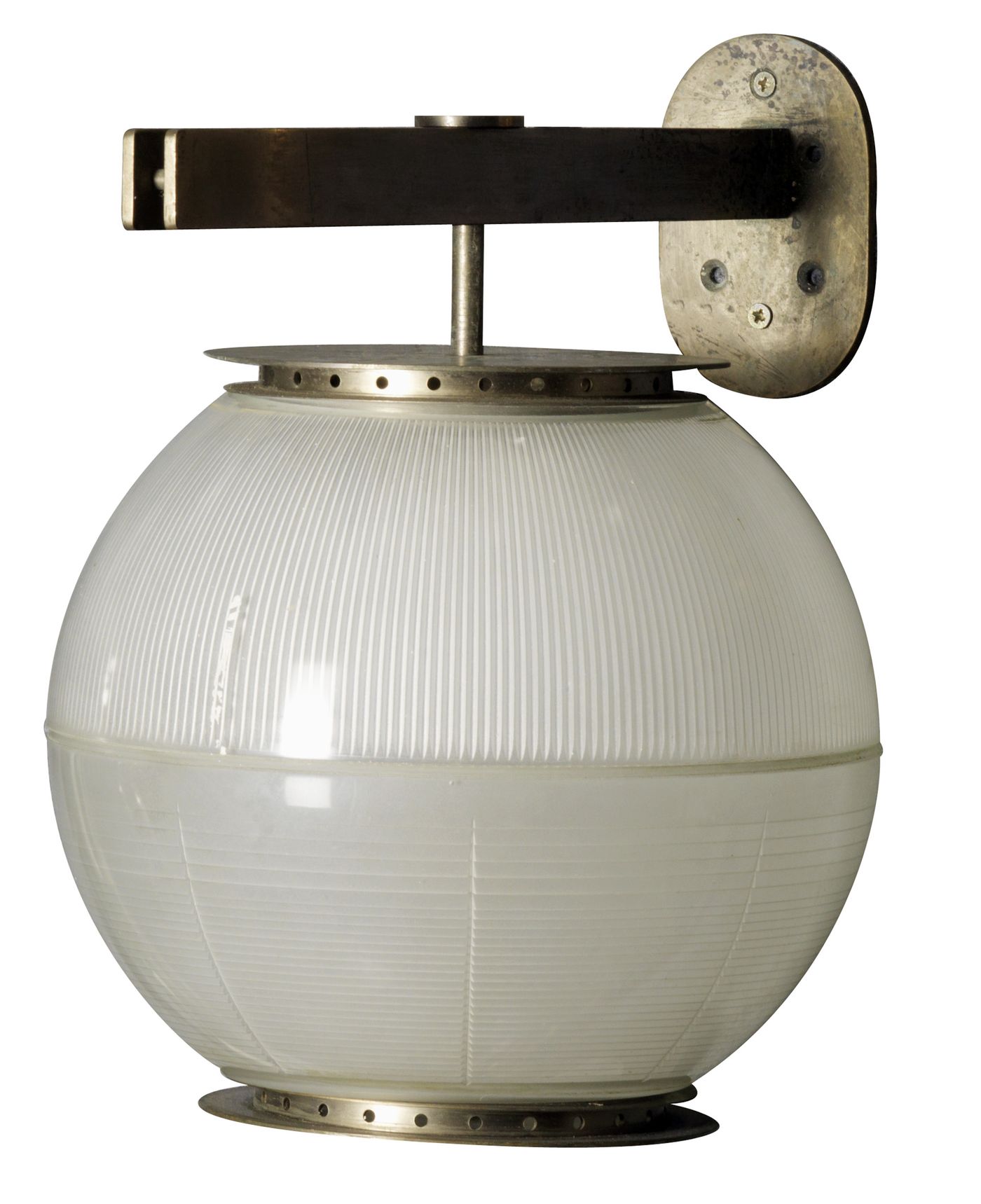 GARDELLA IGNAZIO Lampada da parete doppio vetro. Riflettore e coppa in vetro prismatico sabbiato, montatura in ottone Prod. Azucena 1955. diam cm 25 Bibl.: Marco Romanelli, “Azucena 40 anni di storia del design”, in Domus ,723 gennaio, 1991, pag 73 fig. 1,2,3.