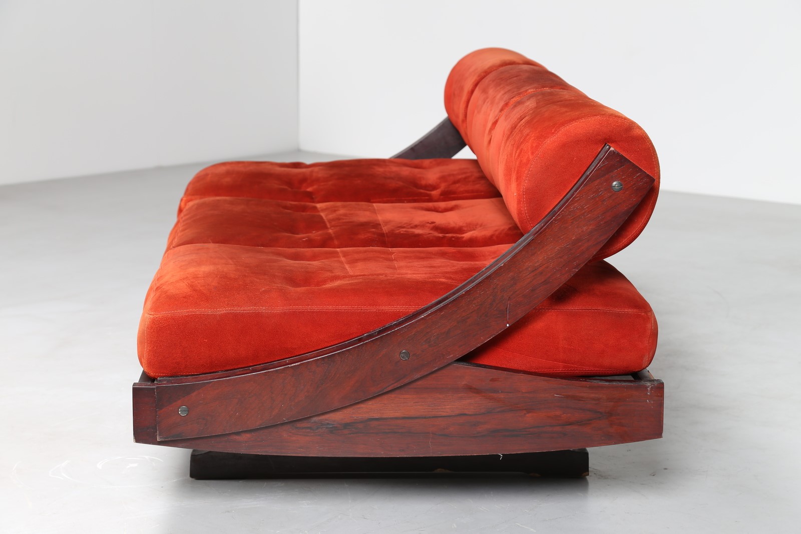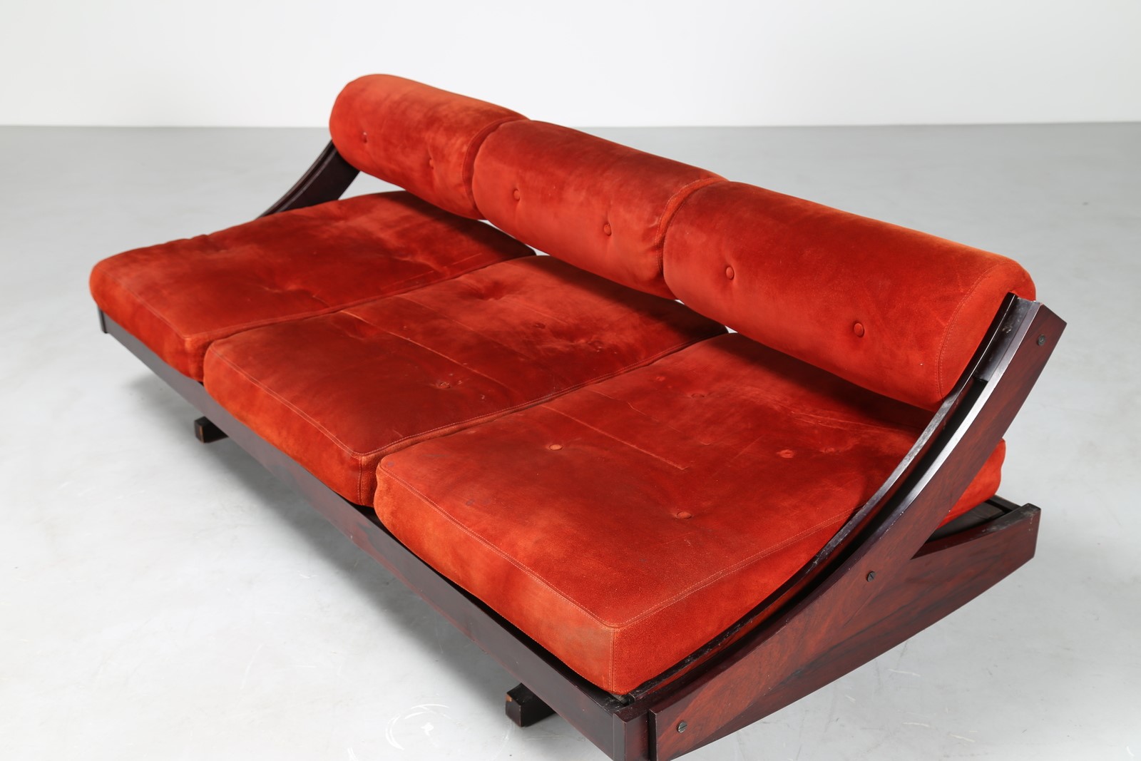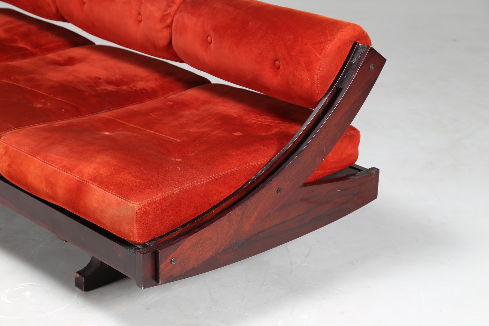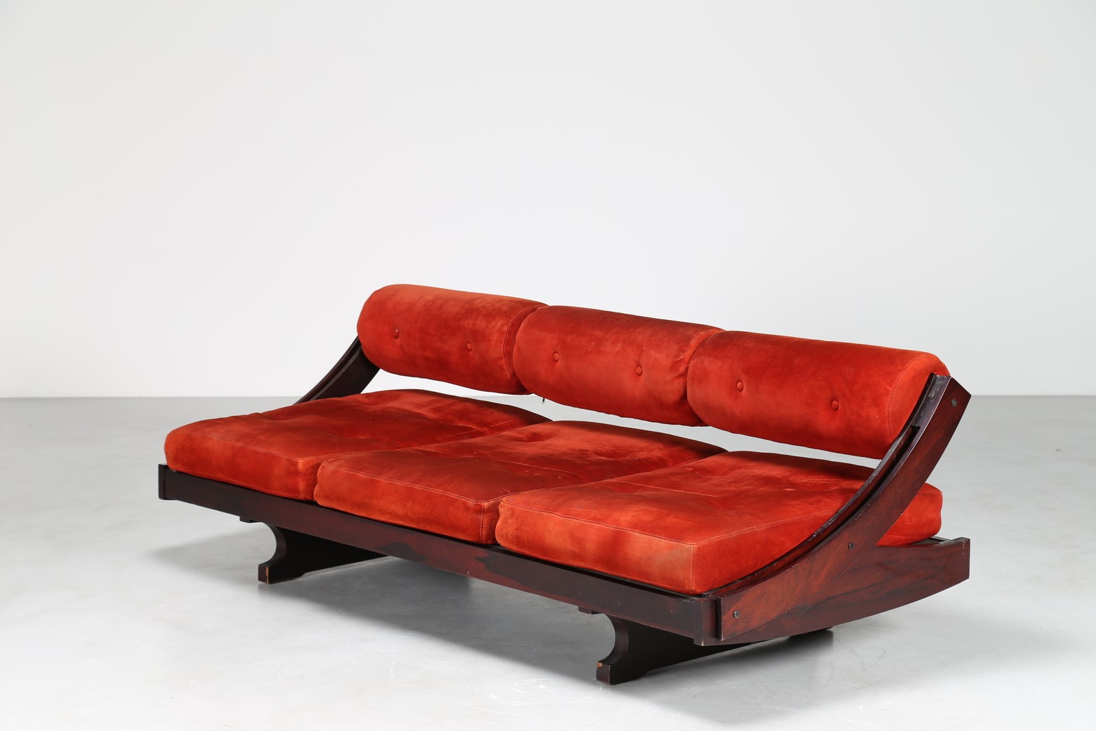 SONGIA GIANNI Divano con struttura in palissandro, rivestimento in velluto originale, mod. "6S 195", per Sormani, anni 60. Pubblicazioni; rivista dell'Arredamento n°132 dicembre 1965, pubblicità . -. Cm 202,00 x 69,00 x 87,00.