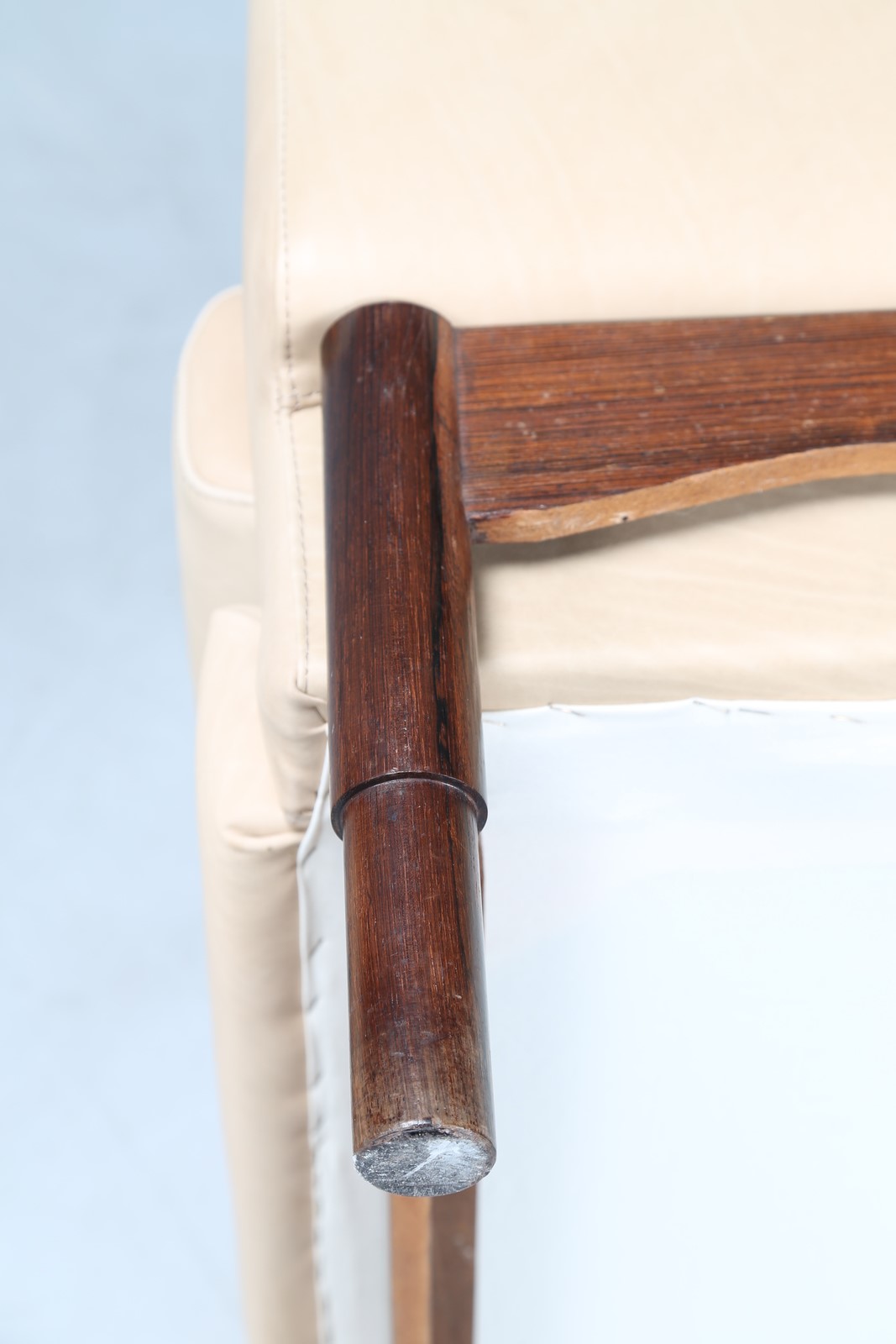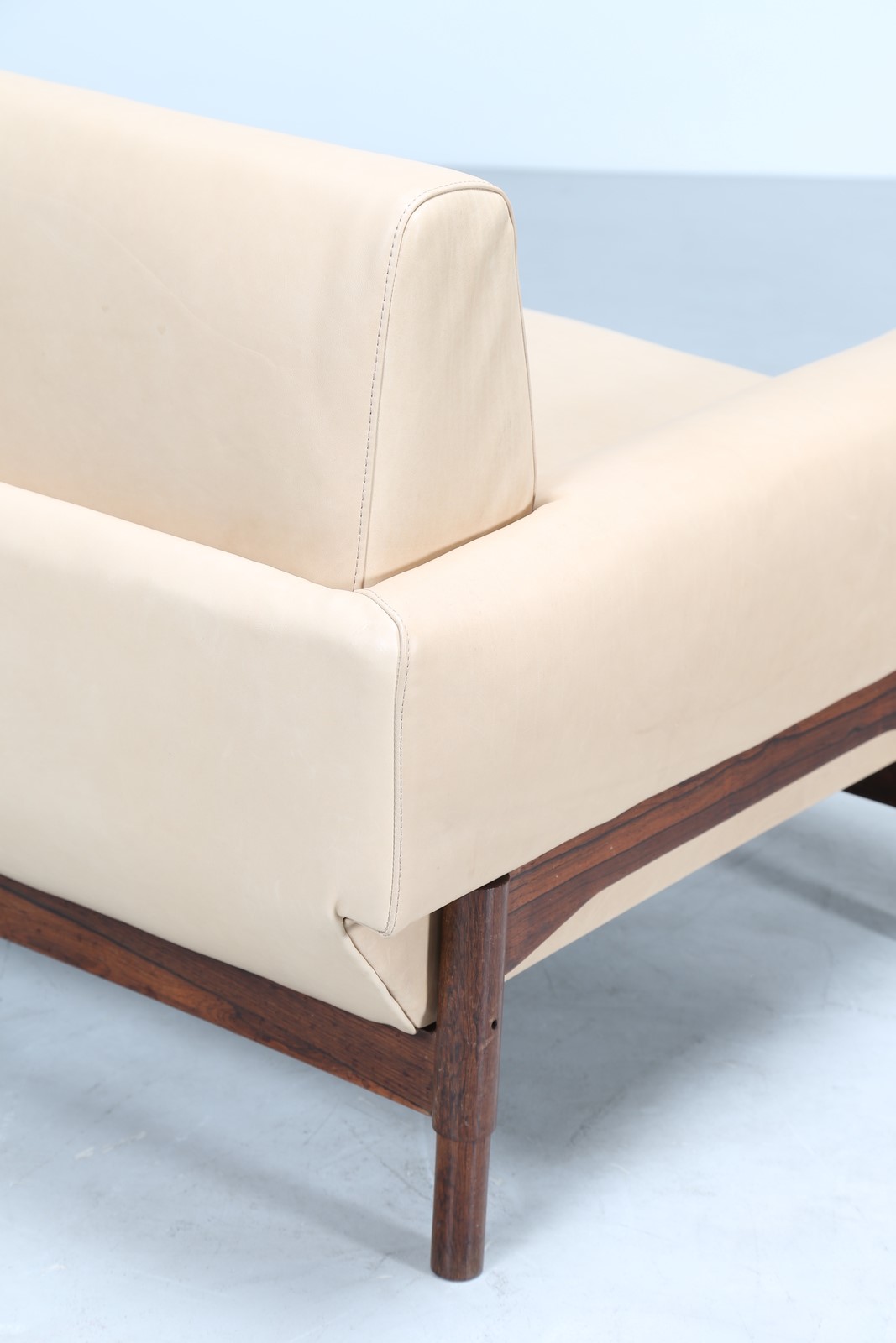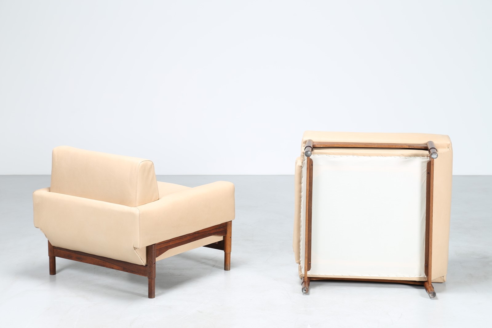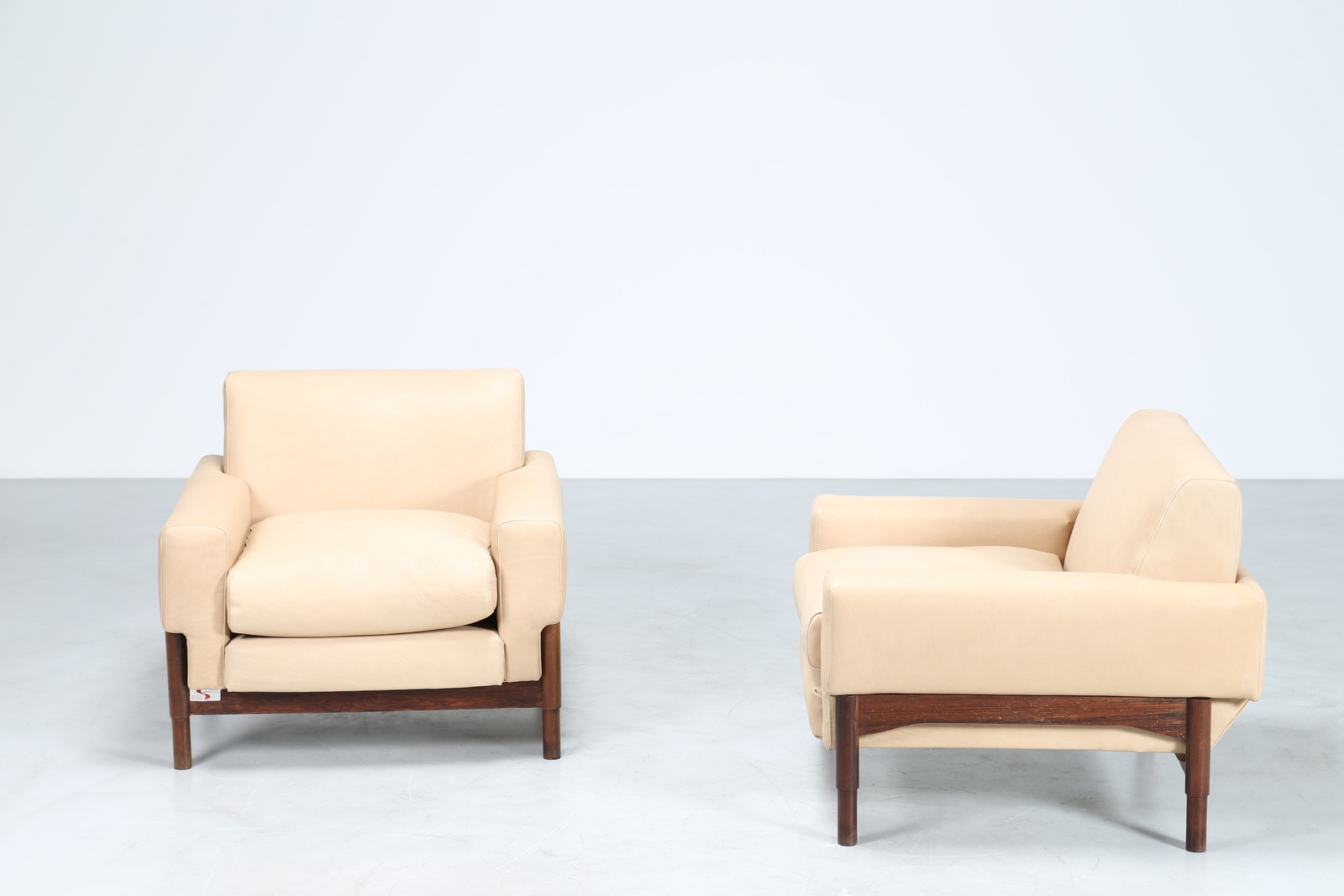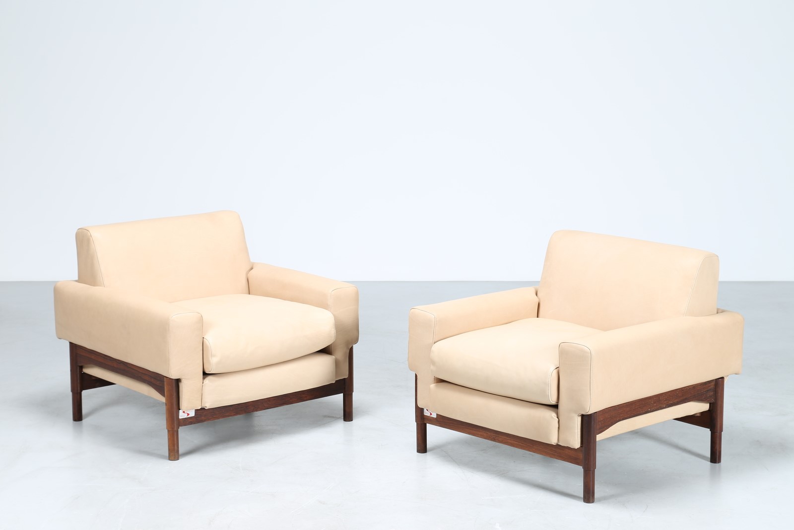 SAPORITI SERGIO Coppia di poltrone in palissandro rivestite in pelle, mod Kiushu, per Fratelli Saporiti, anni 60. Pubblicazioni; Domus n. 400 marzo 1963 pag. 11. . -. Cm 83,00 x 72,00 x 87,00.