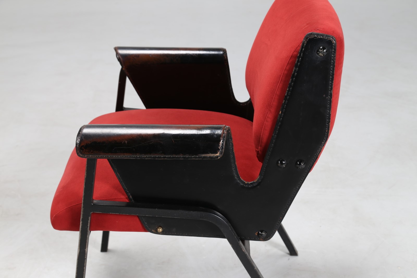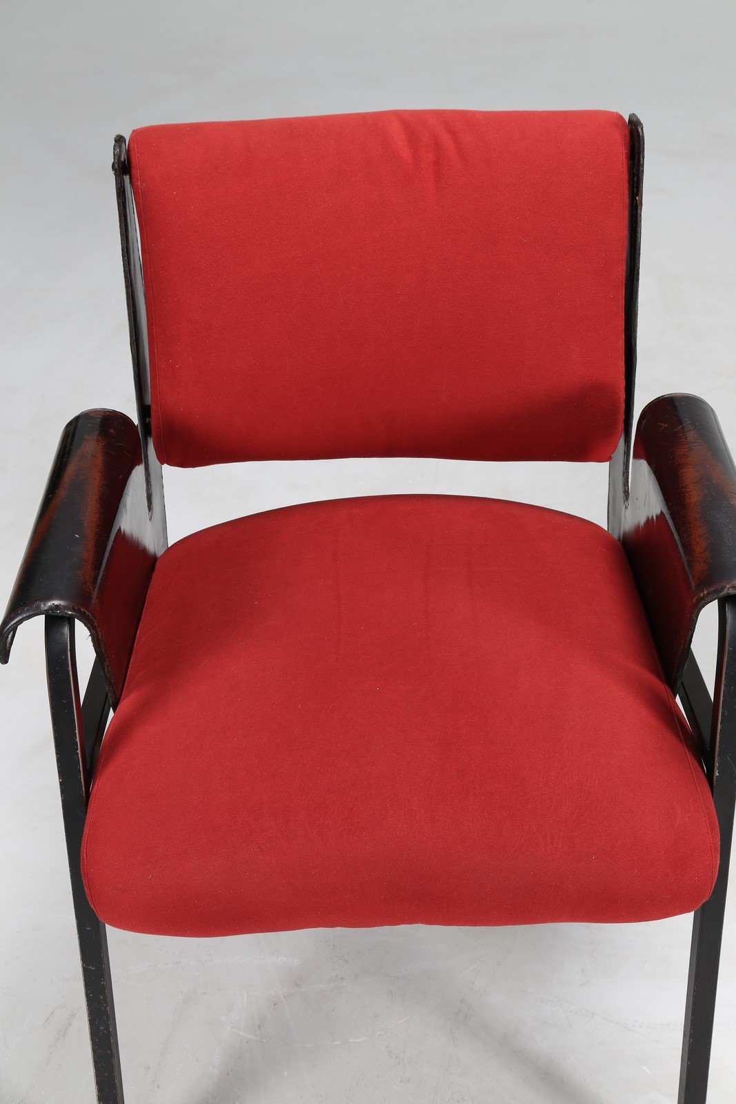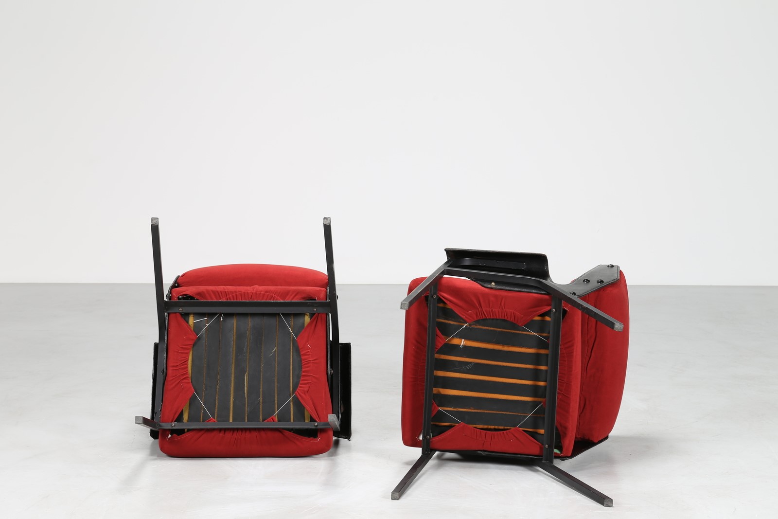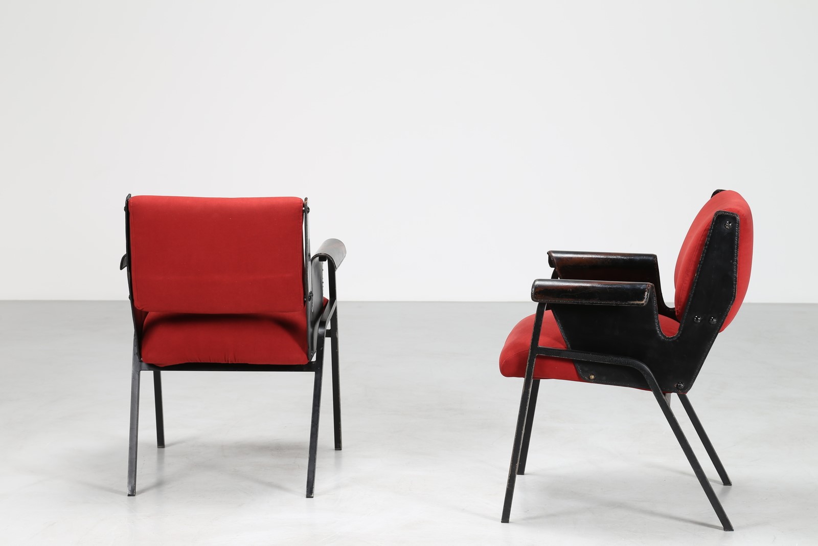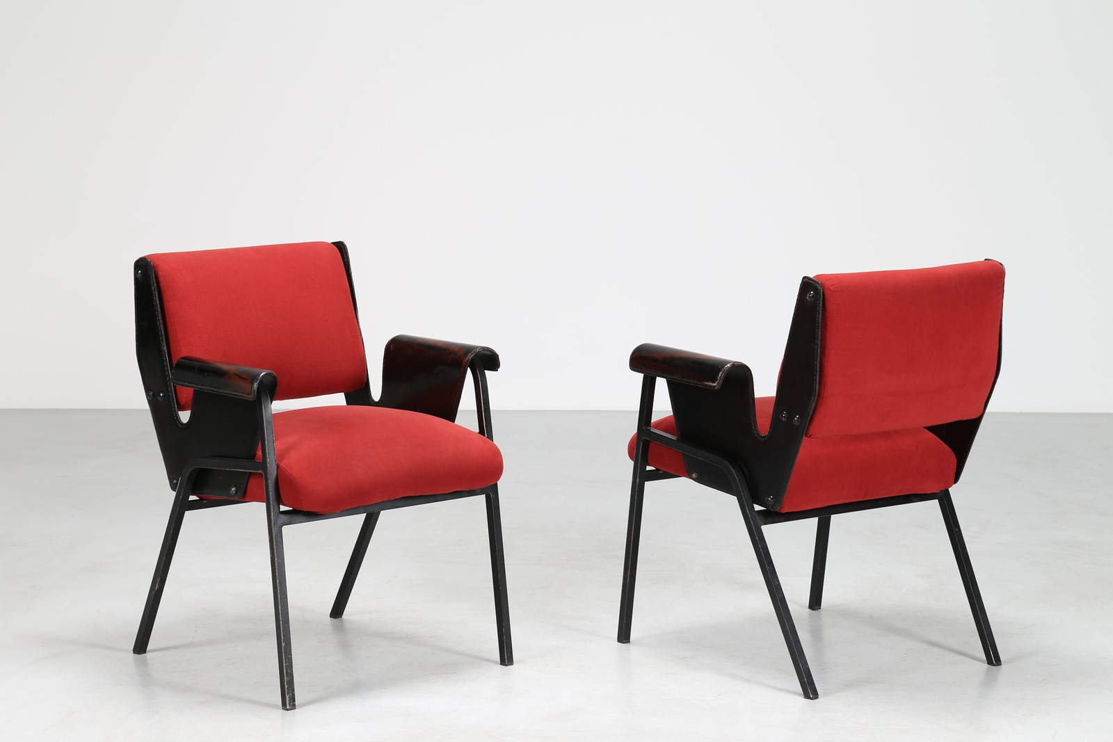 PULITZER FINALI GUSTAVO (1887 - 1967) Coppia di poltroncine in metallo cuoio e tessuto, mod. Albenga, per Arflex, anni 50. Pubblicazioni; Domus n. 342 maggio 1958 pag. 17; Domus n. 343 giugno 1958 pag. 77. . . Cm 59,50 x 80,00 x 64,00.