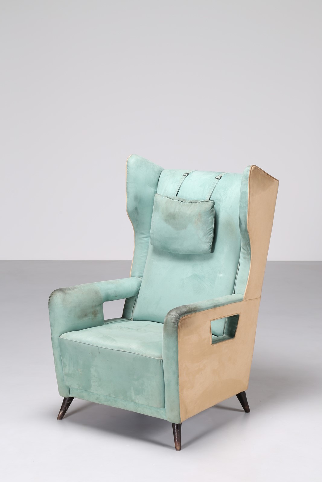 LINA BO BARDI & CARLO PAGANI Rara poltrona in legno rivestita con velluto verde e beige disegnata per lo studio di Casa P., Milano, Anni 40 . Tessuto. Cm 90,00 x 115,00 x 70,00.