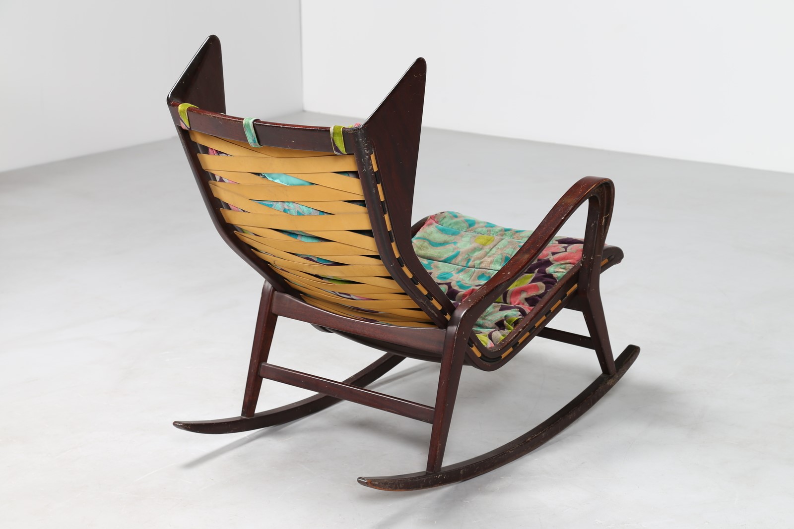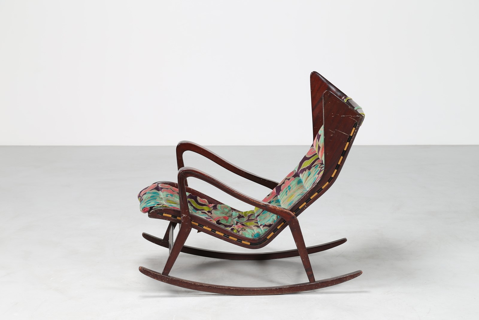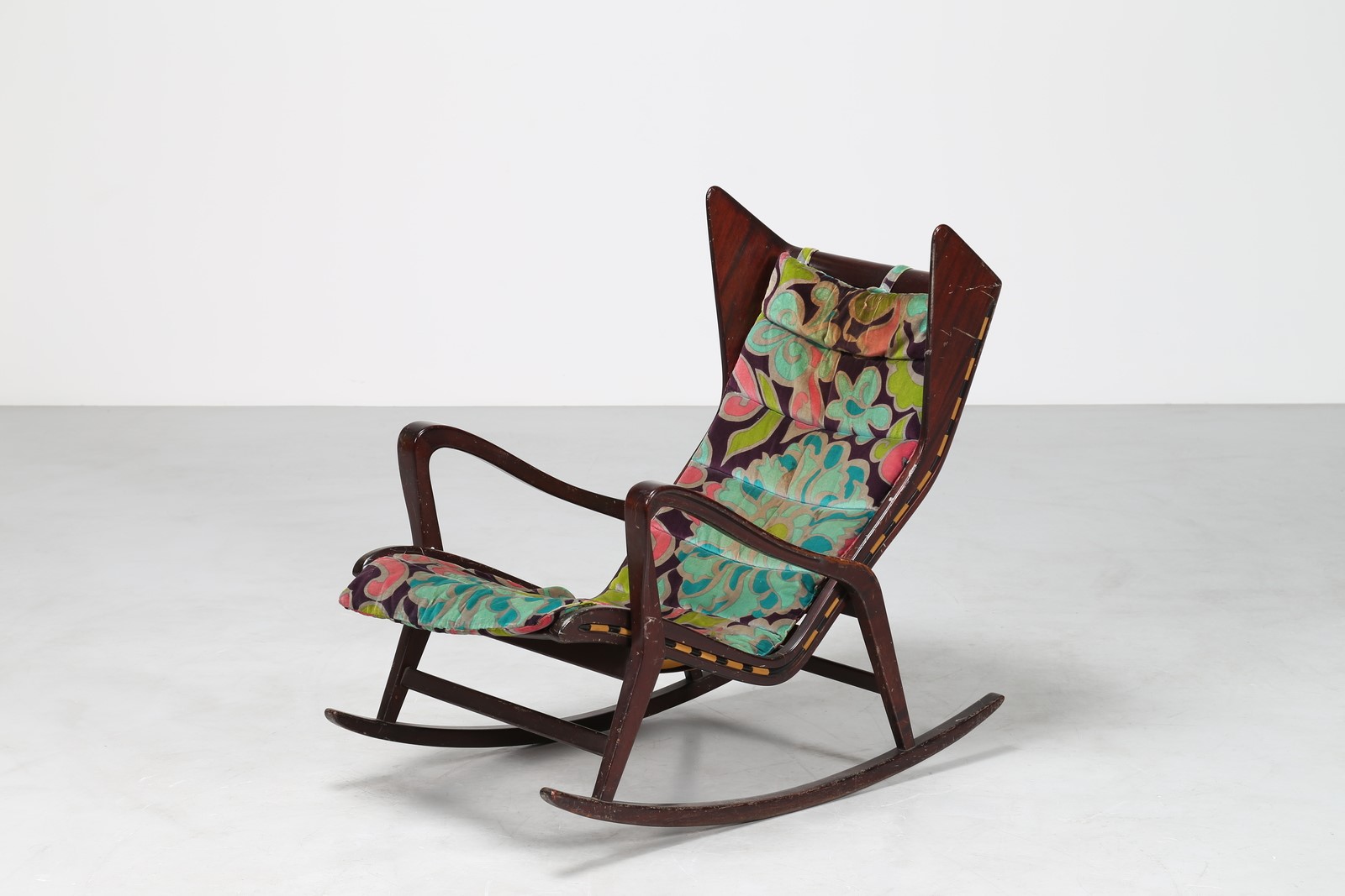 STUDIO CASSINA Sedia a dondolo in legno metallo, cinghie elasiche e cuscino in tessuto, mod 572 per Cassina, anni 50. Pubblicazioni; Pier Carlo Santini, Gli anni del design italiano, Ritratto di Cesare Cassina, Electa, Milano, 1081, p. 109. Irene de Guttry, Maria Paola Maino, Il mobile italiano degli anni 40 e 50, Laterza, Bari, 1992, p. 133. . -. Cm 64,50 x 94,00 x 101,00.