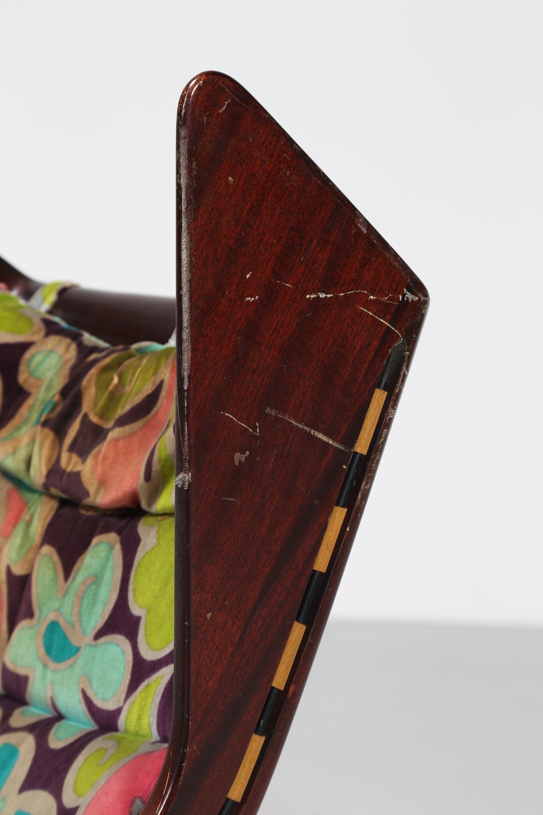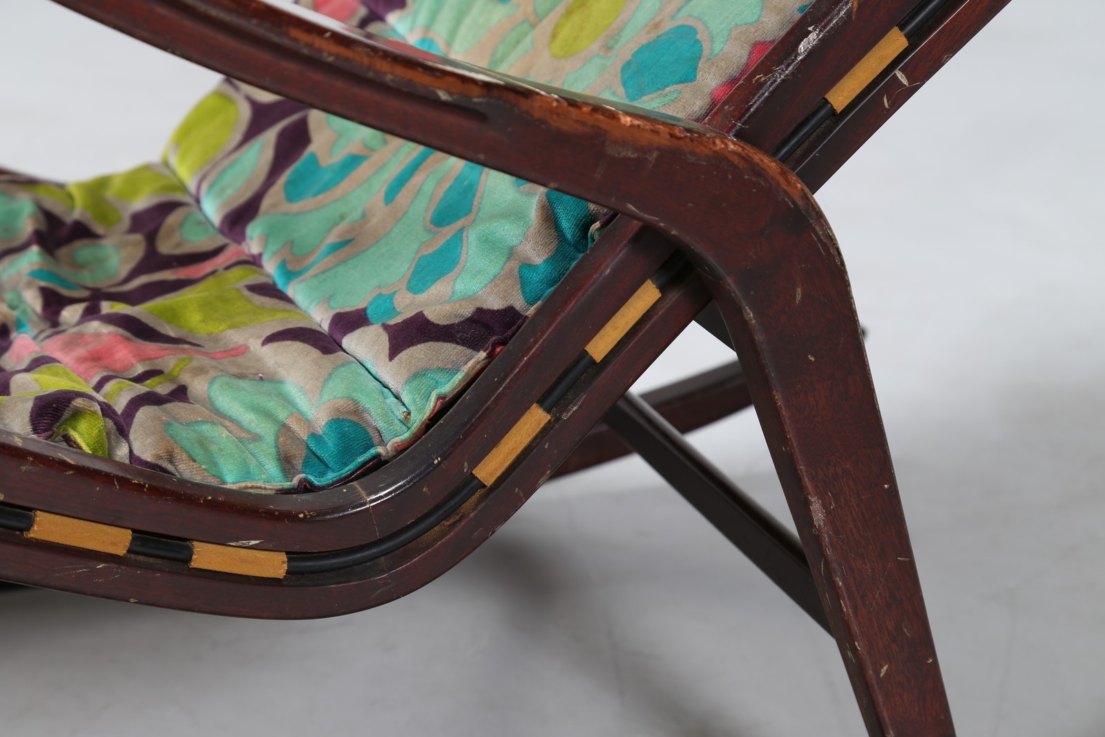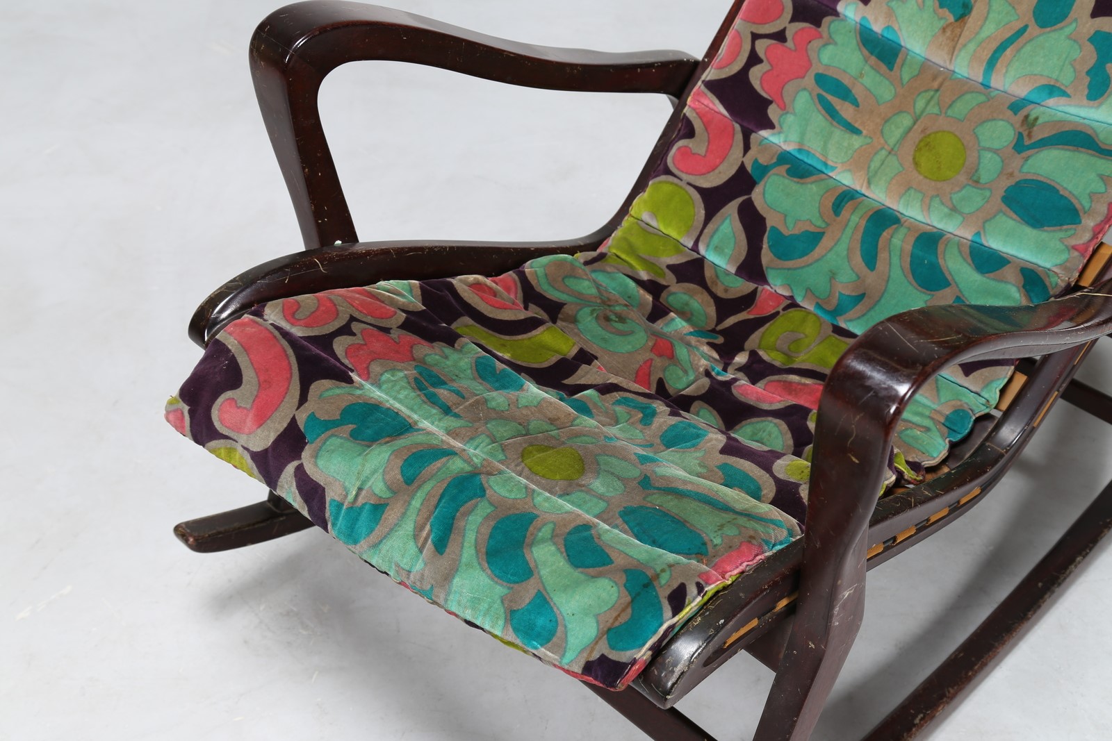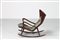 STUDIO CASSINA Sedia a dondolo in legno metallo, cinghie elasiche e cuscino in tessuto, mod 572 per Cassina, anni 50. Pubblicazioni; Pier Carlo Santini, Gli anni del design italiano, Ritratto di Cesare Cassina, Electa, Milano, 1081, p. 109. Irene de Guttry, Maria Paola Maino, Il mobile italiano degli anni 40 e 50, Laterza, Bari, 1992, p. 133. . -. Cm 64,50 x 94,00 x 101,00.