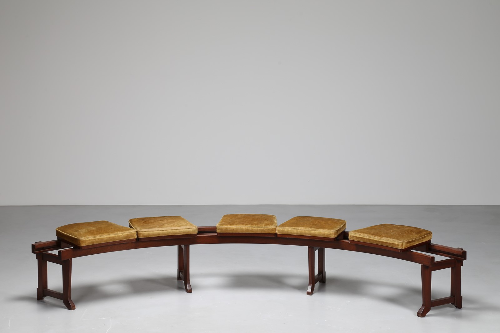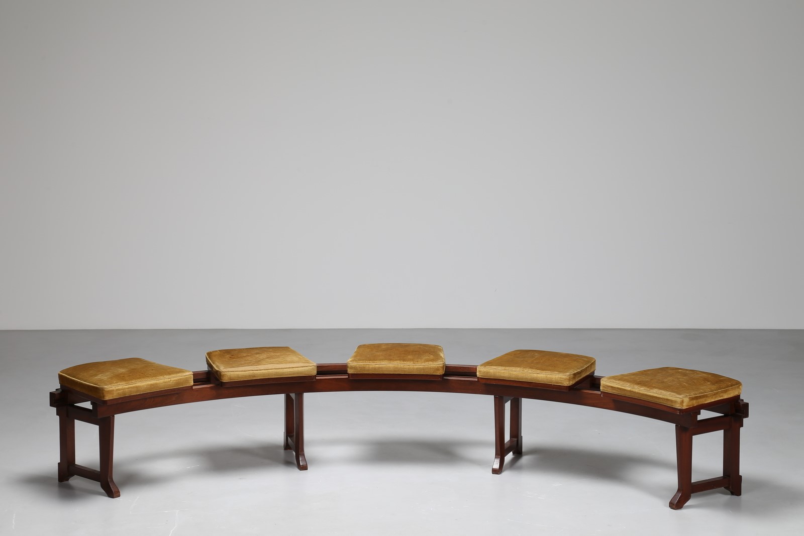 SPADOLINI PIERLUIGI (1922 - 2000) Panca curva in legno di noce con sedute mobili in velluto a binario. Pezzo unico realizzato per l'arredamento di una pasticceria in Firenze con la collaborazione di Giovanni Michelucci nel 1962 chiusa nel 1988. . Cm 278,00 x 47,00.