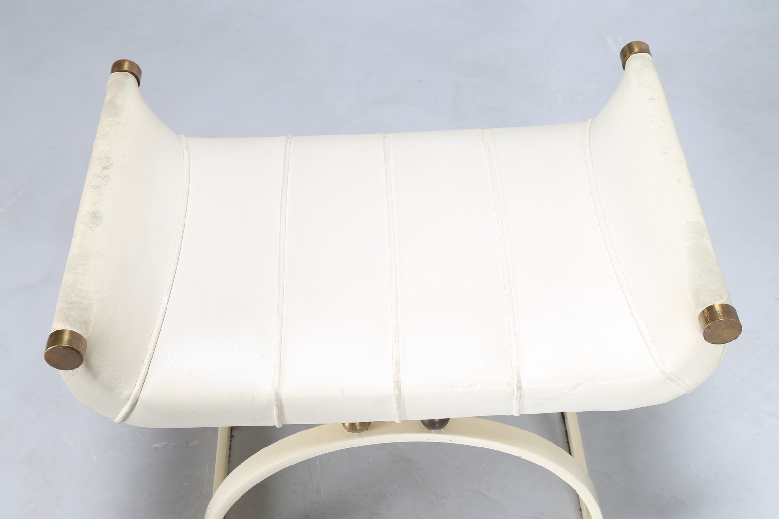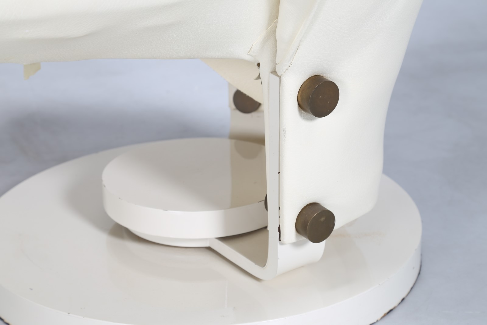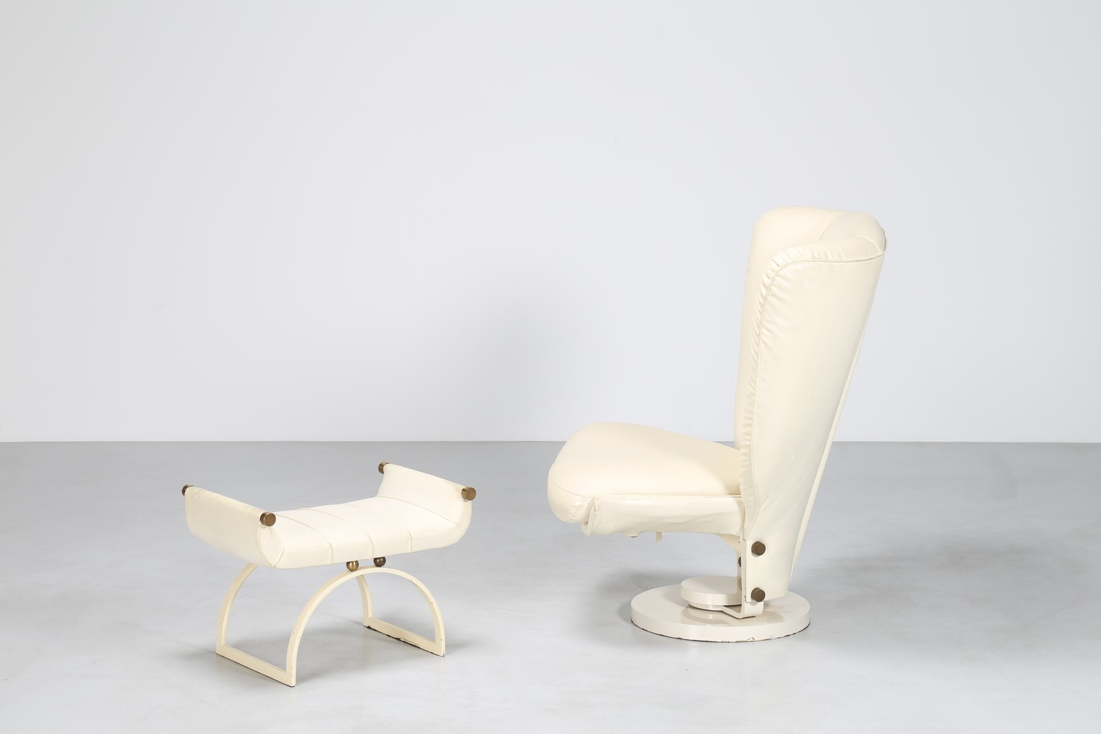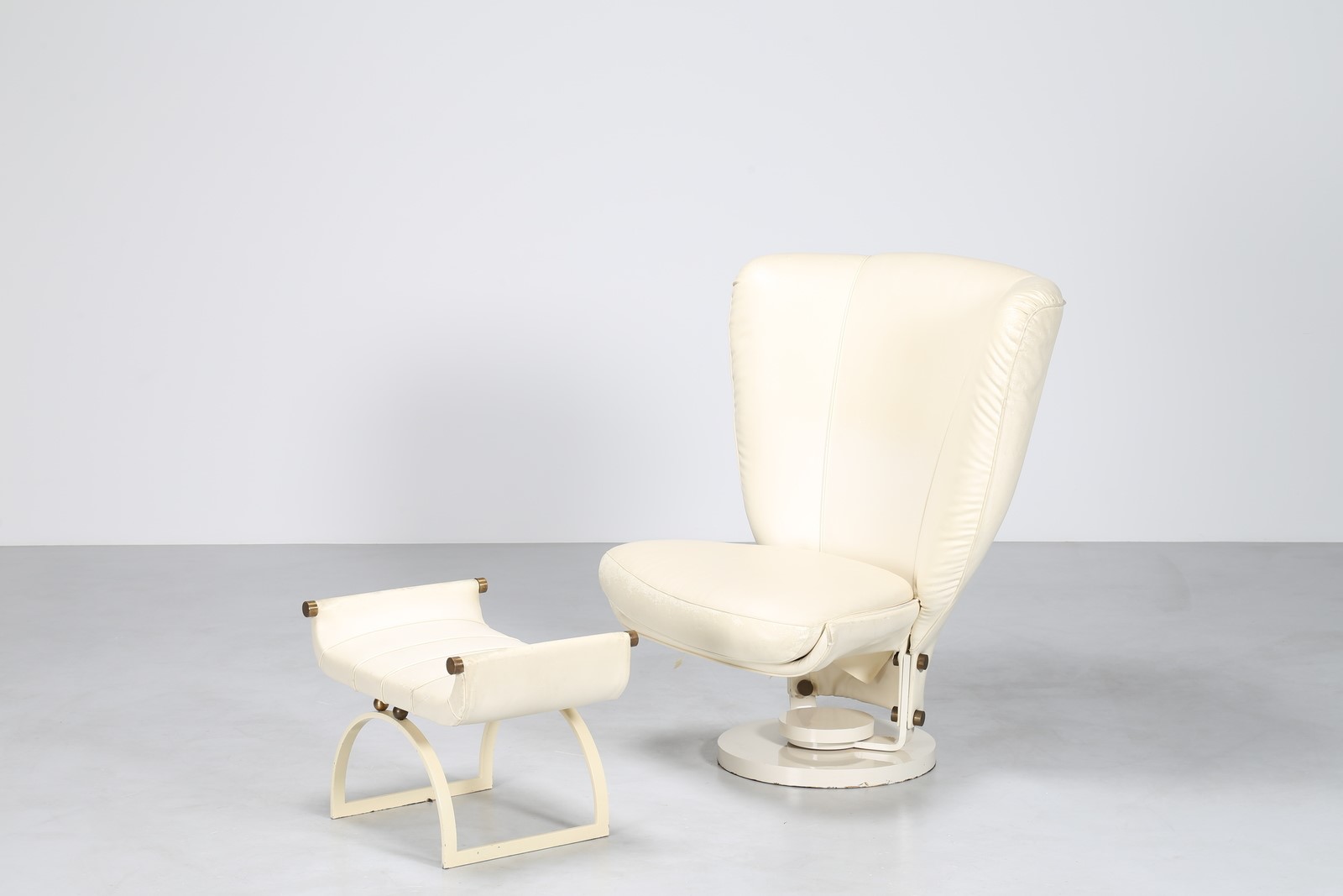 CECCHI MARZIO Poltrona e pouf in metallo laccato, ottone e pelle prod. MOST FIRENZE, arredo per casa Magnoni Firenze, anni 70. . -. Cm 100,00 x 112,00 x 92,00. Misure pouf: 45x64x44