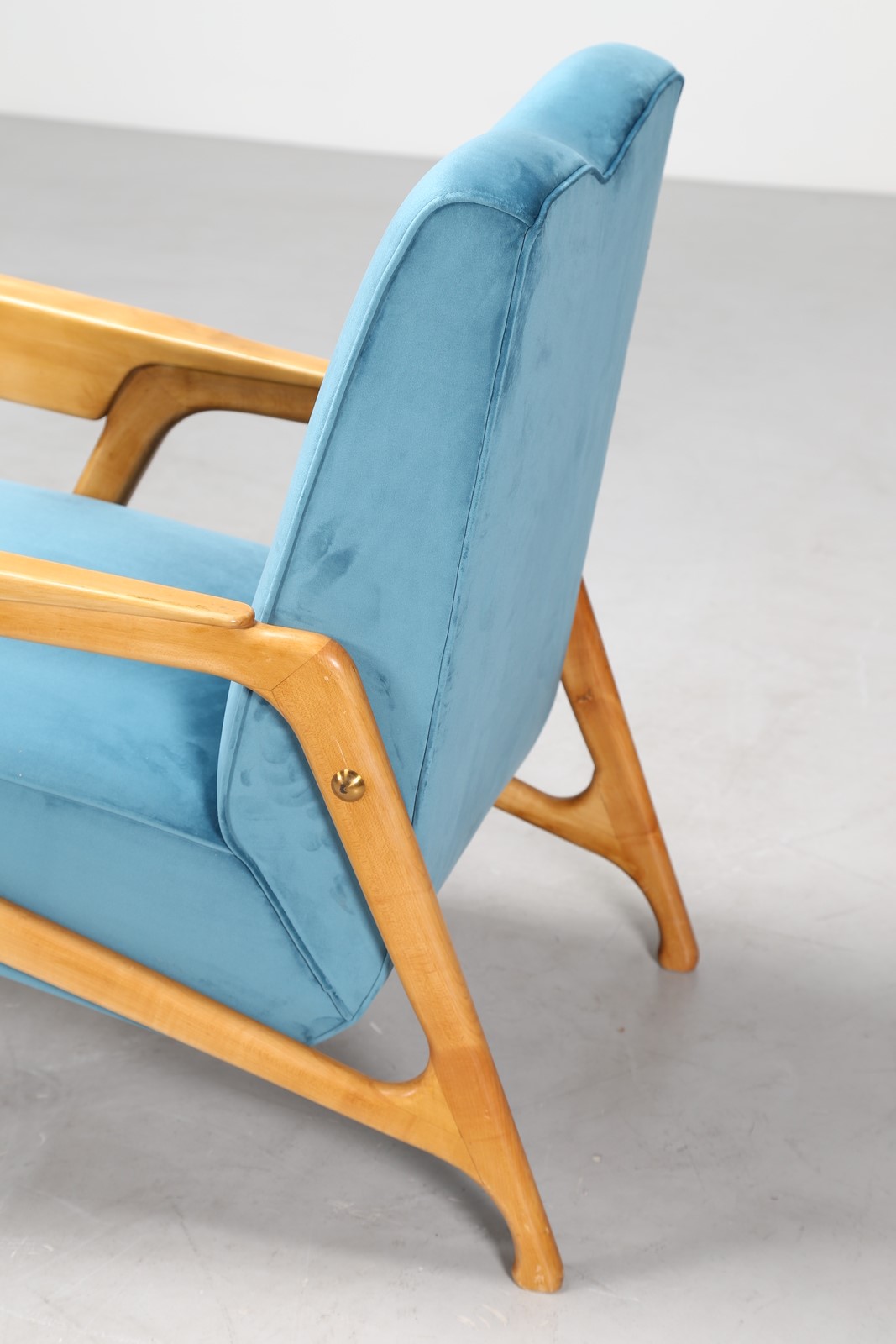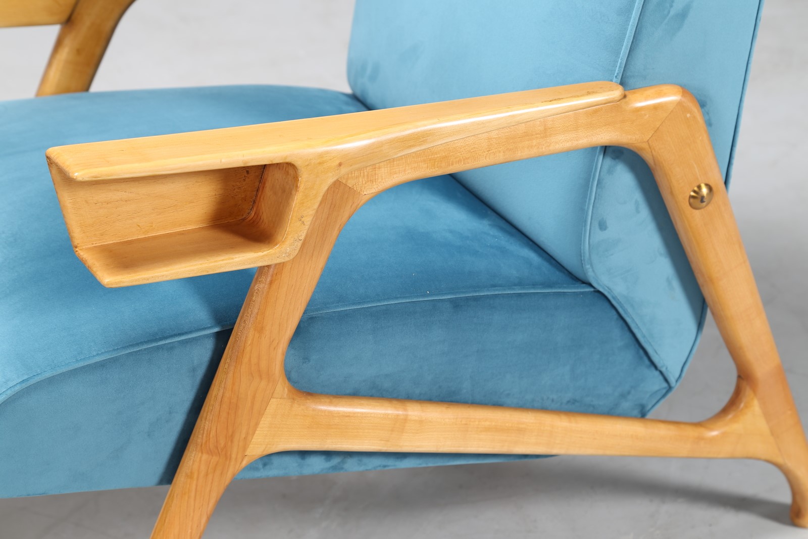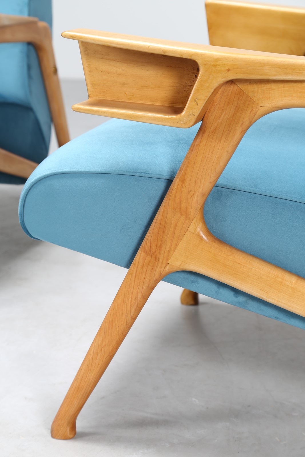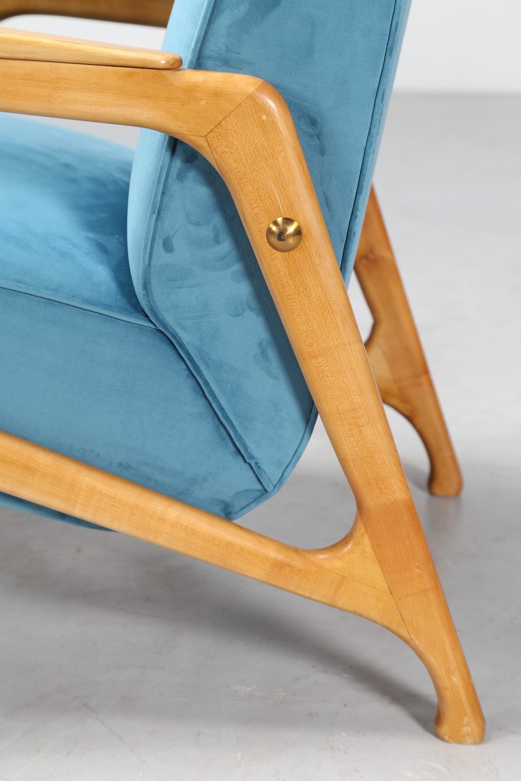 ROMANO AUGUSTO Coppia di poltrone in acero e tessuto, variante del modello...