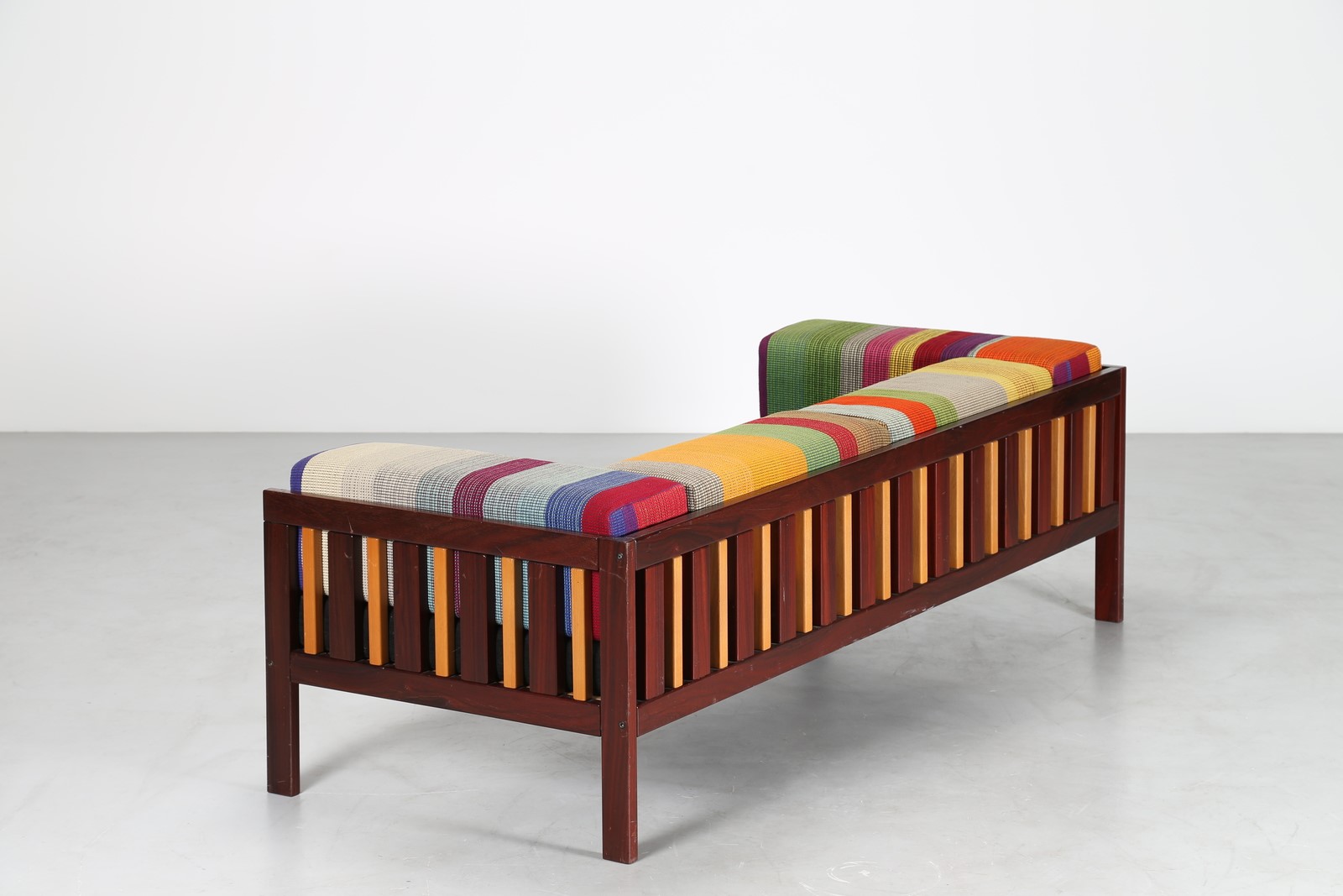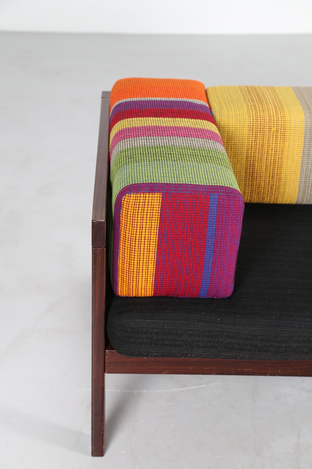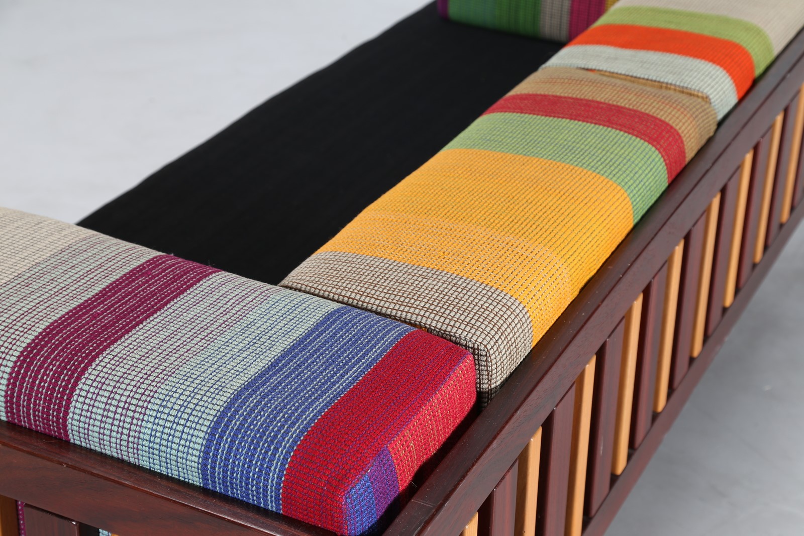 SOTTSASS ETTORE (1917 - 2007) Divano in mogano e faggio, rivestimento in tessuto mod. Califfo, per Poltronova, Italia, 1965. Pubblicazioni; Domus n. 433 dicembre 1965 pag. 41; Domus n. 442 settembre 1966 pag. 27. . -. Cm 200,00 x 64,00 x 84,00.