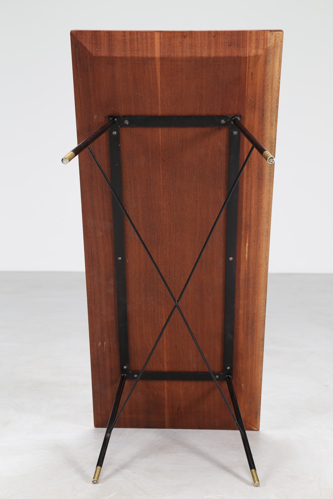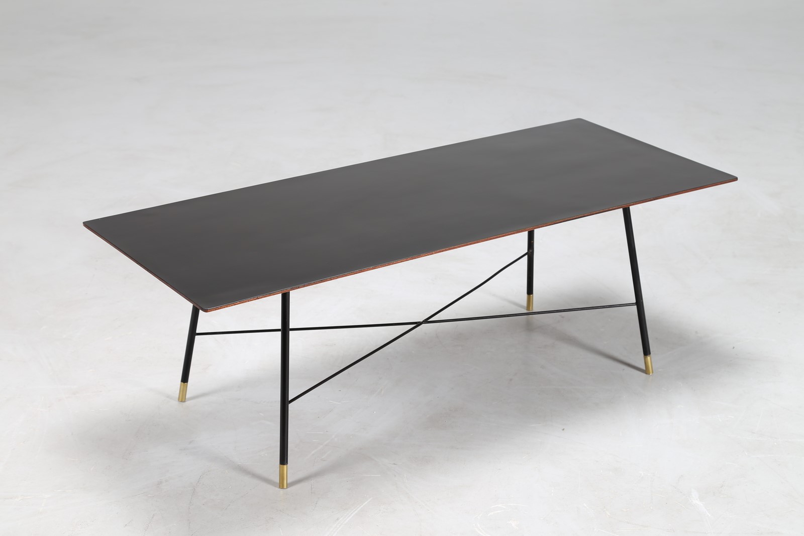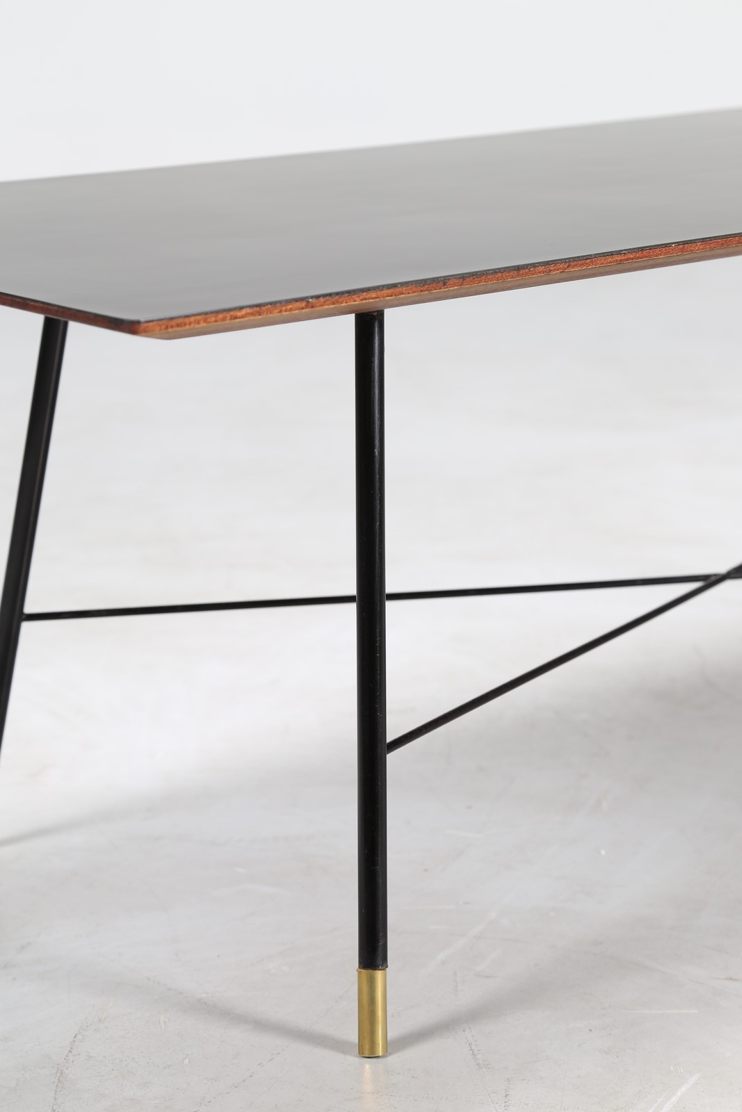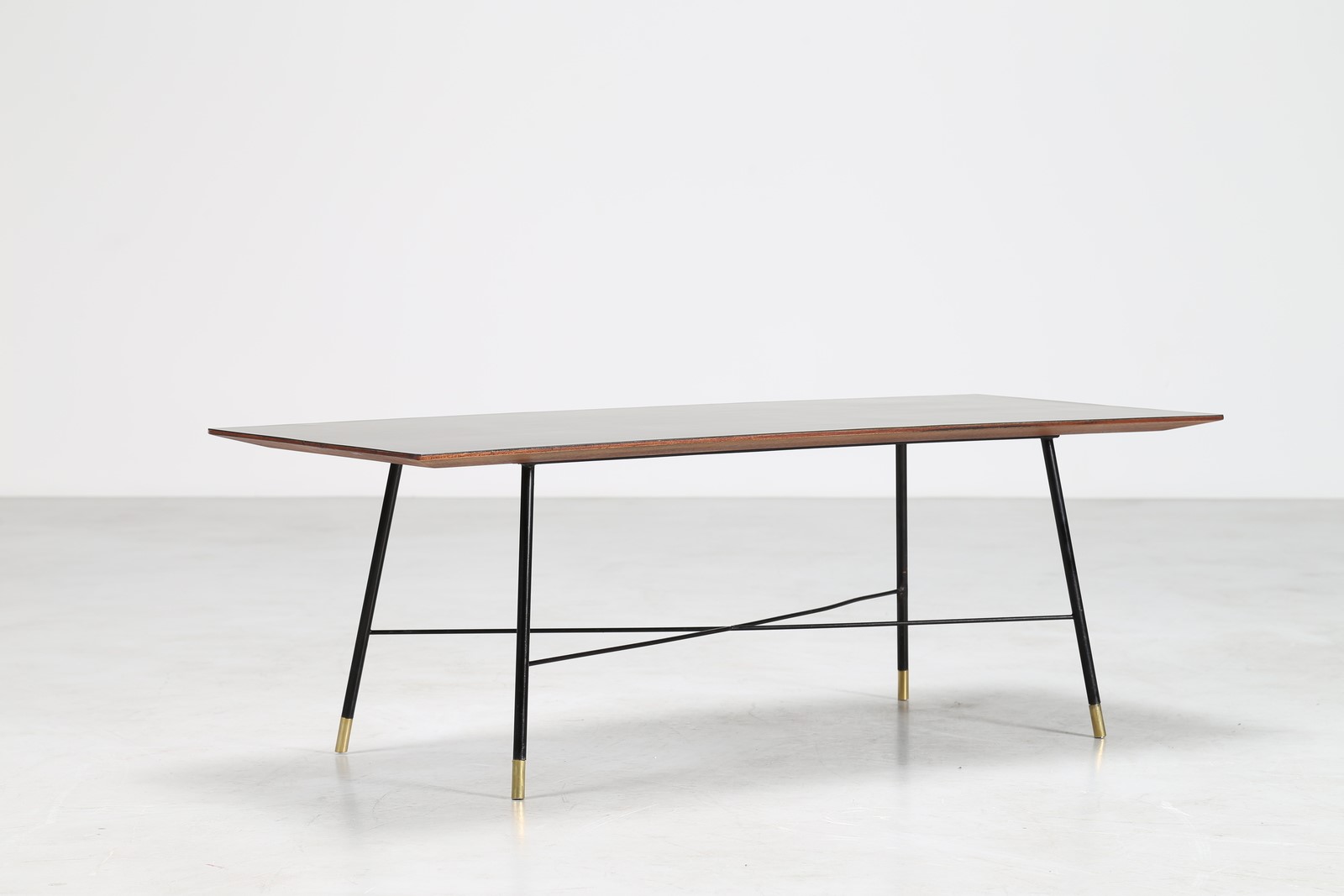 PARISI ICO (1916 - 1996) Tavolino rettangolare in tondino di ferro con finali in ottone e piano in legno e laminato, mod. 735 per Cassina, anni 50. Pubblicazioni; Repertorio 1950-1980, Immagini e contributi per una storia dell'arredo italiano di Giuliana Gramigna (Autore), Gillo Dorfles (Autore), Giuseppe Chigiotti (Autore), Pier Carlo Santini (Autore), pag. 112 . -. Cm 110,00 x 38,00 x 46,00.