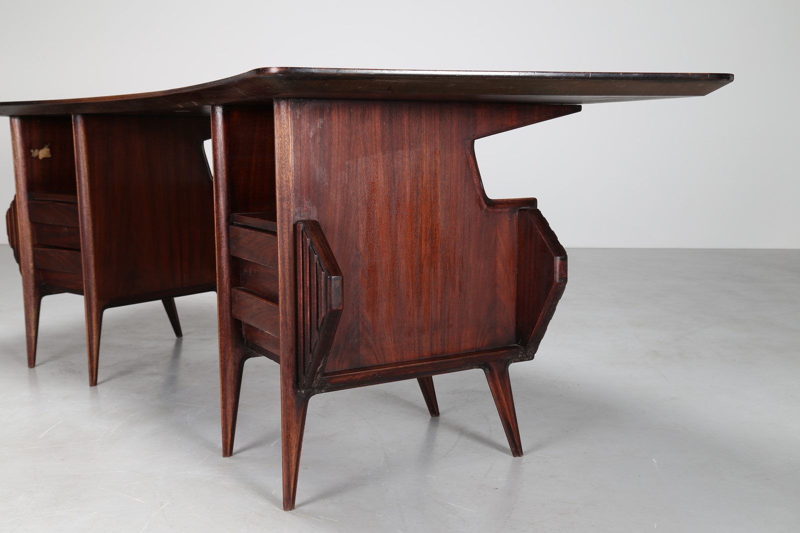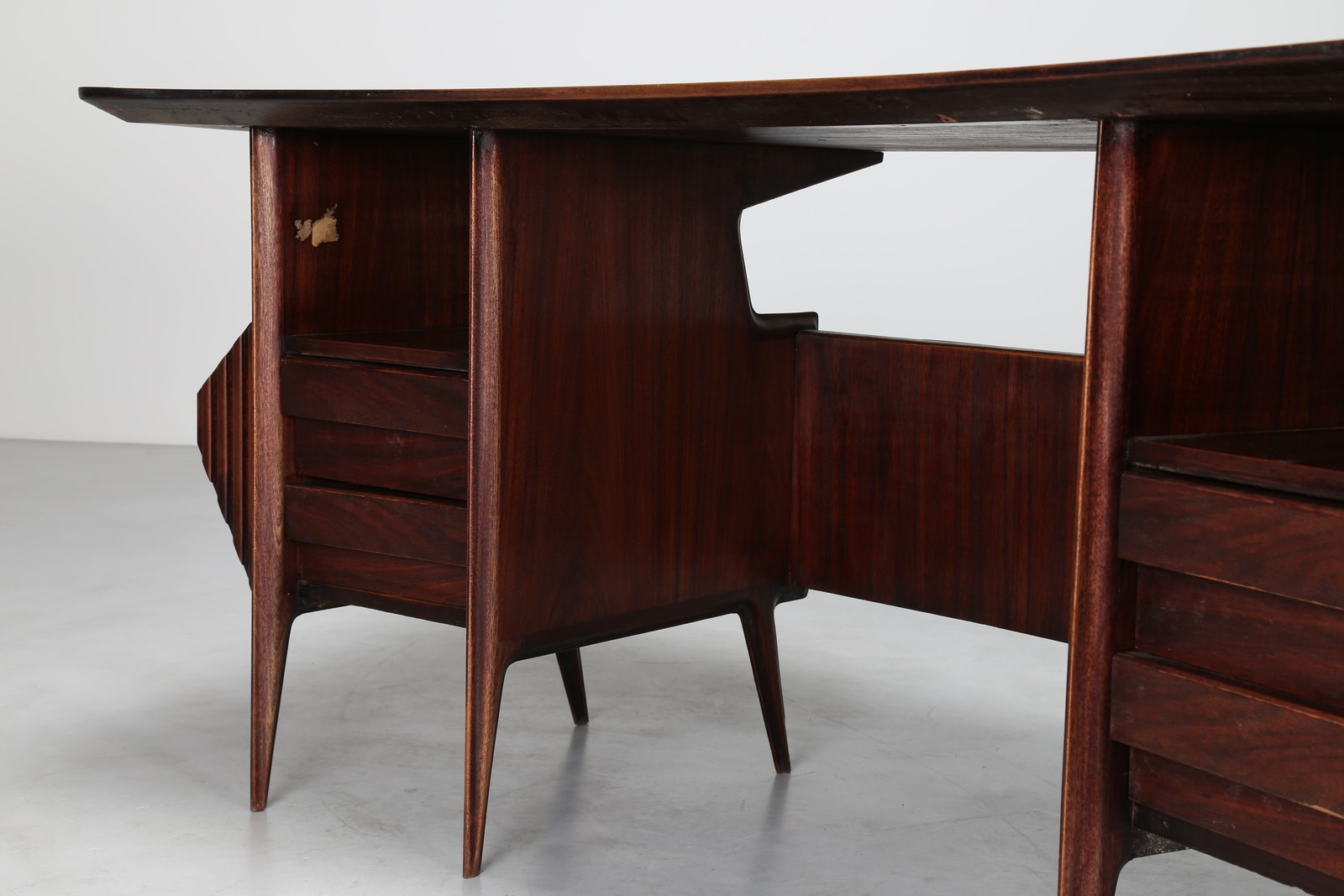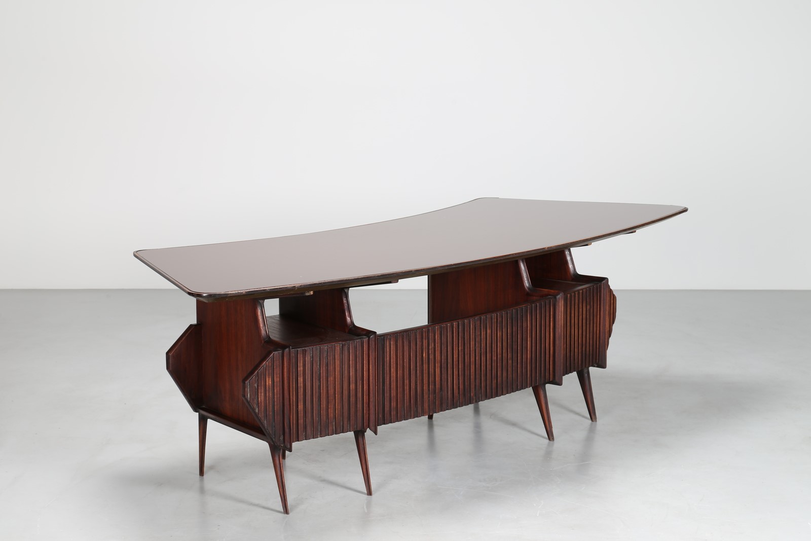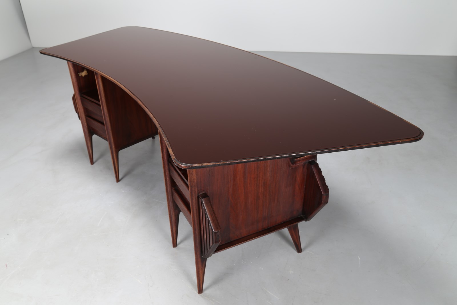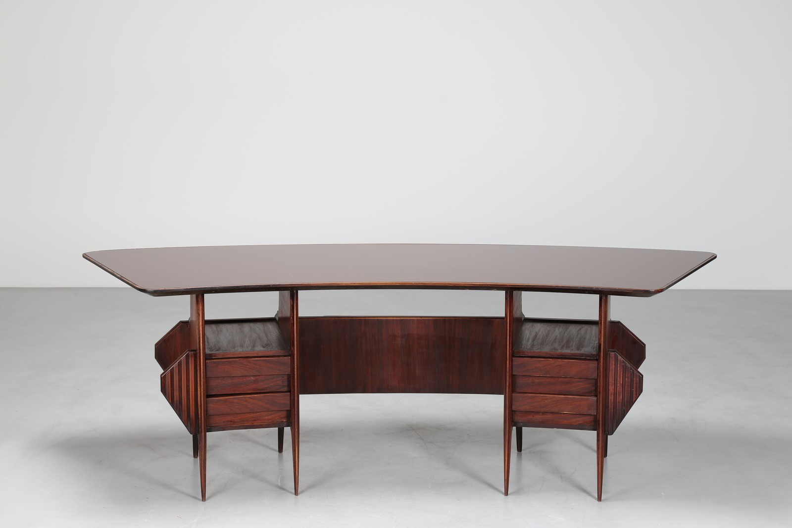 GOTTARDI MARIO Attrib. Scrivania a mmezza luna in palissandro con piano in vetro, escuzione Ebanisteria Brianzola, anni 50. . Cm 240,00 x 79,00 x 89,00.