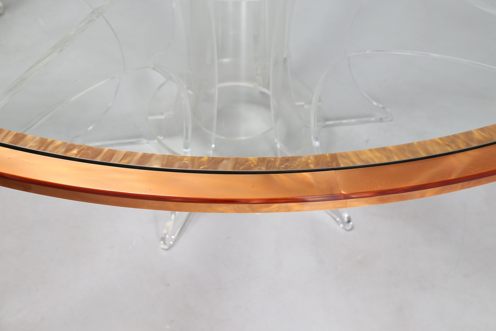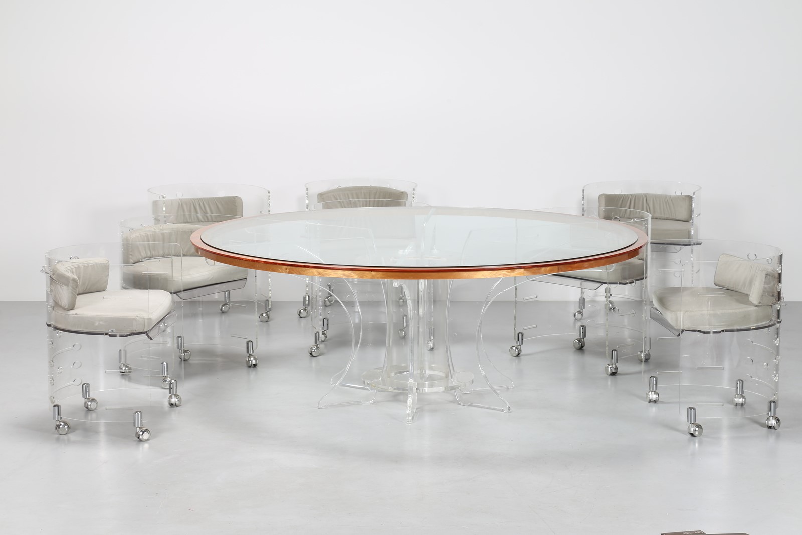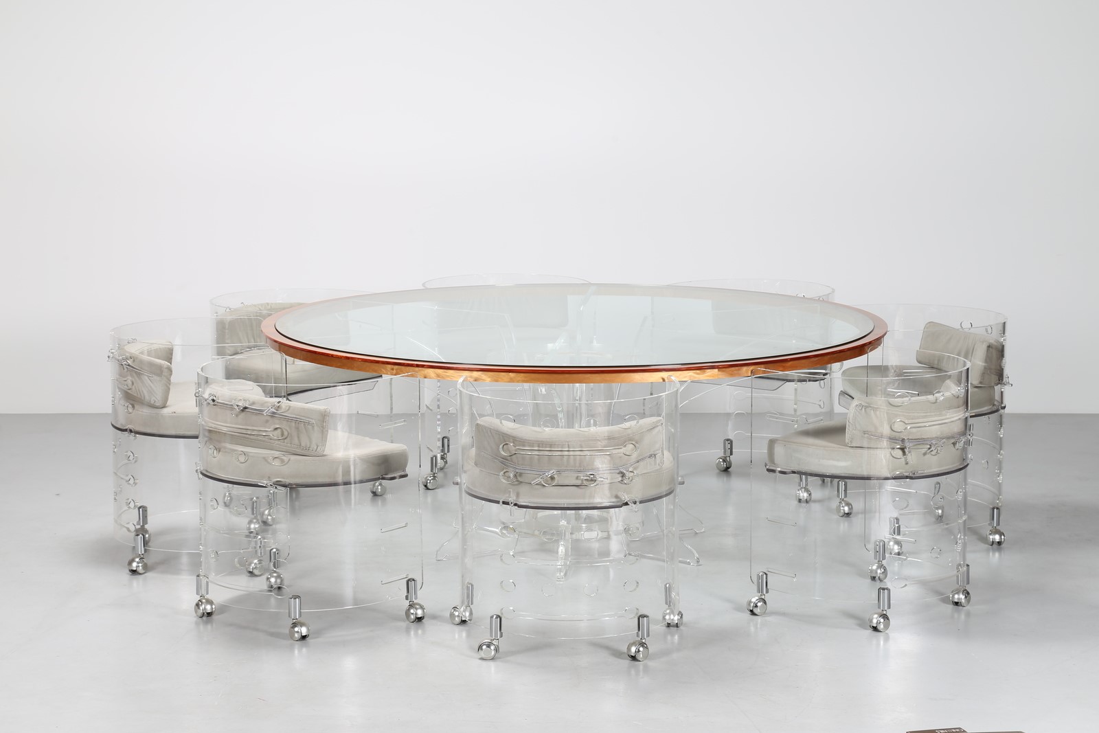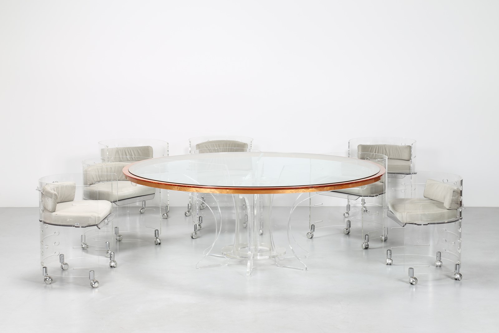 DI PILLA LUCIANO Tavolo rotondo in plexiglass e vetro, con otto poltroncine...
