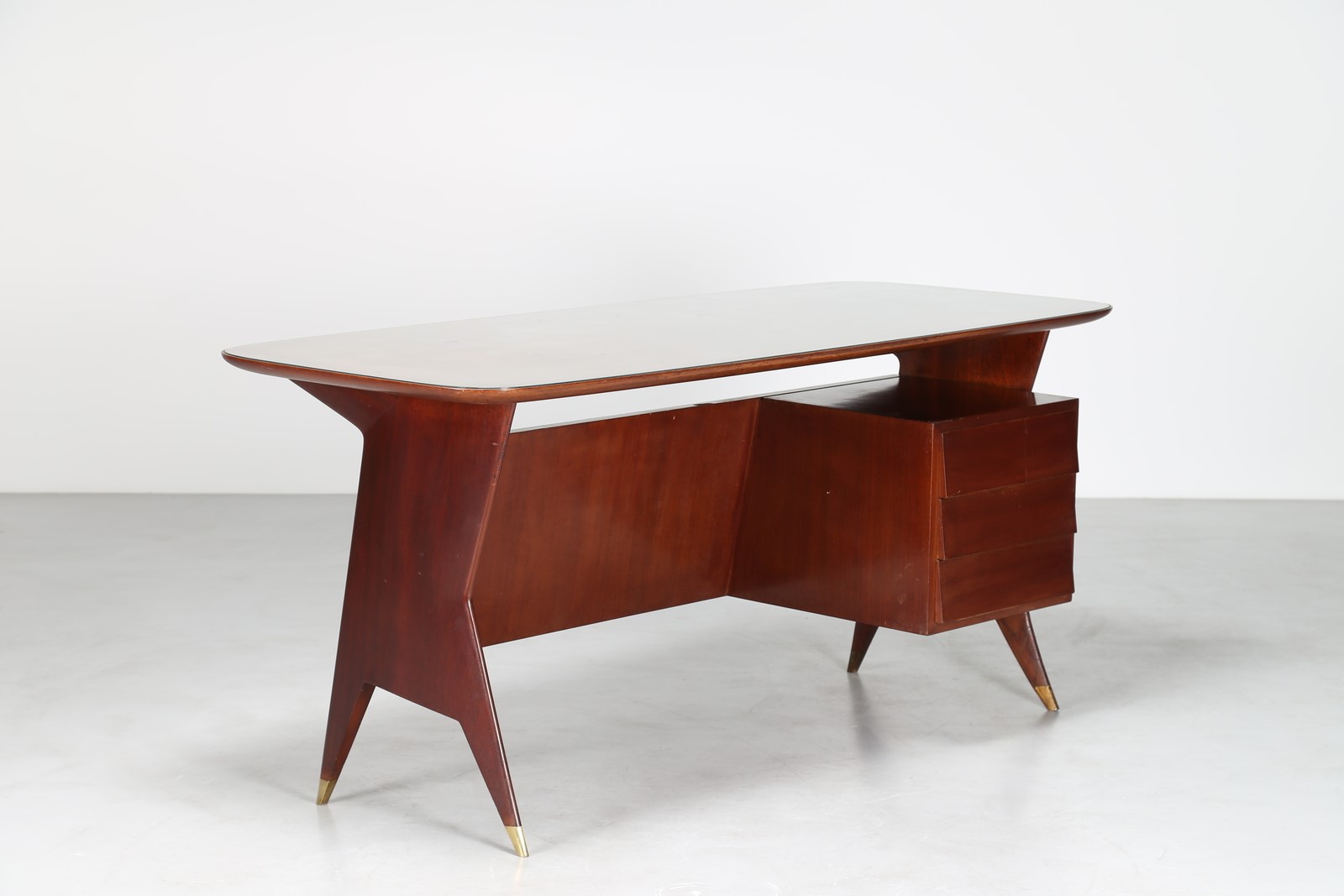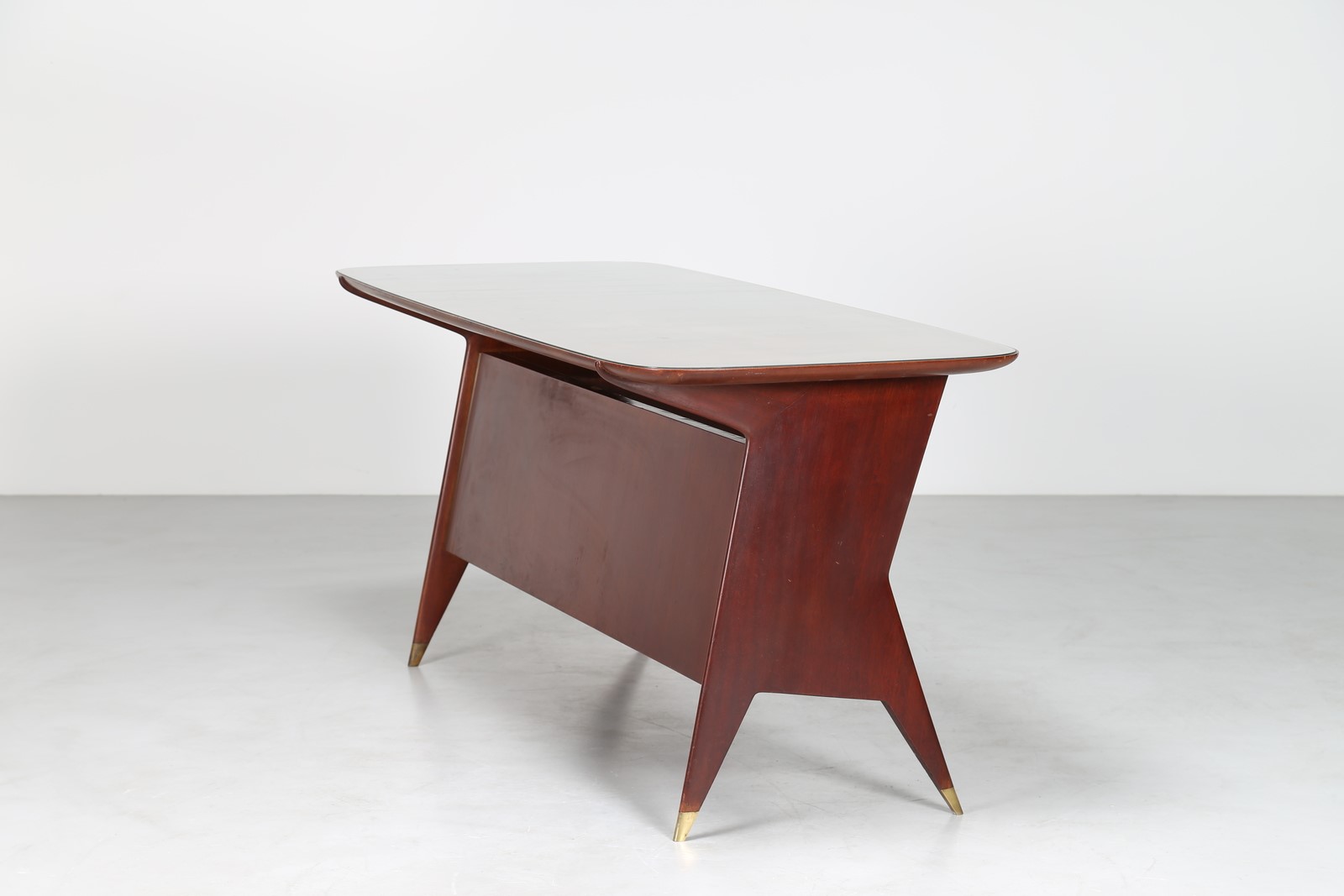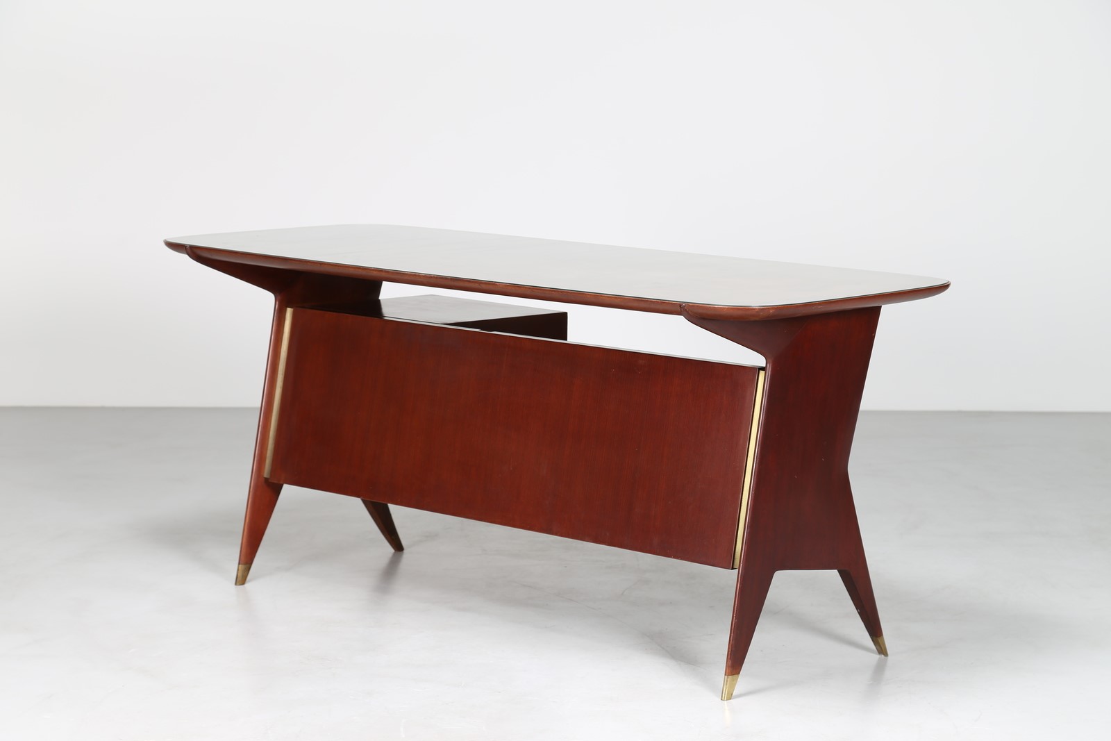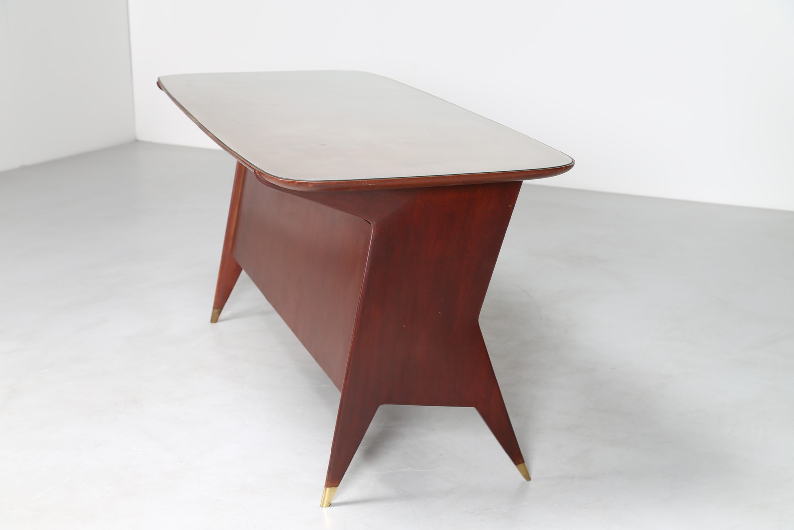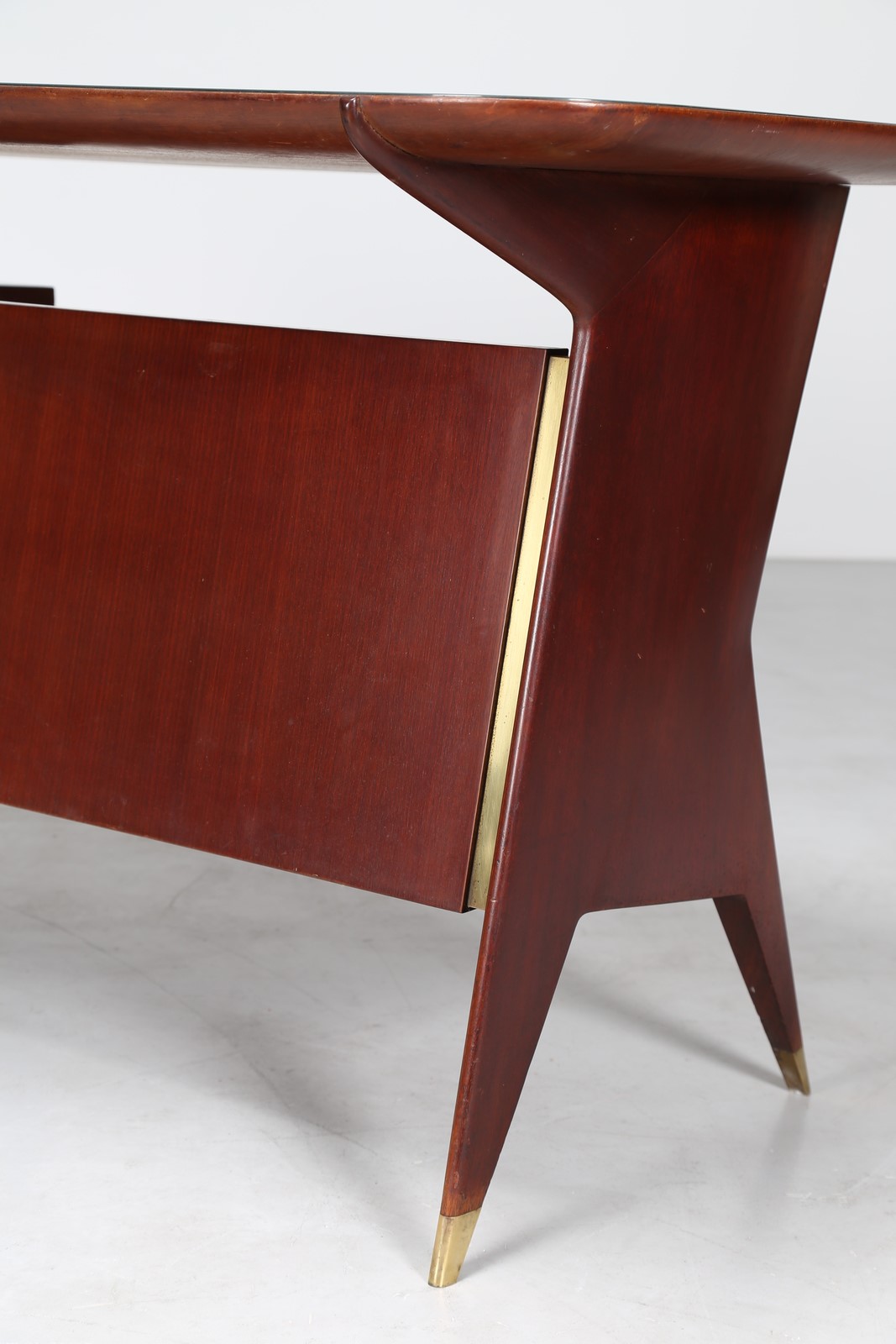 PONTI GIO' (1891 - 1979) Scrivania in palissandro con piano in vetro e dettagli in ottone, esecuzione Antonio Proserpio e Figli, Barzanò Brianza, anni 50. Collezione privata. Pubblicazioni; esempio a due montanti, Domus num. 228 settembre 1948 pag. 22,23. . -. Cm 180,50 x 79,00 x 75,00. Expertise a cura di Salvatore Licitra - Archivio Giò Ponti, Milano.