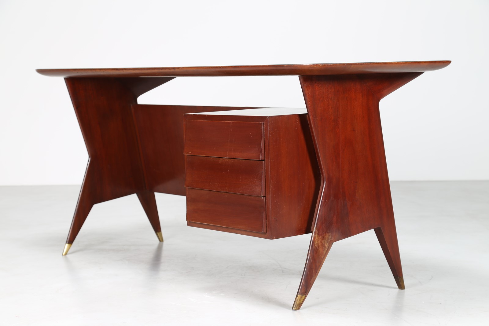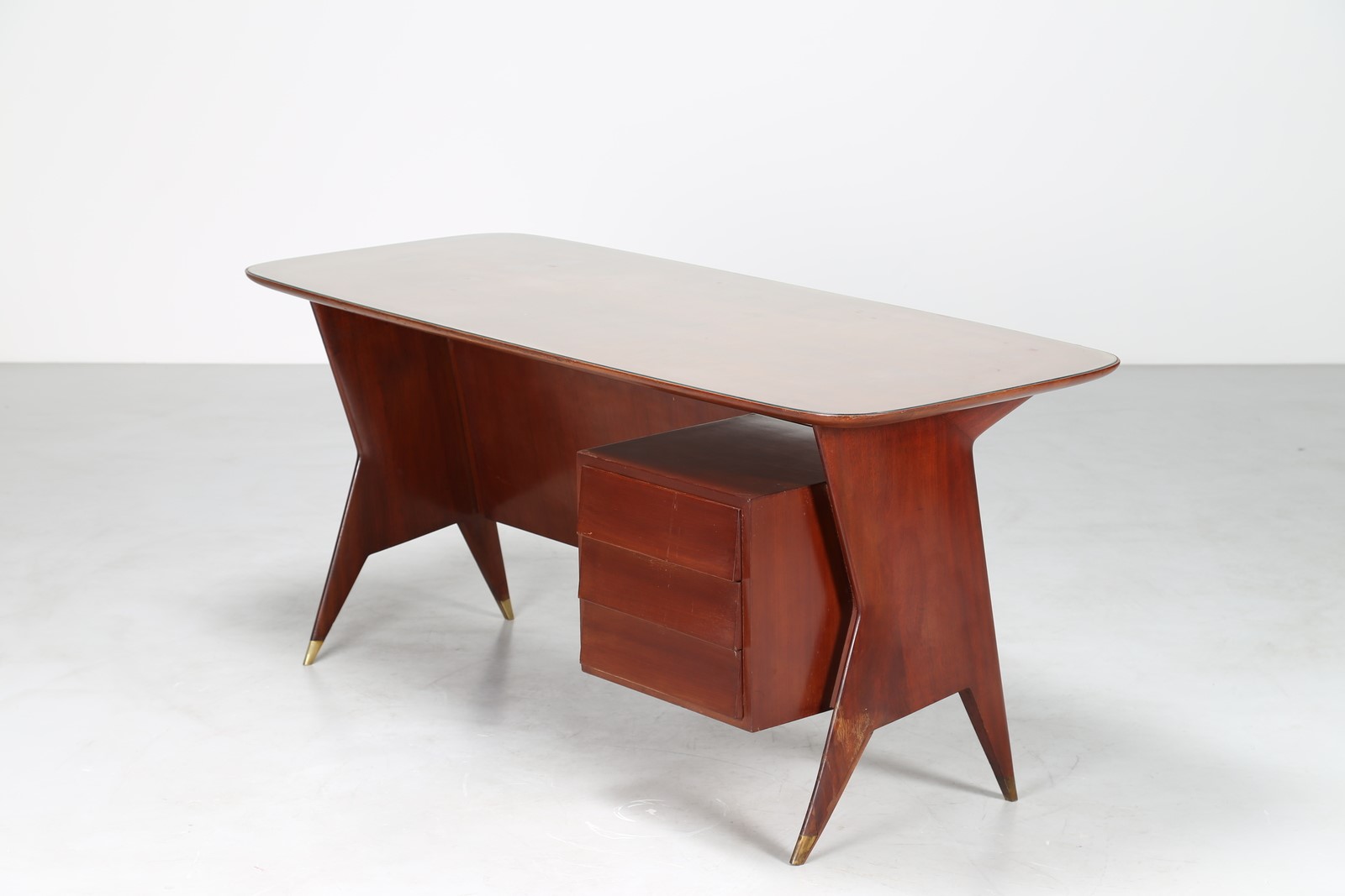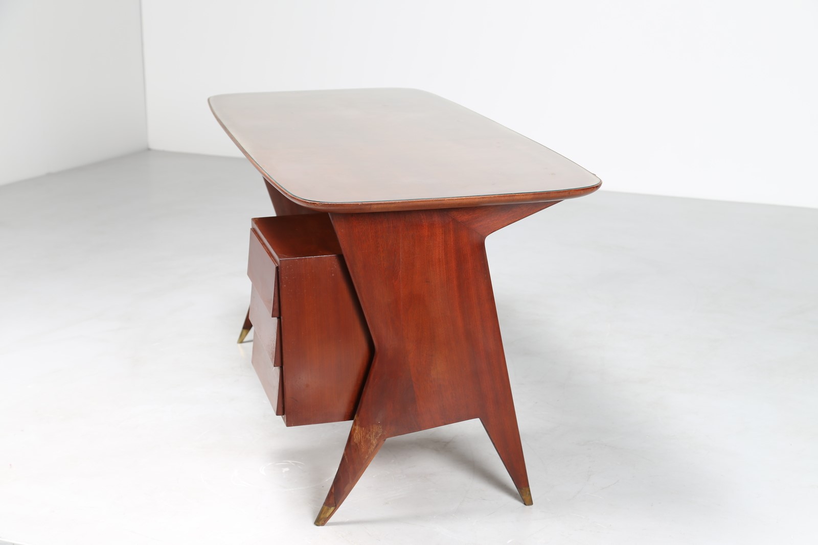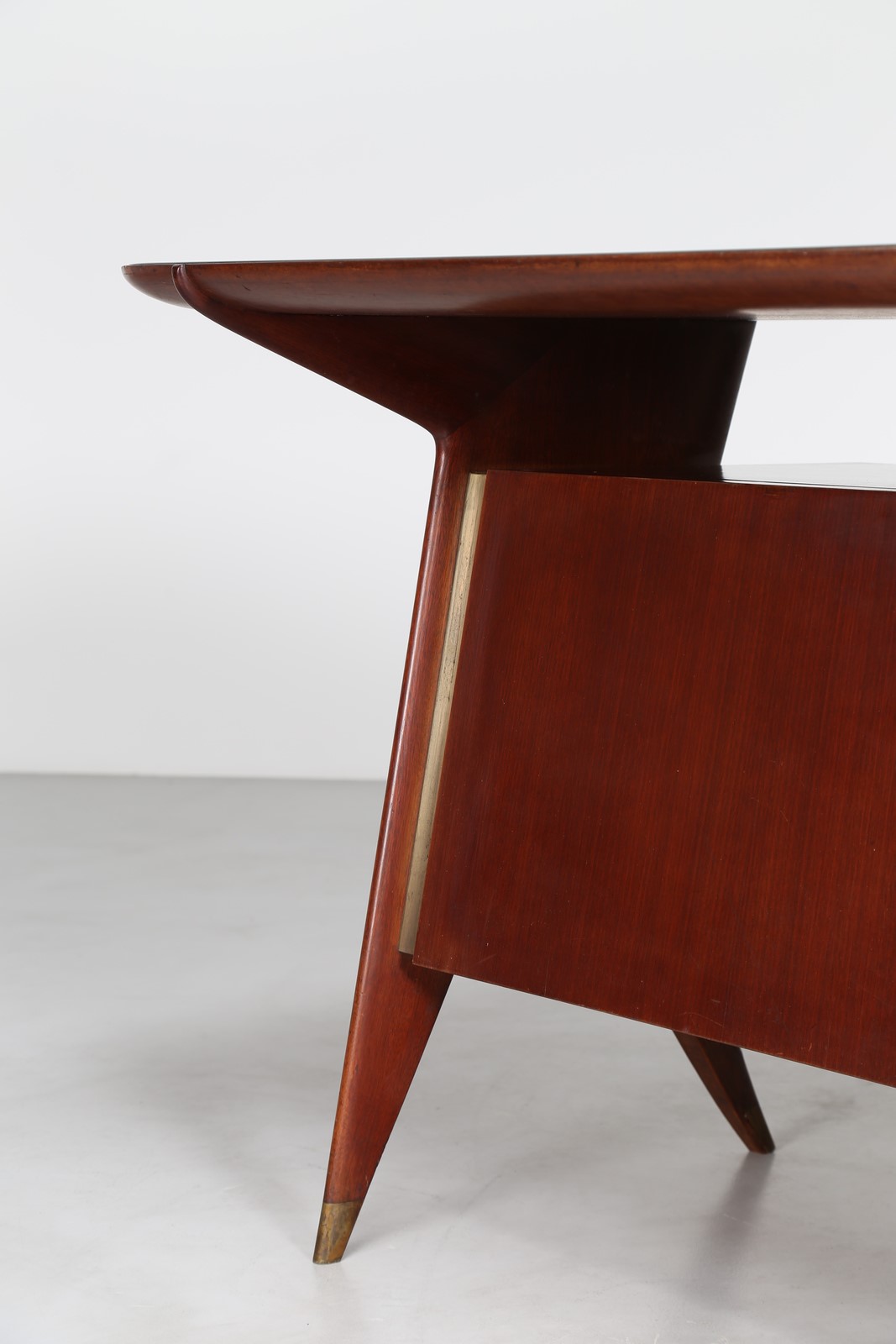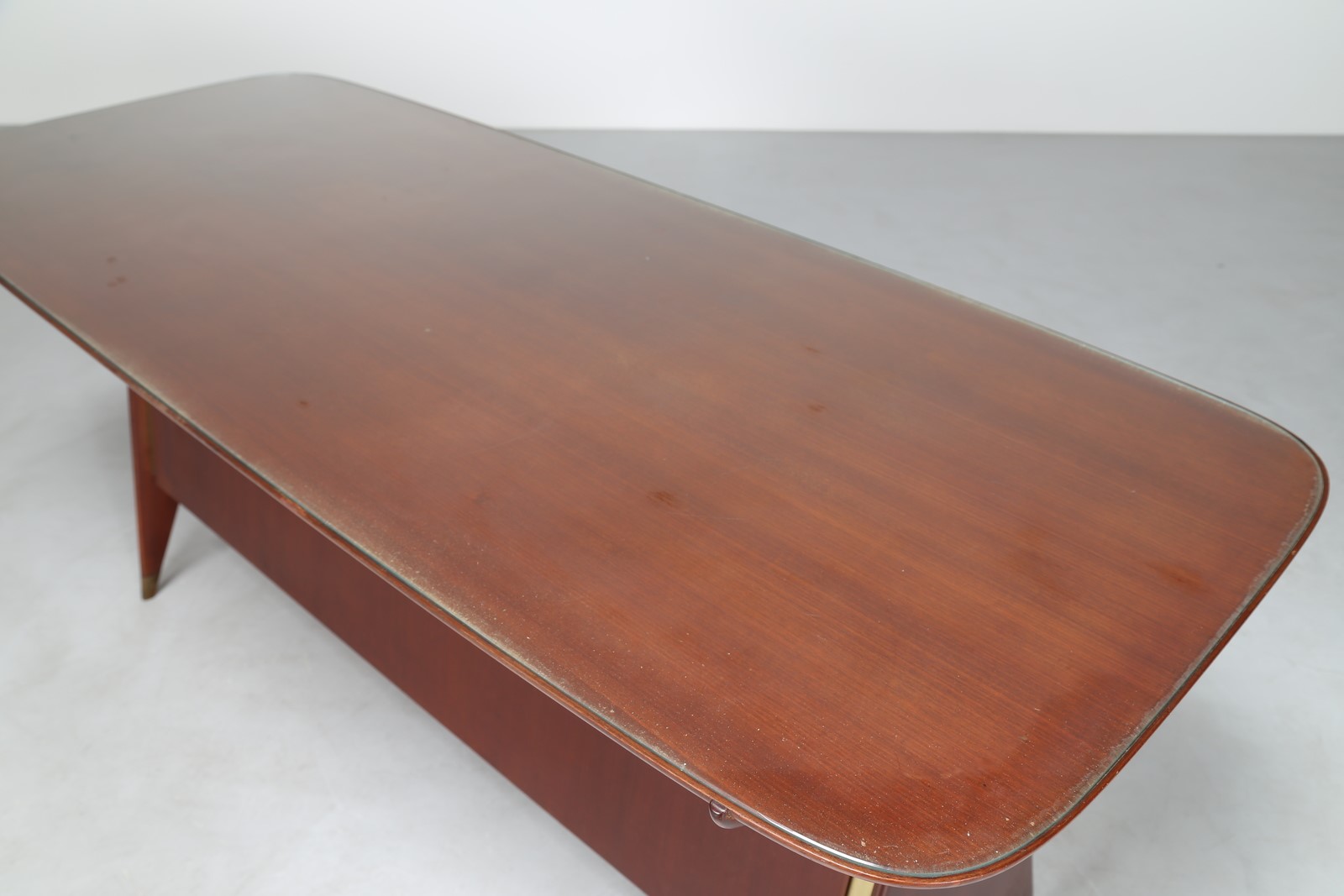 PONTI GIO' (1891 - 1979) Scrivania in palissandro con piano in vetro e dettagli in ottone, esecuzione Antonio Proserpio e Figli, Barzanò Brianza, anni 50. Collezione privata. Pubblicazioni; esempio a due montanti, Domus num. 228 settembre 1948 pag. 22,23. . -. Cm 180,50 x 79,00 x 75,00. Expertise a cura di Salvatore Licitra - Archivio Giò Ponti, Milano.