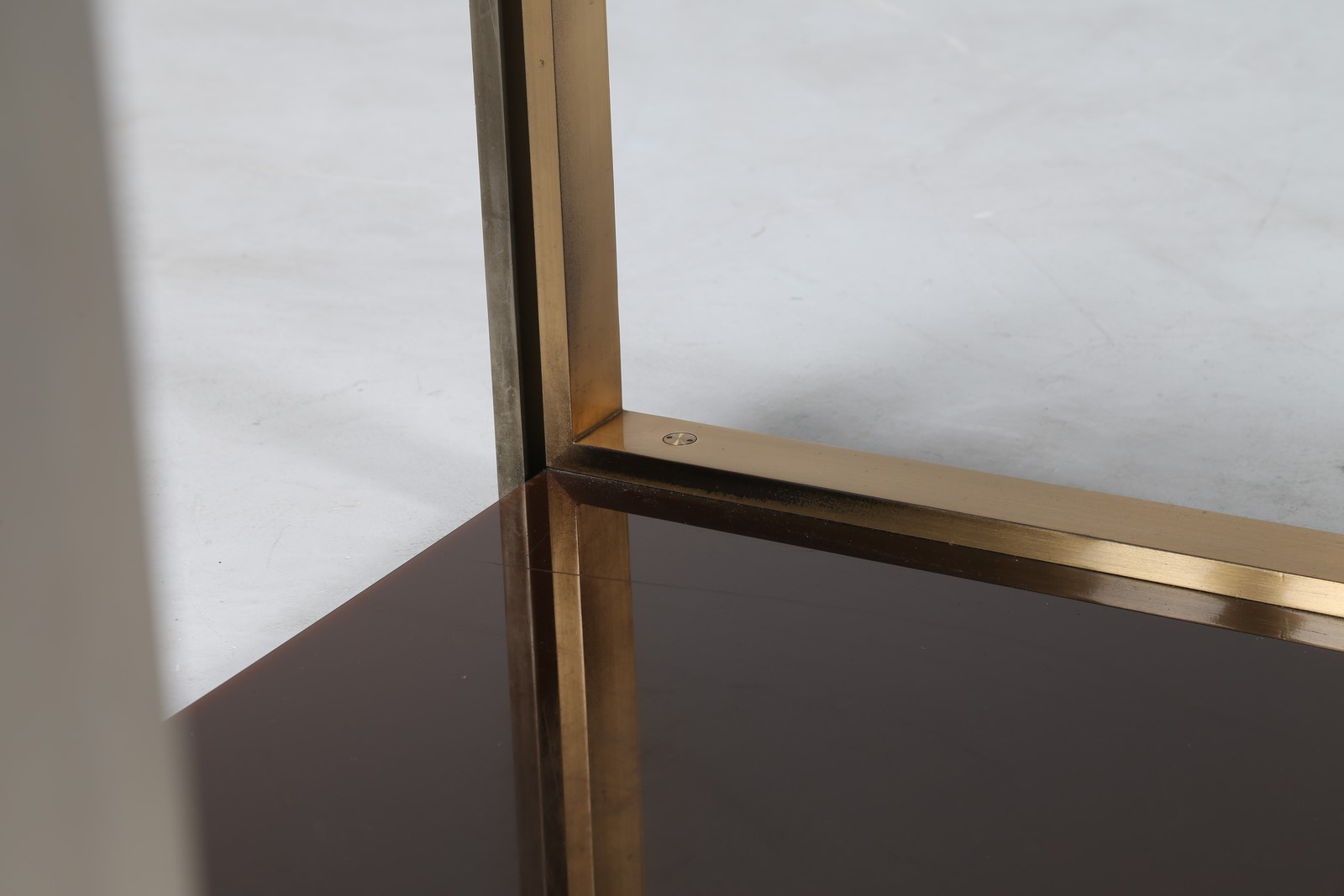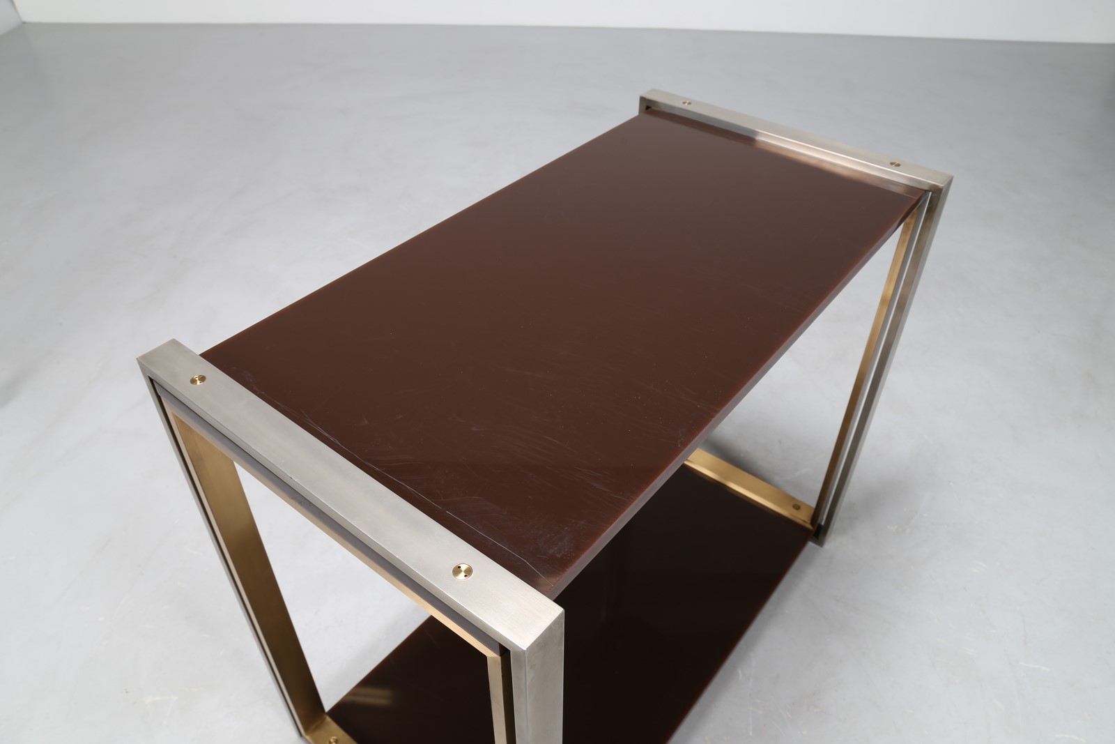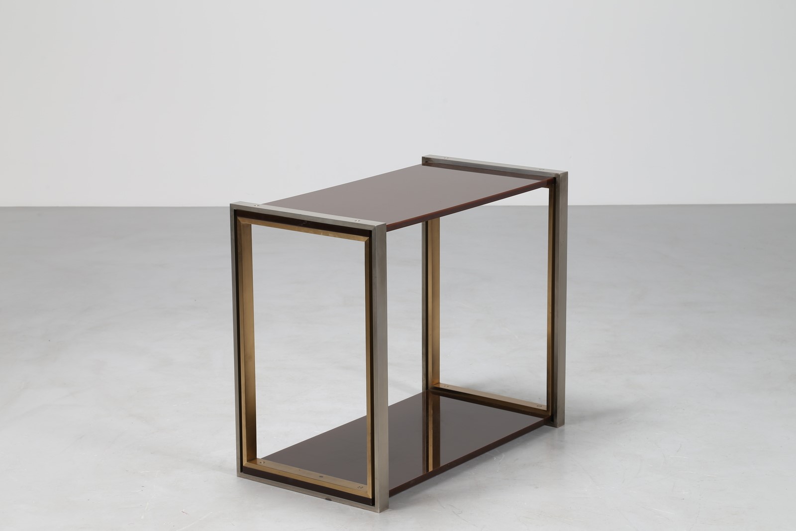 CORDERO TONI Etagere in acciaio ottone e plexiglass, disegnata ed eseguita per casa Pivanò in Torino 1973. . -. Cm 95,00 x 80,00 x 51,50.