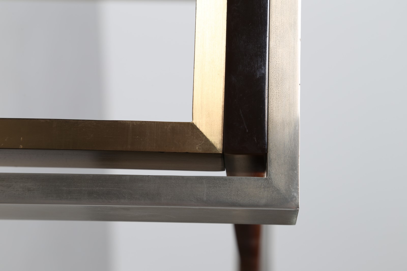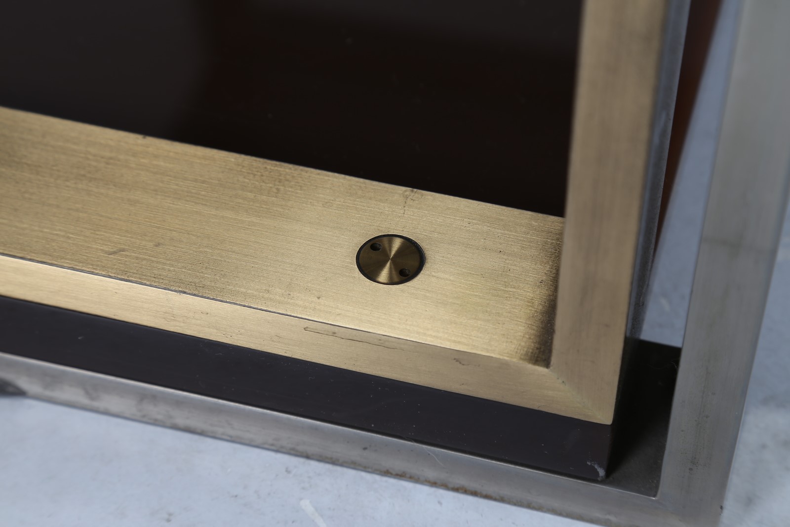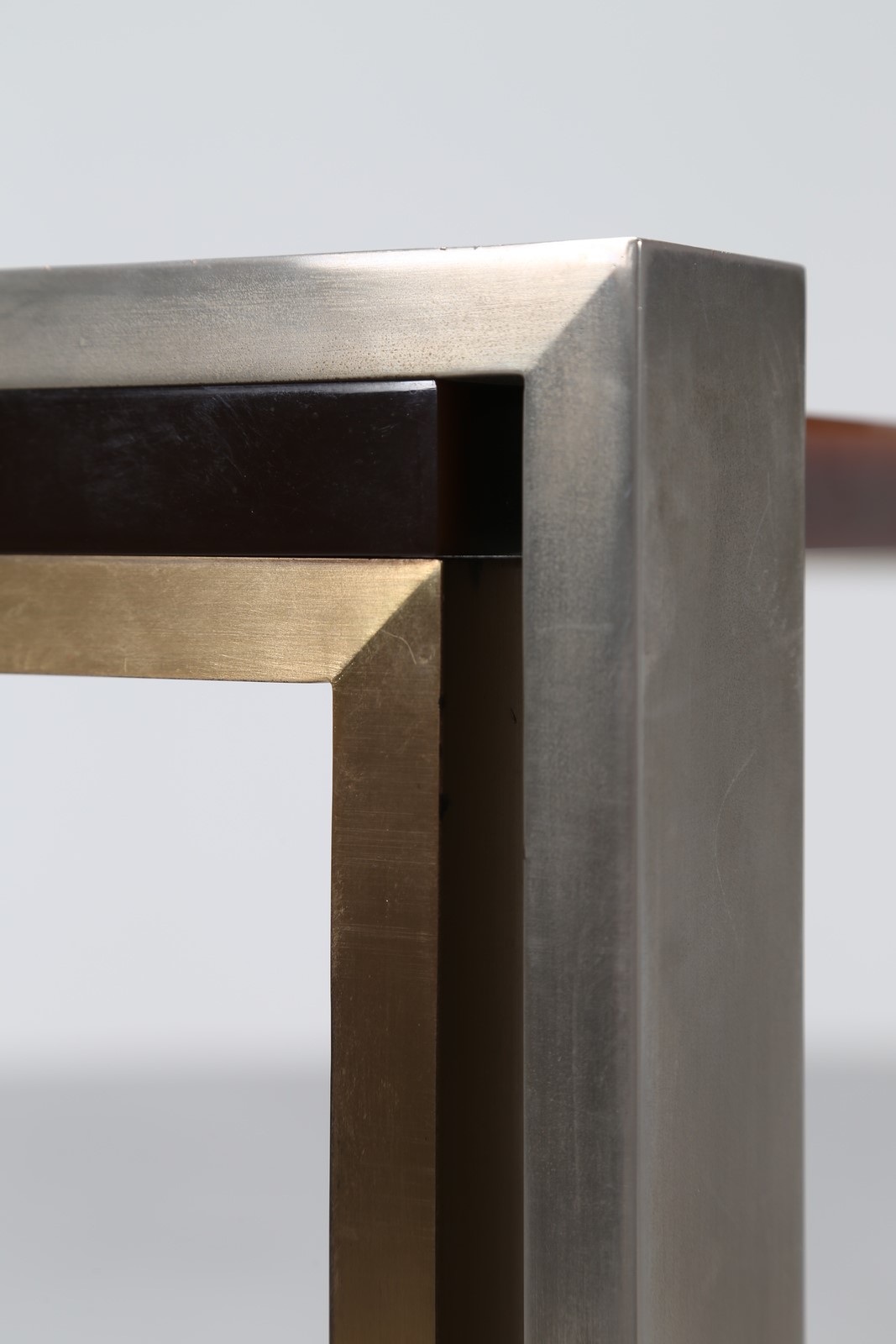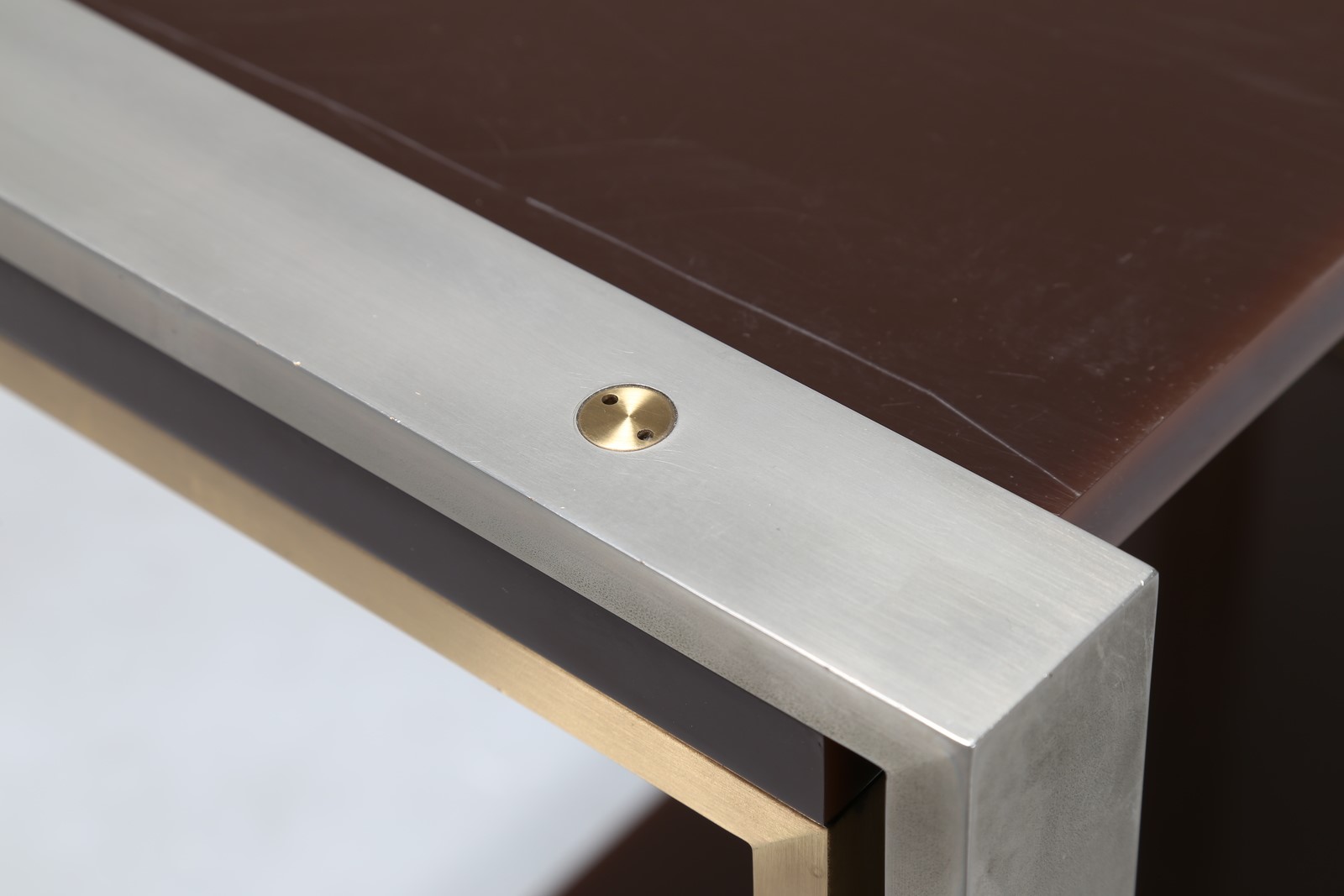 CORDERO TONI Etagere in acciaio ottone e plexiglass, disegnata ed eseguita per casa Pivanò in Torino 1973. . -. Cm 95,00 x 80,00 x 51,50.