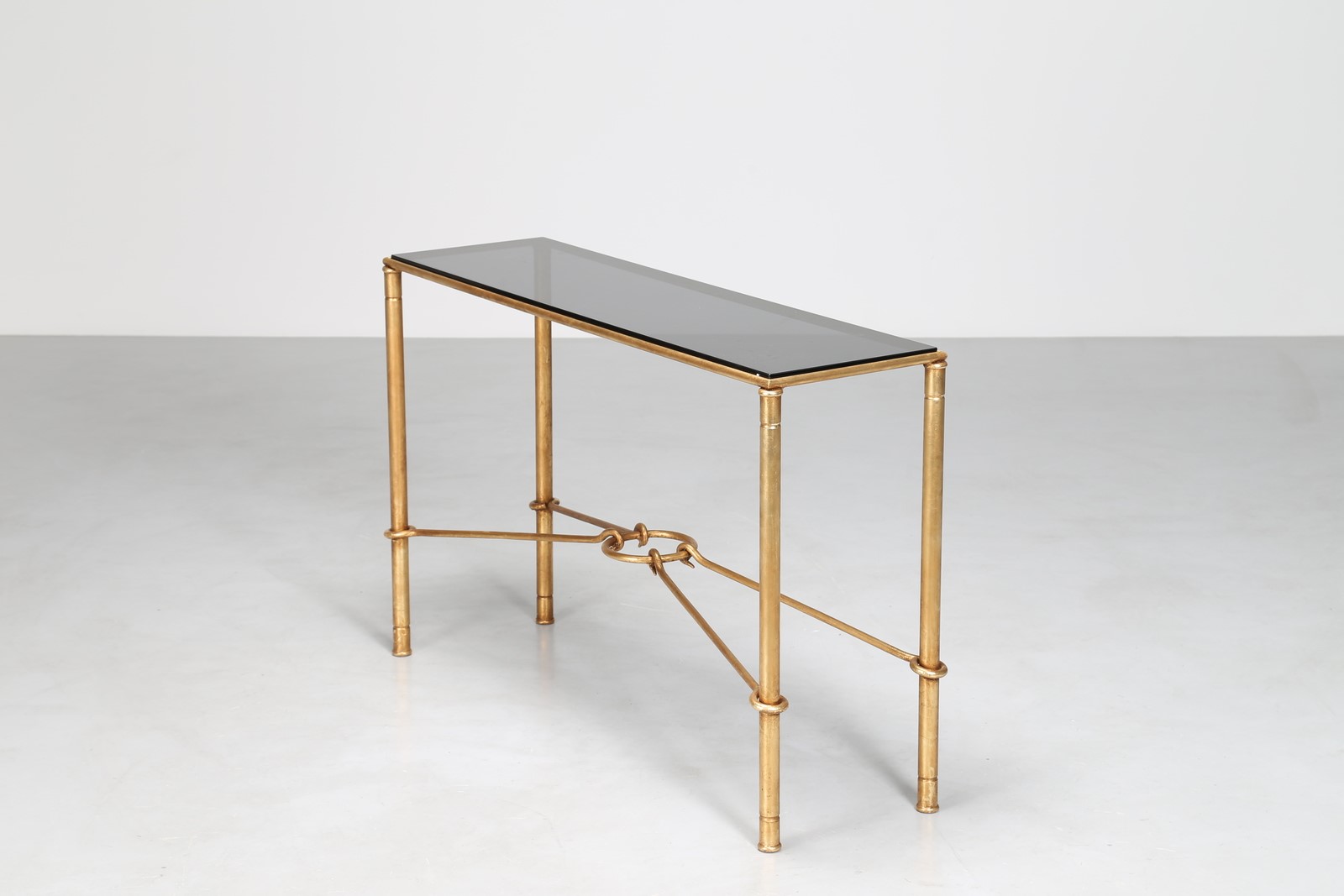 BANCI GIOVANNI Consolle in ferro dorato con piano in vetro, anni 70. -. Cm 129,00 x 80,00 x 40,00.