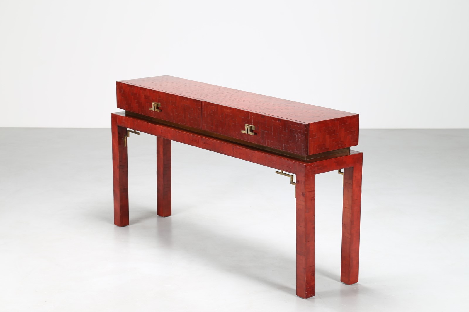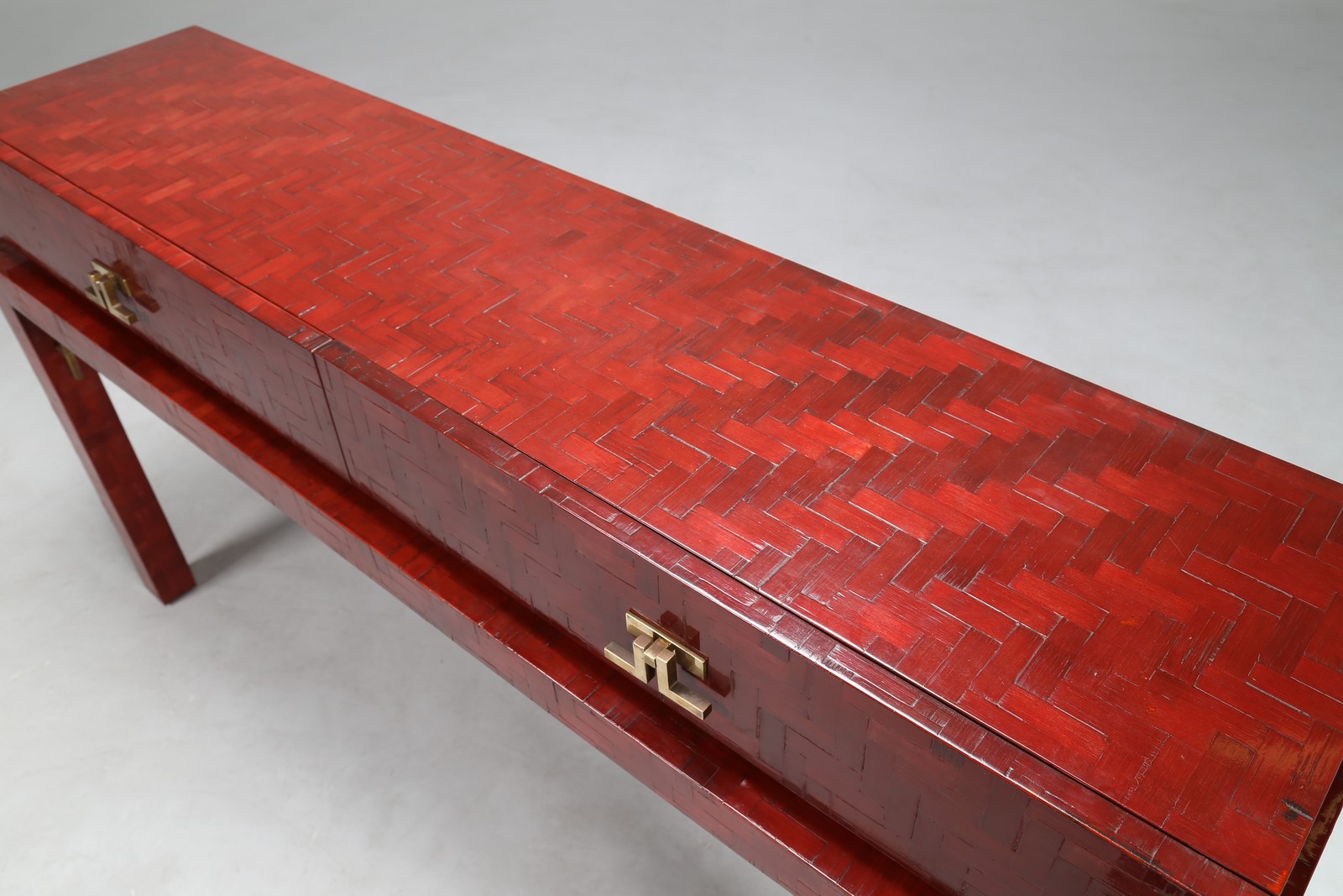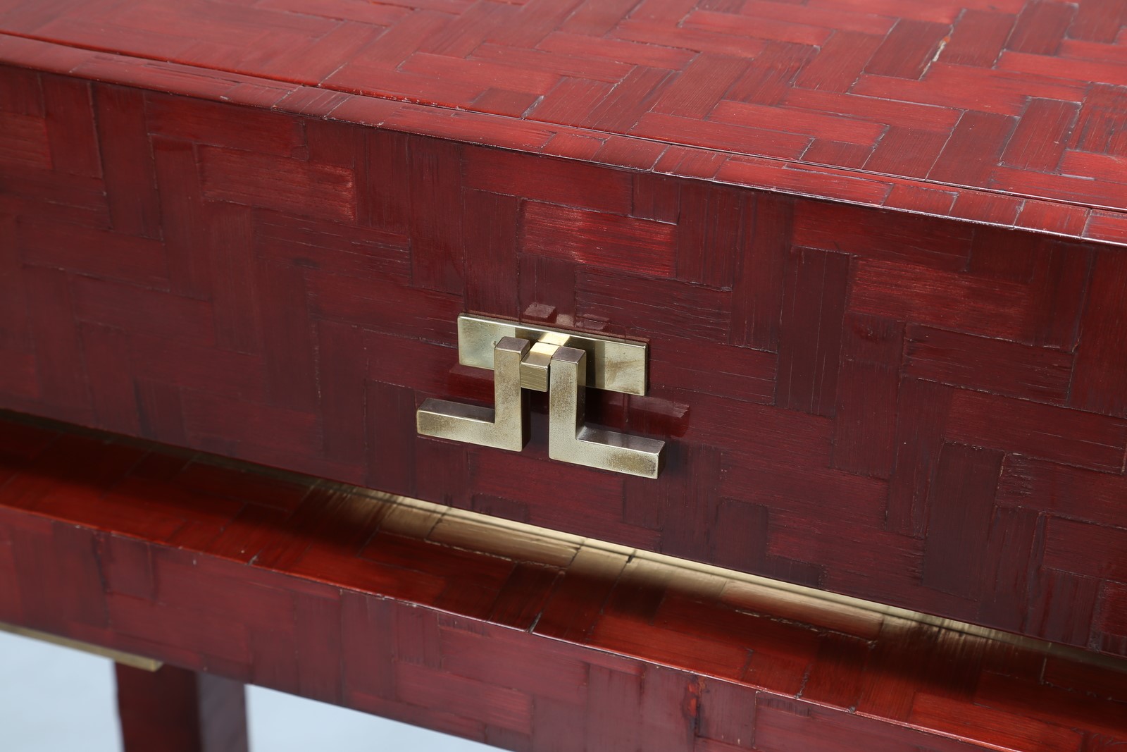 PETTI SANDRO Consolle con impiallicciatura a cesto in legno di banano laccato rosso per ANGOLOMETALART Roma, anni 70°. -. Cm 157,50 x 83,50 x 37,50.