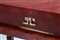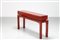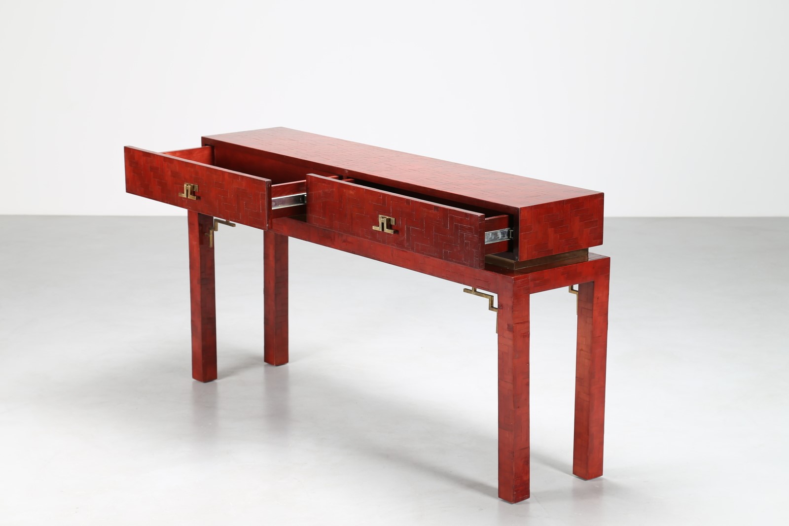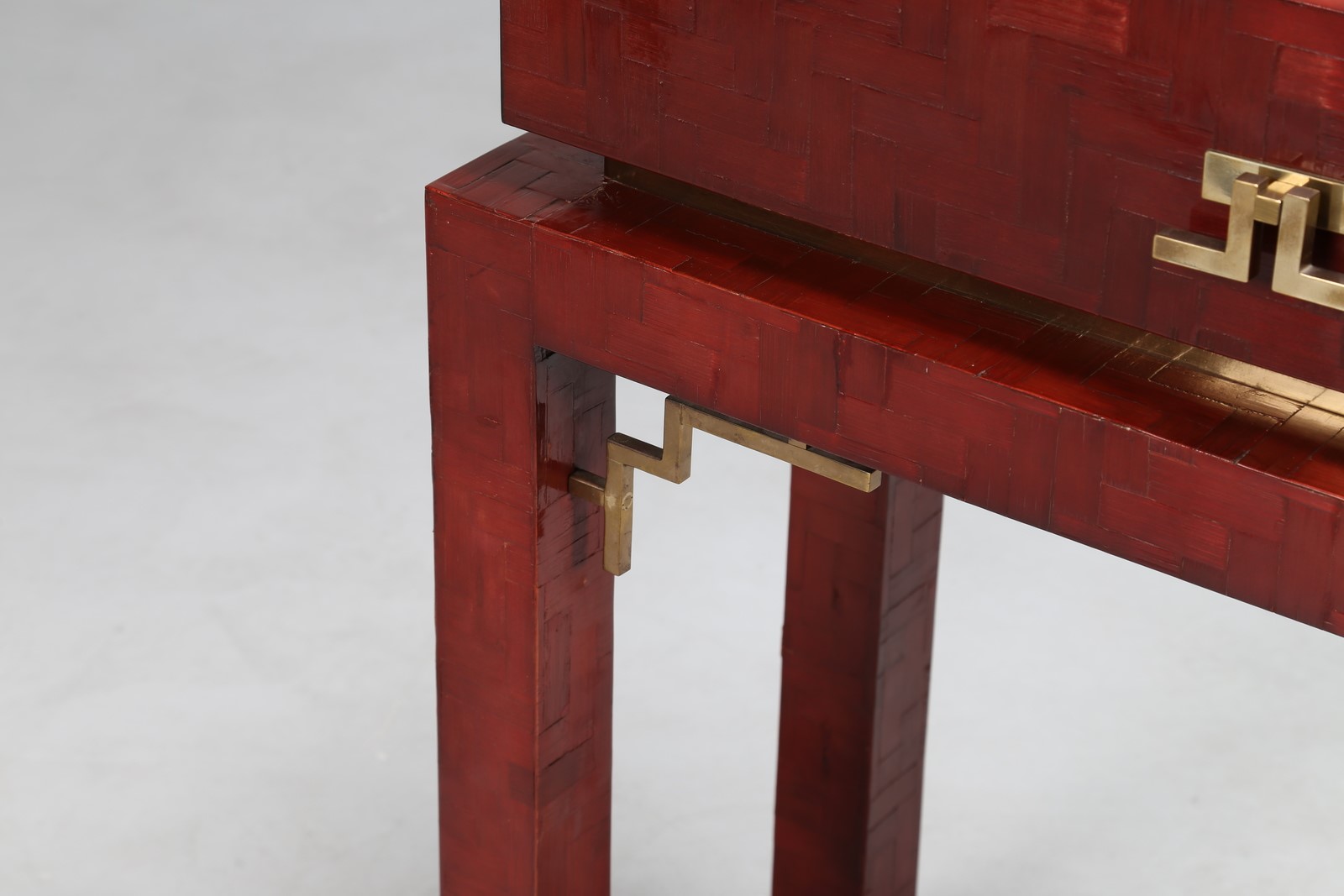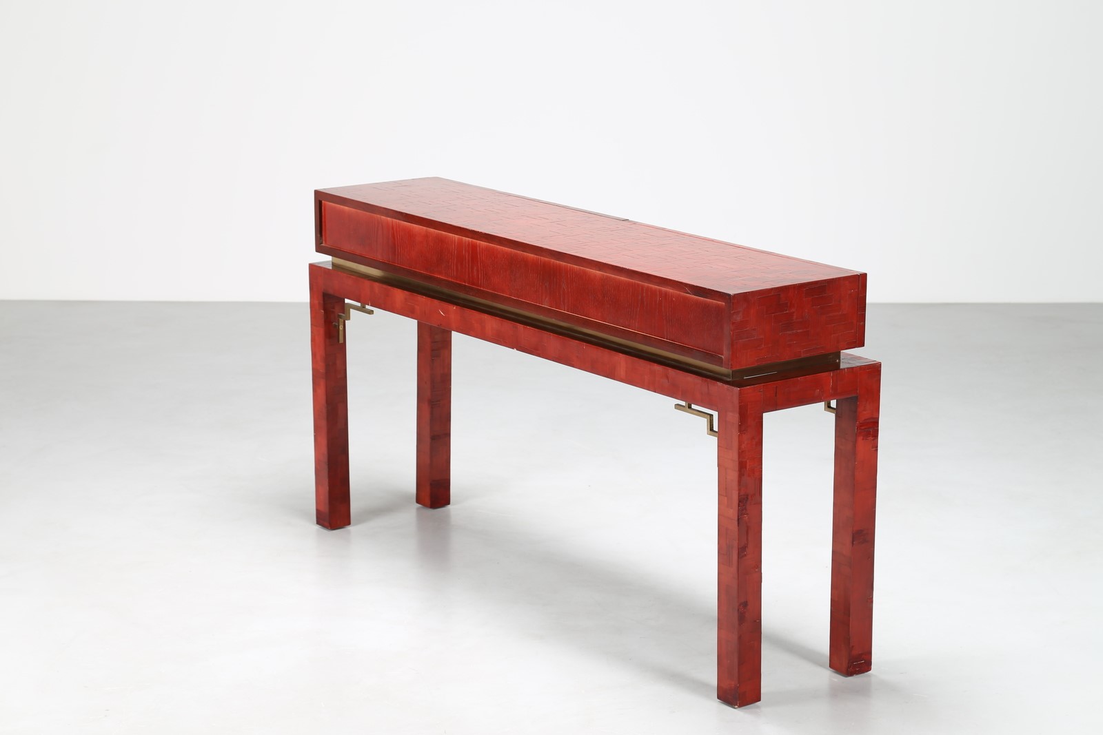 PETTI SANDRO Consolle con impiallicciatura a cesto in legno di banano laccato rosso per ANGOLOMETALART Roma, anni 70°. -. Cm 157,50 x 83,50 x 37,50.