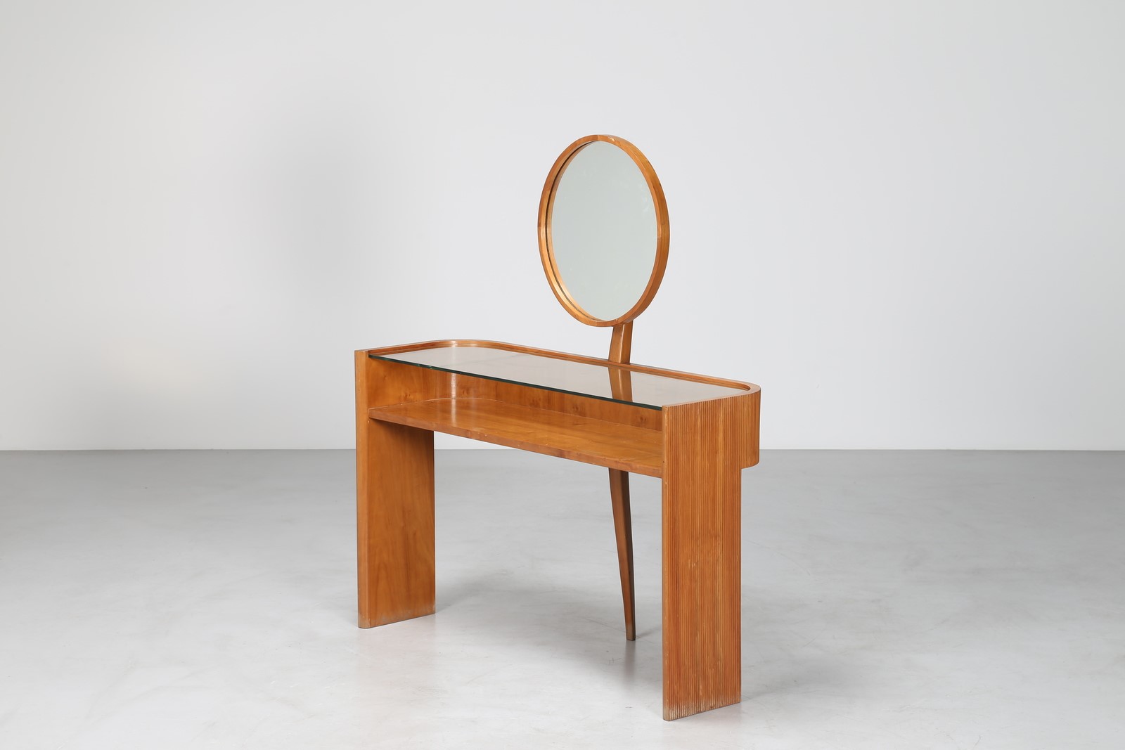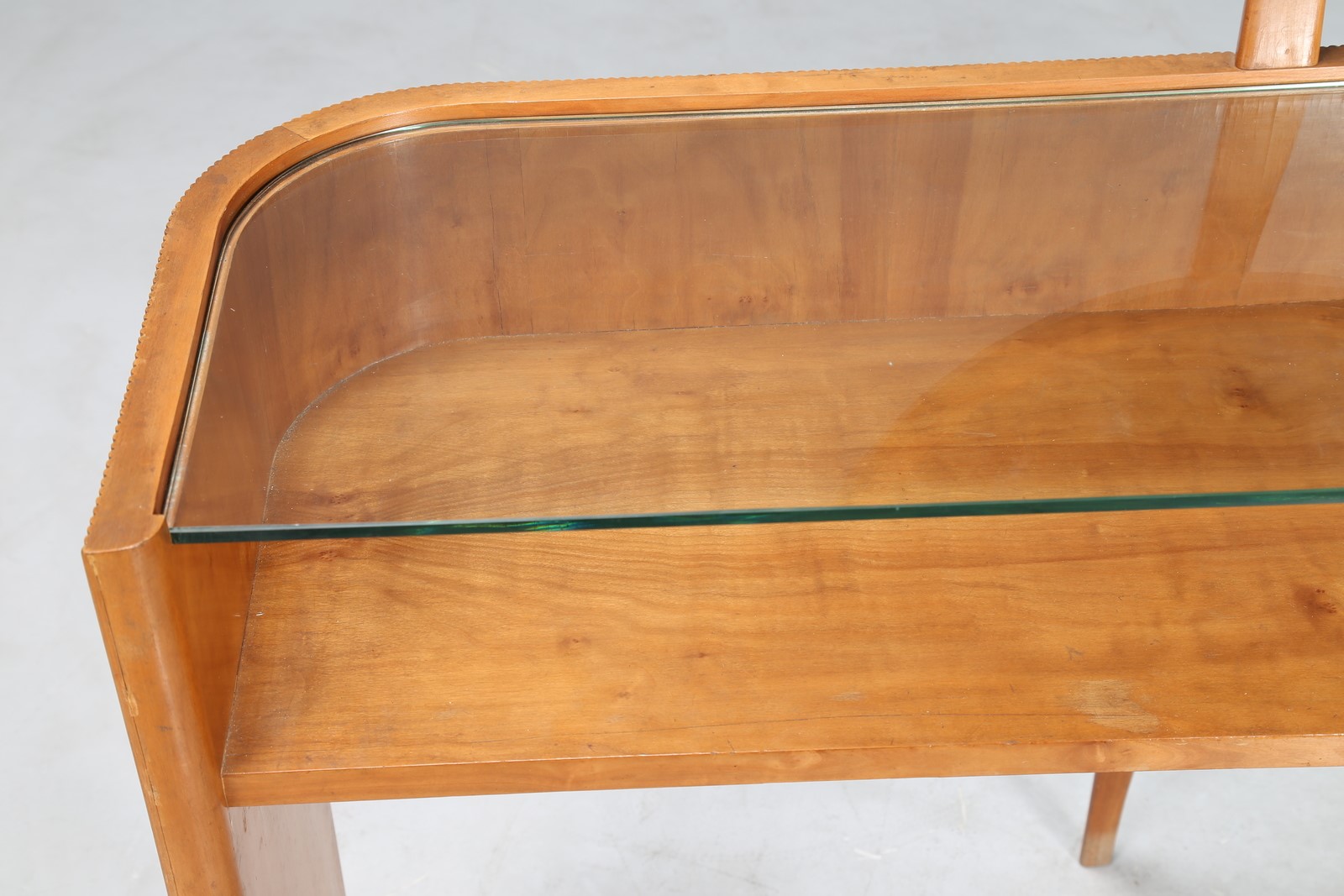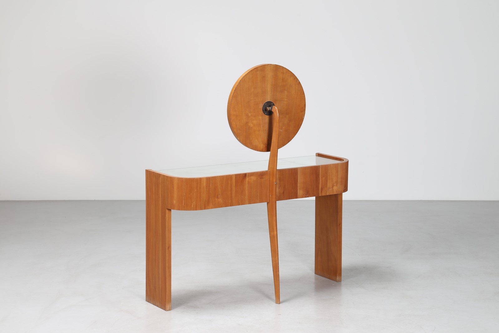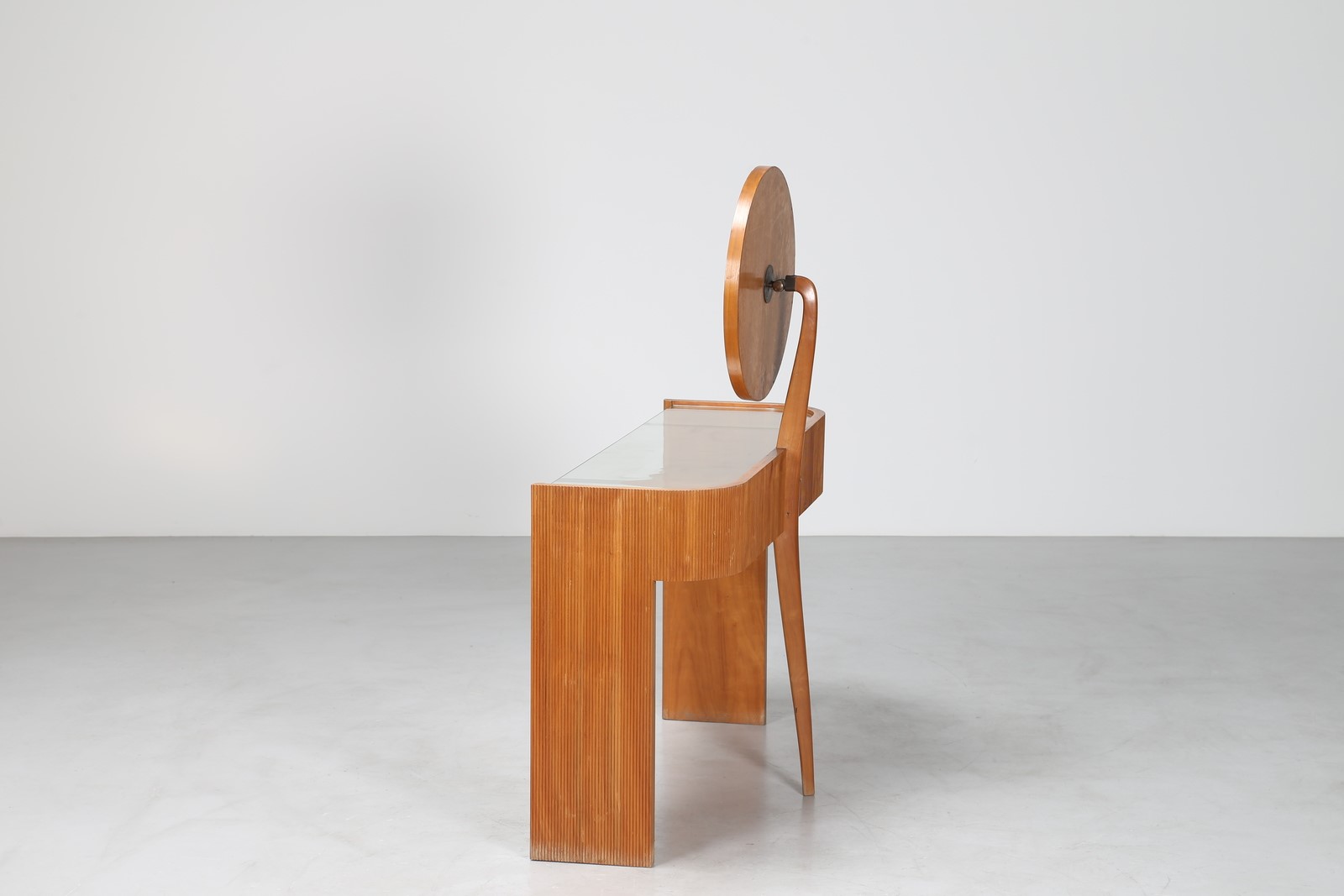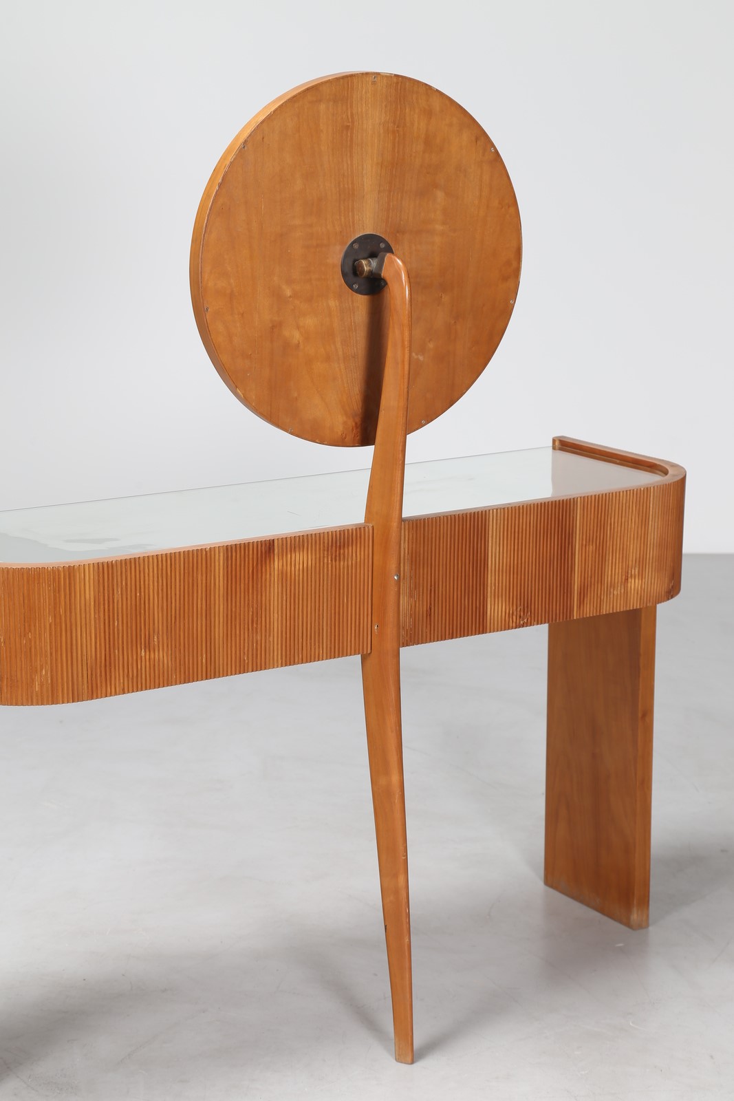 SCREMIN LUIGI (1896 - 1983) Toeletta grissinata in noce nazionale biondo con elementi in ottone e piano in cristallo, per Fratelli Scremin Belluno, anni 30. -. Cm 120,50 x 136,50 x 44,00.